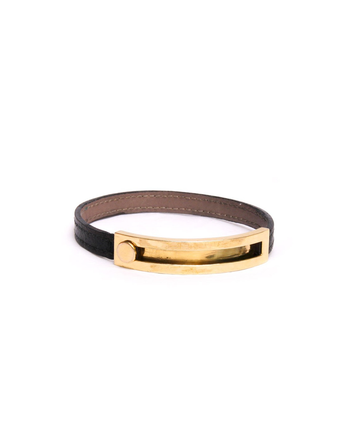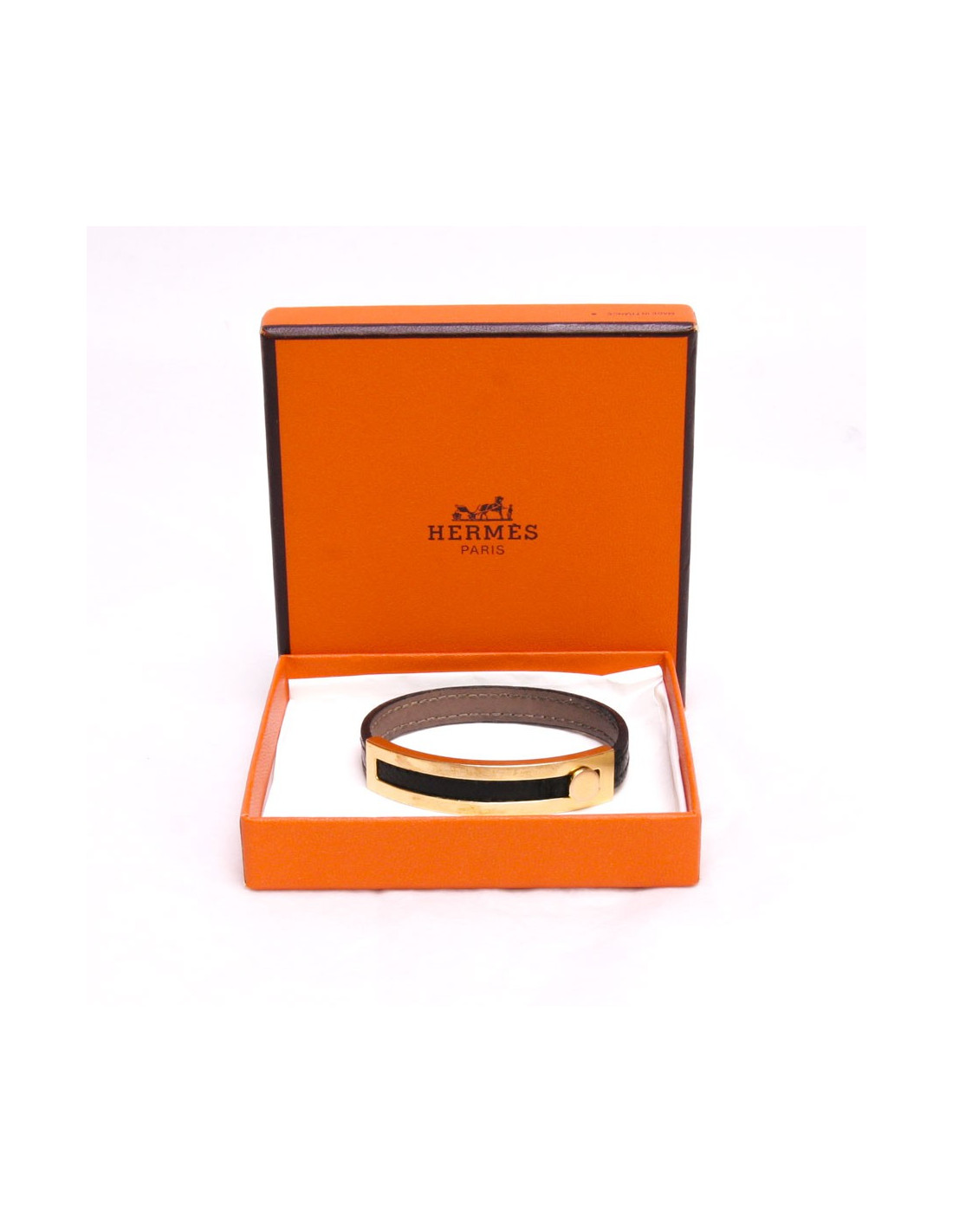 Bracelet Hermès cuir, Coulisse, en cuir de veau Chamonix marron et or jaune 18 carats. Il y a un poussoir coulissant qui permet d'ajuster le bracelet de 19 cm à 23 cm. la hauteur : 0.9 cm. Il est en très bon état.
