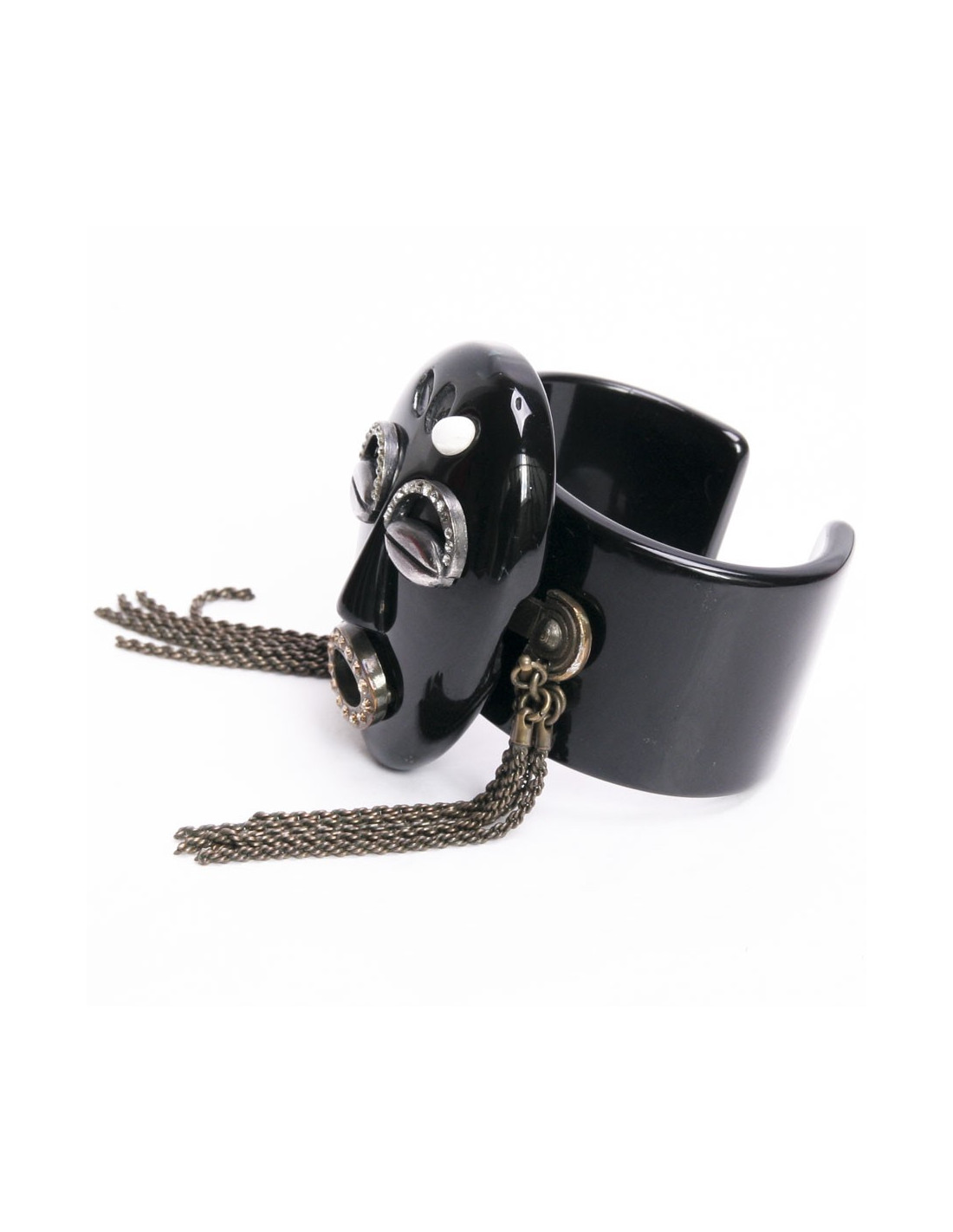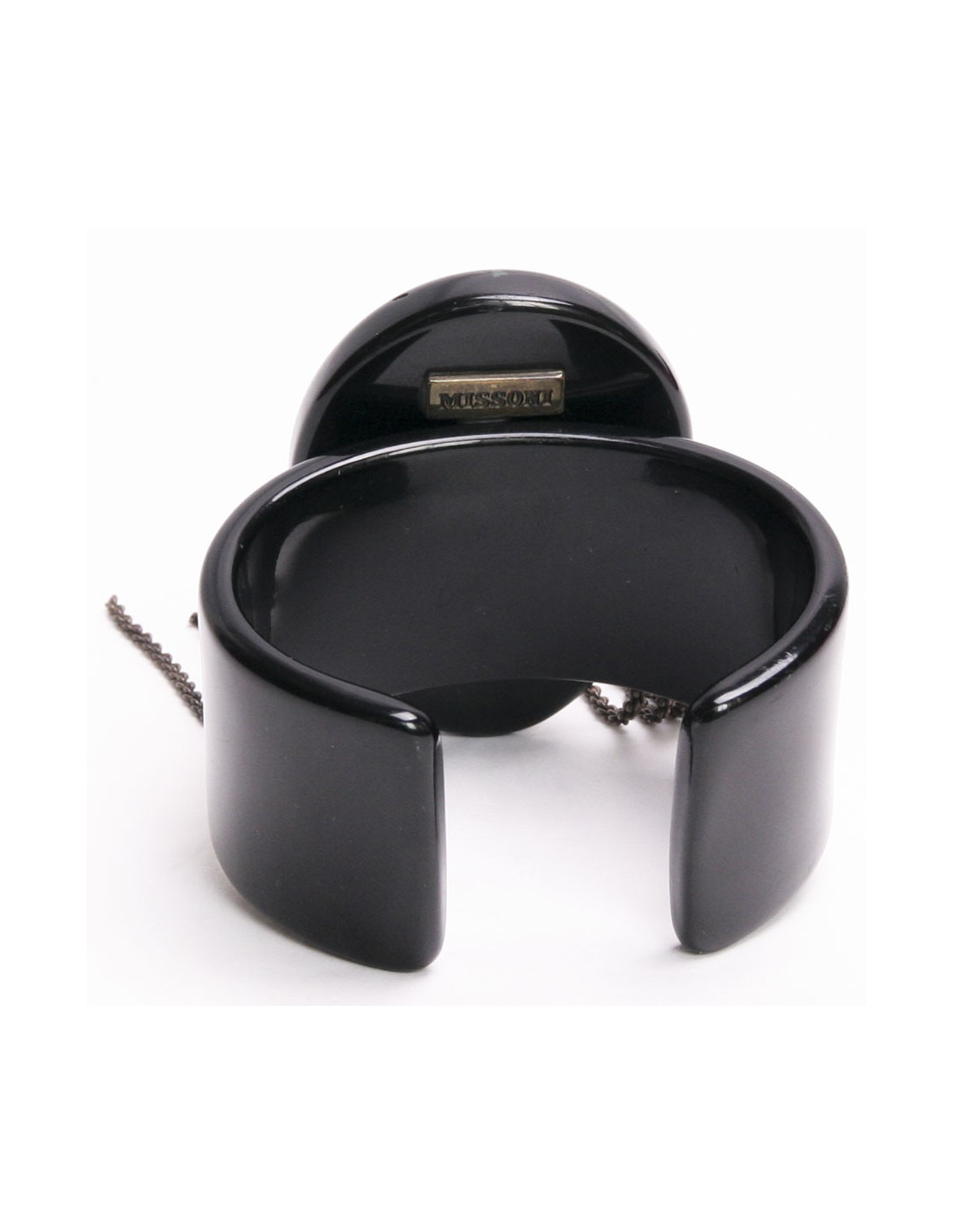 Jolie manchette Missoni, en résine noire, avec masque africain. Elle est en bon état (manque 2 perles) Possibilité de renvoyer le bijou à la marque pour réparation.