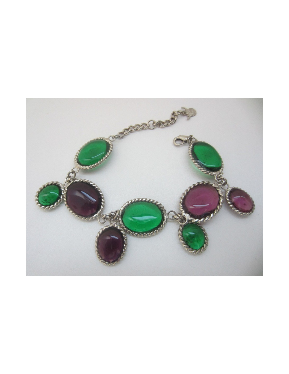 Magnifique bracelet "Gouttes d'eau" de la Maison Marguerite de Valois, en métal argenté et pâte de verre améthyste & vert bouteille.
