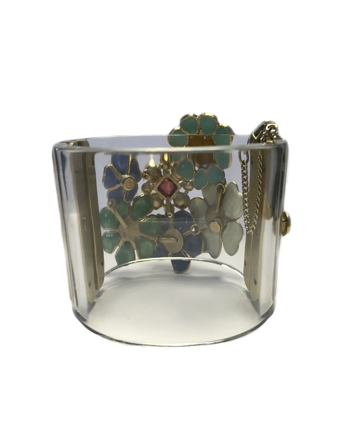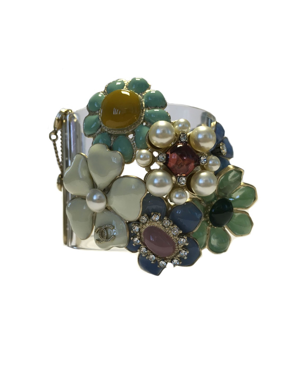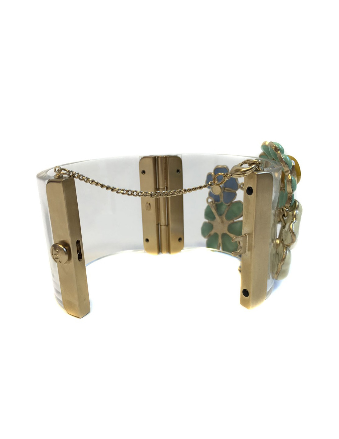 Pièce superbe! Manchette Collector CHANEL transparente ornée de fleurettes en pâte de verre de multiples couleurs (parme, jade, bleu, vert, écru, grenat,...), de strass de Swarovski et d'un CC martelé en métal or pâle. Fermoir poussoir orné d'un CC en métal or pâle. Petite chaînette de sûreté. Vignette Chanel présente, collection Printemps 2014.