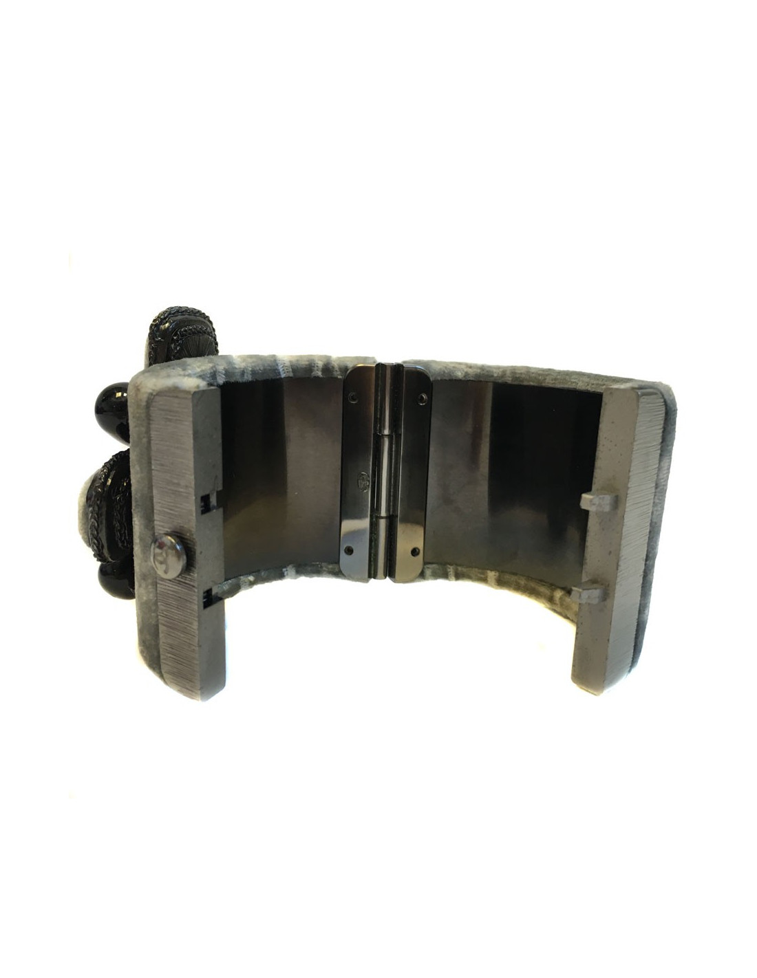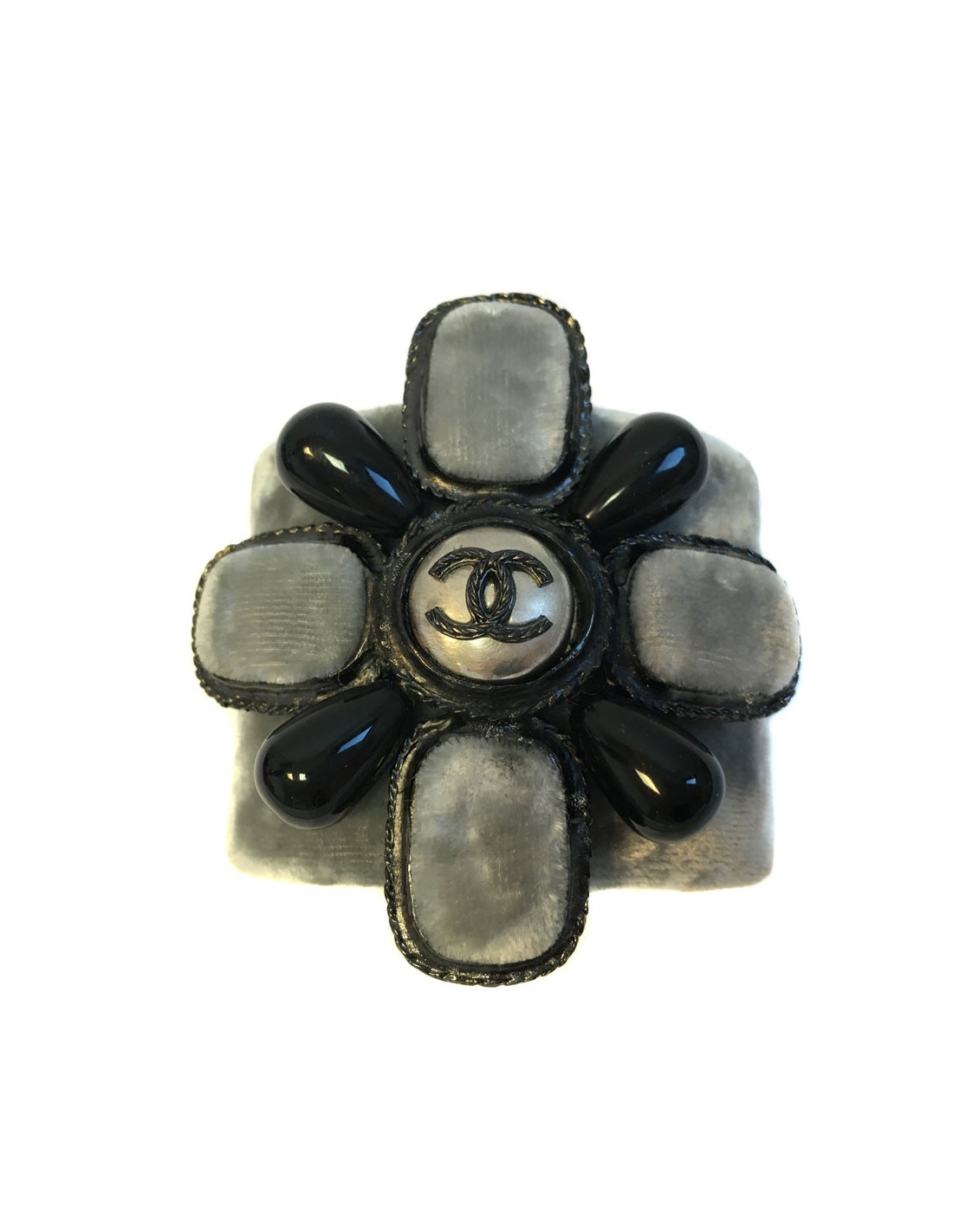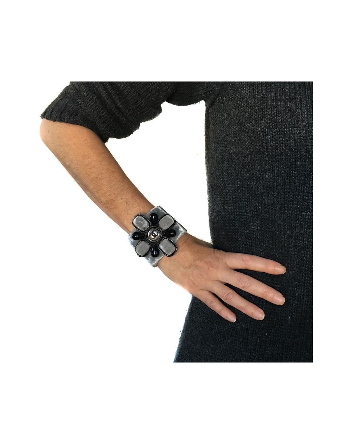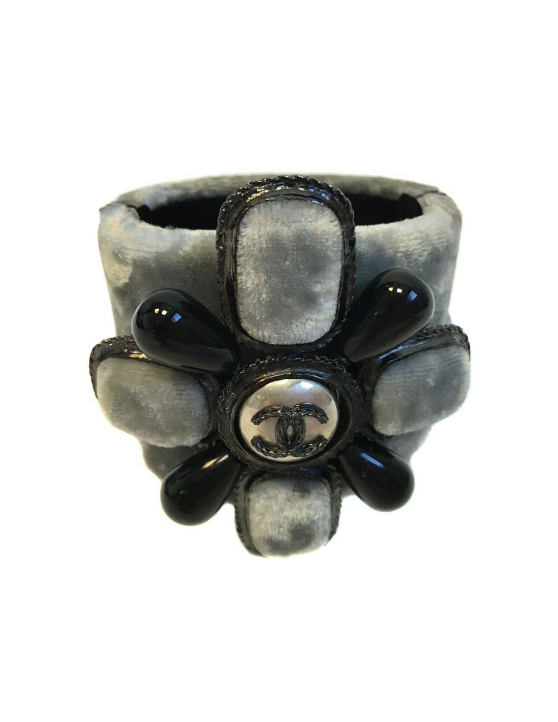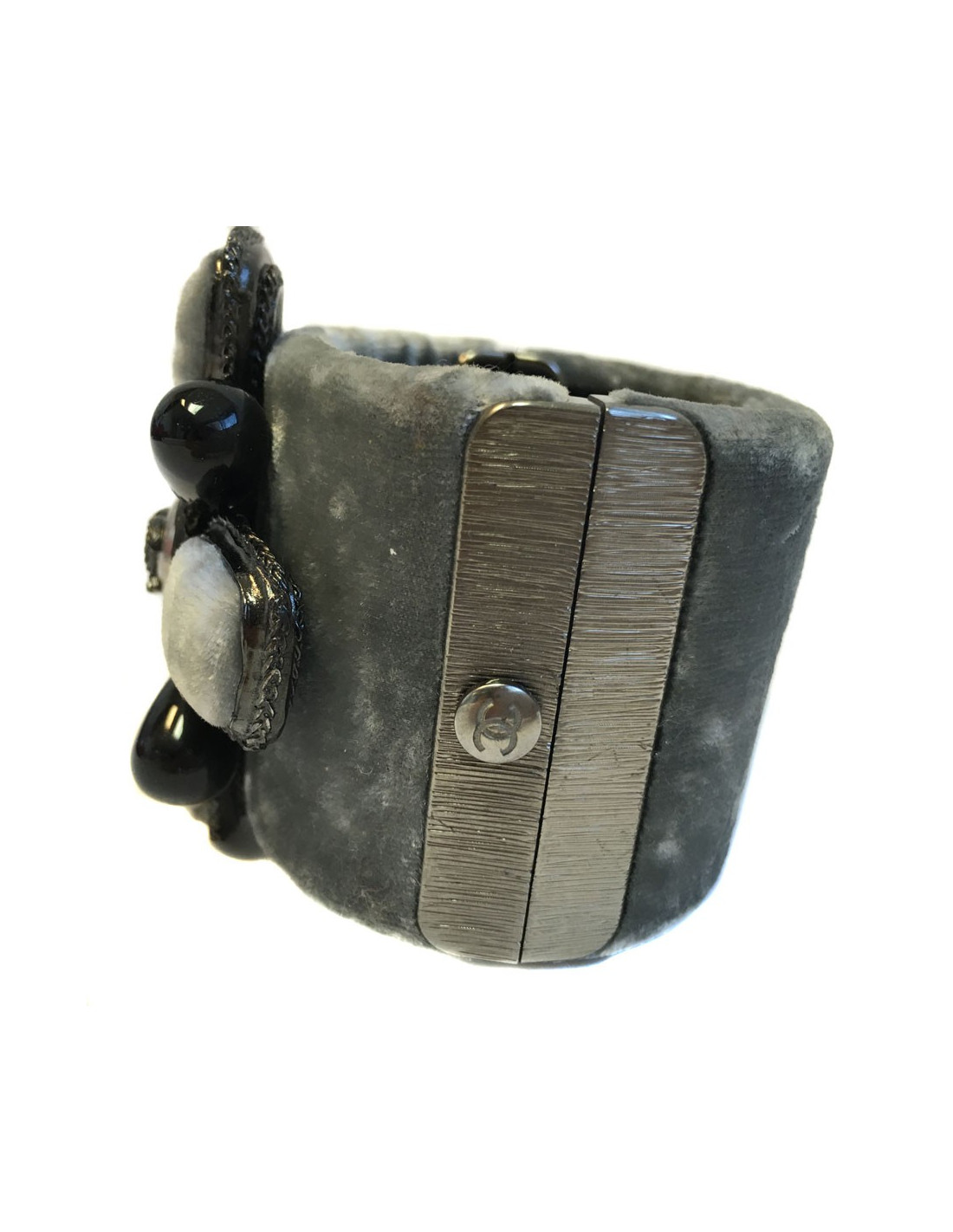 Magnifique manchette CHANEL en panne de velours gris et pâte de verre noire. Manchette en ruthénium.