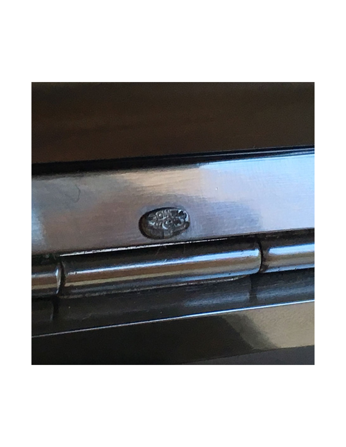 L'articulation est en métal argenté brossé. Un CC en ruthénium tressé se trouve au centre du bracelet apposé sur une pièce ronde en métal argenté. Le fermoir est un poussoir orné d'un CC.
