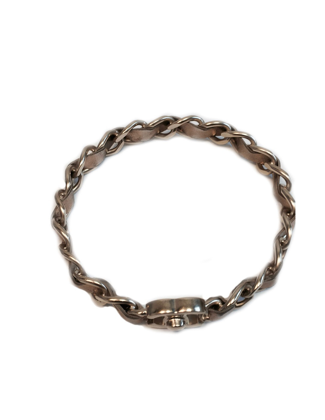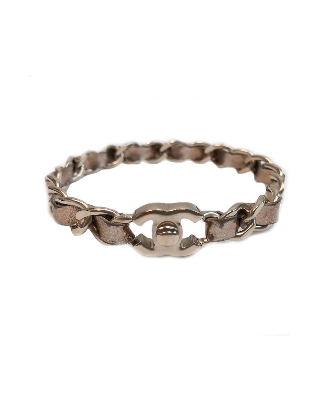 Très beau bracelet CHANEL rigide en maille dorée entrelacée d'un ruban en cuir doré. CC en métal doré. Taille M