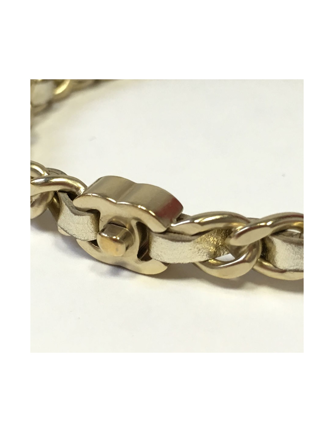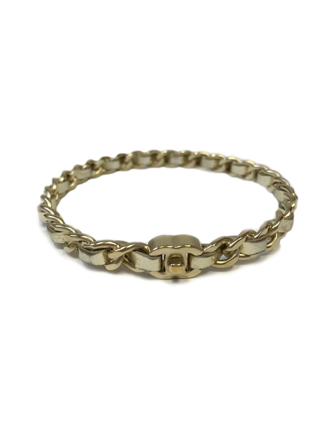 Très beau bracelet GM CHANEL rigide en maille dorée entrelacée d'un ruban en cuir argenté. CC en métal doré. Taille M. Collection croisière 2015.