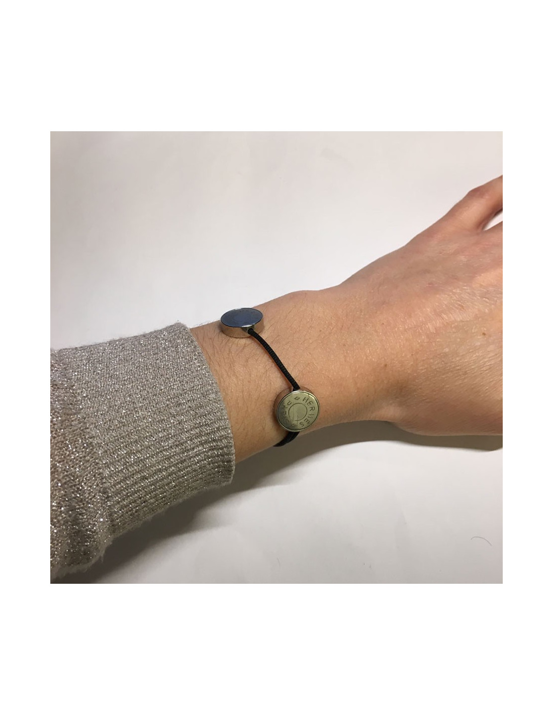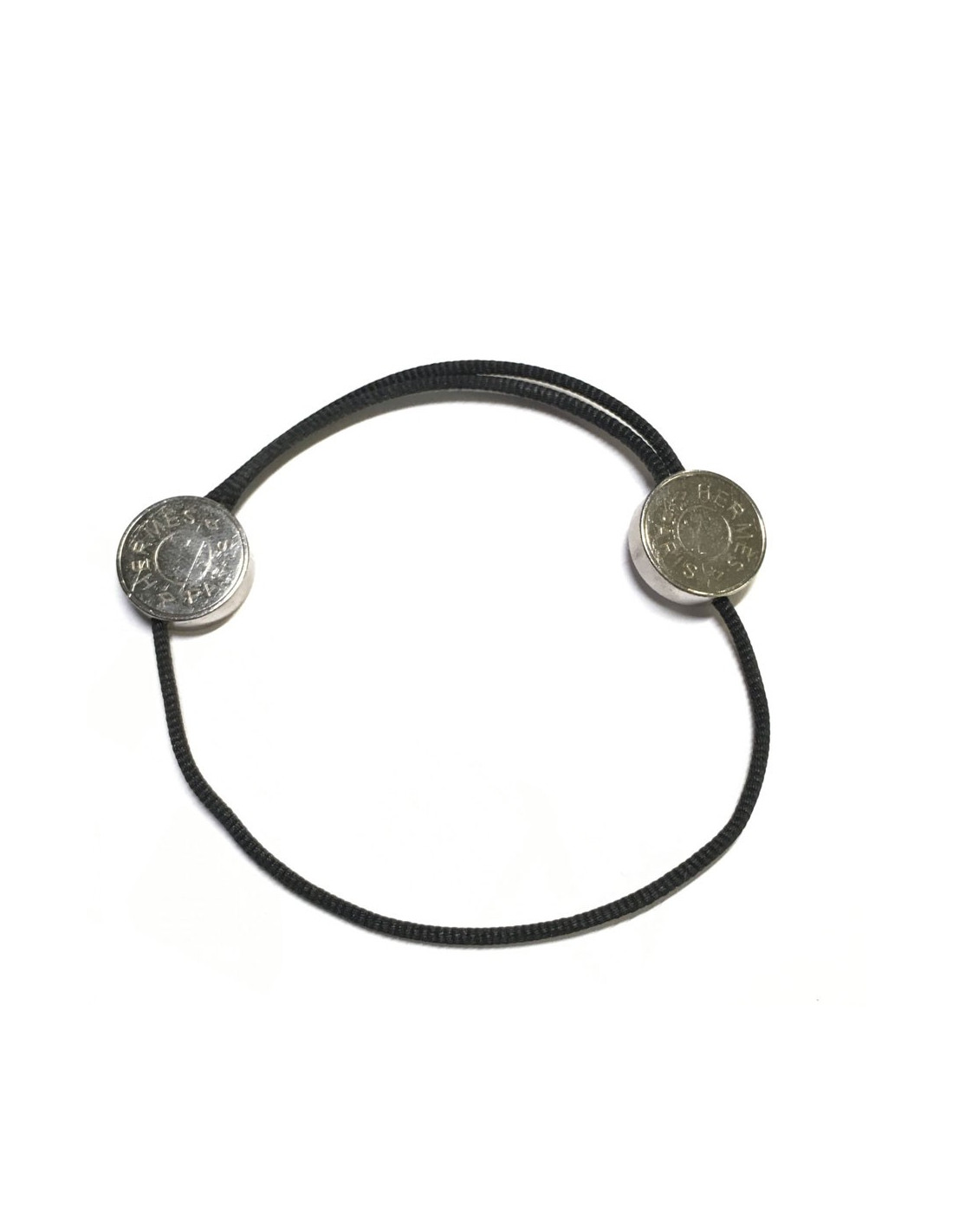 Bracelet HERMES corde noir et argenté. HERMES gravé sur les 2 pastilles argentées. Cordon noir réglable. En très bon état. Quelques micros rayures sur les pastilles.