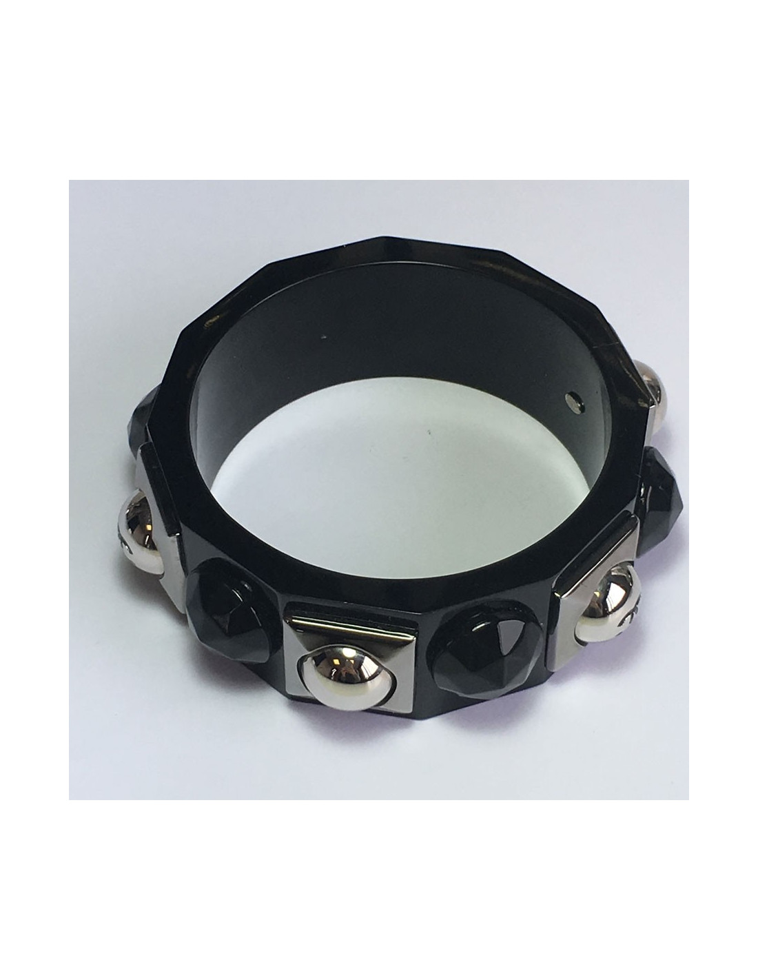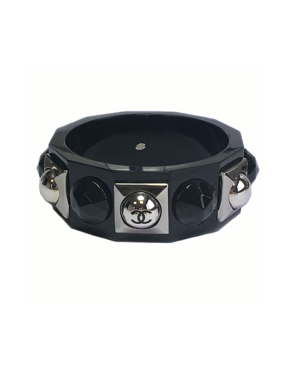 Bracelet CHANEL en plexi noir et métal argenté. CC gravé sur la bijouterie argentée. bijouterie en plexi facettée façon pierre. Pastille de la marque présente. Collection printemps 2009.
