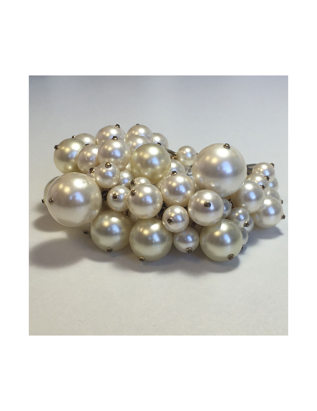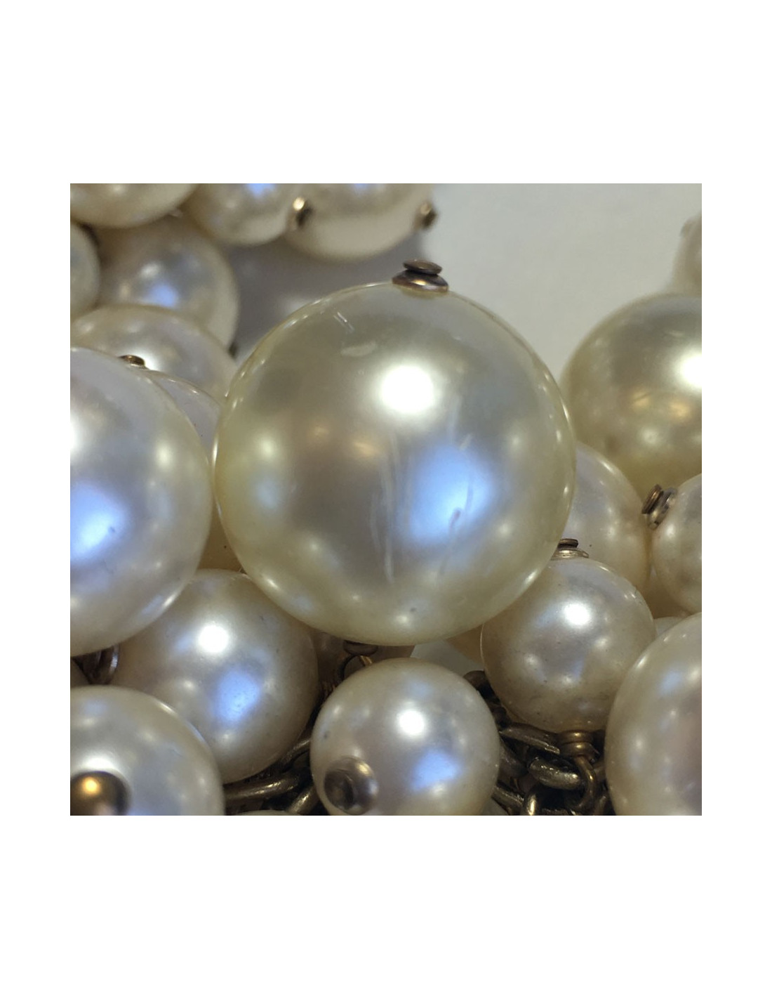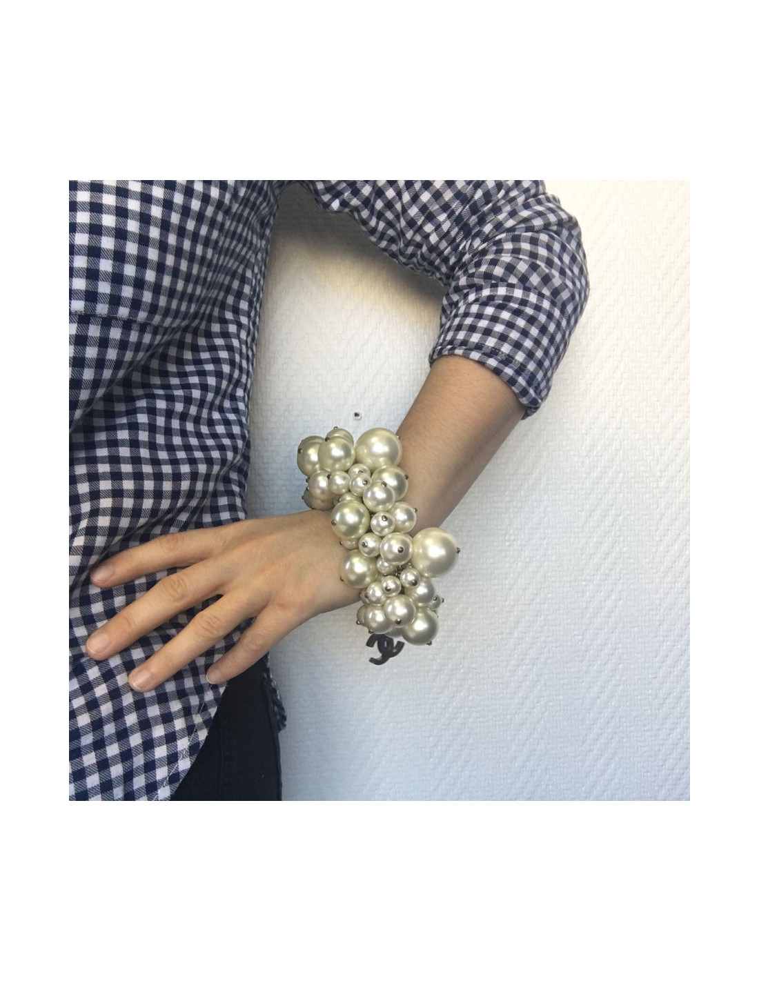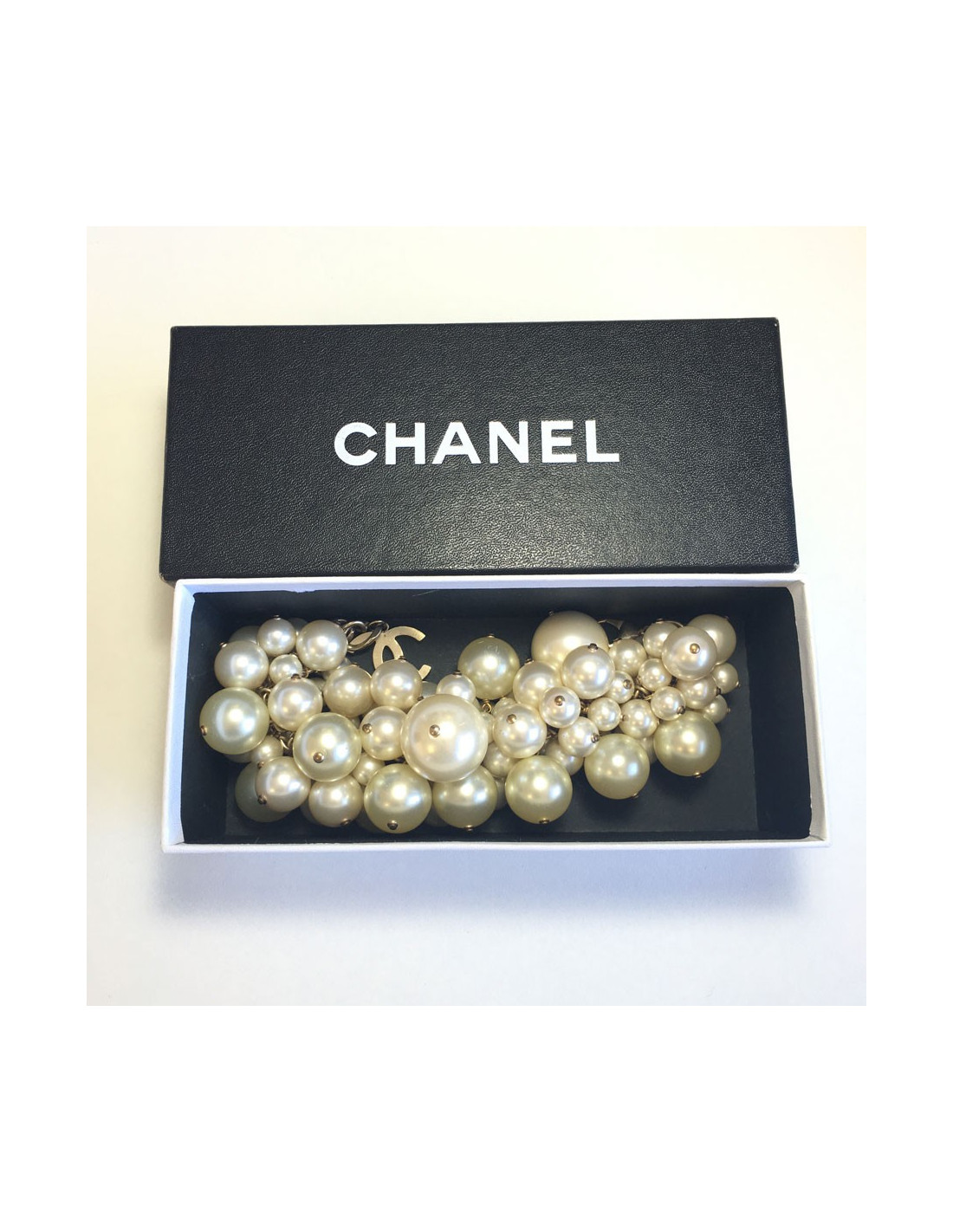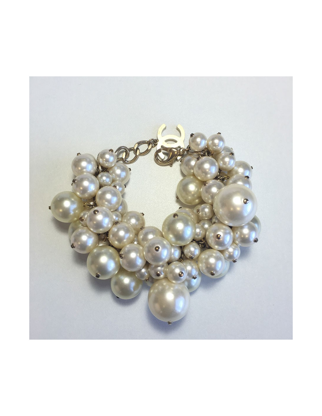 Magnifique et imposant bracelet CHANEL en grosses, moyennes et petites perles nacrées. Chaine en métal doré se terminant par un CC. En très bon état. Quelques rayures sur certaines perles dues à l'usage.