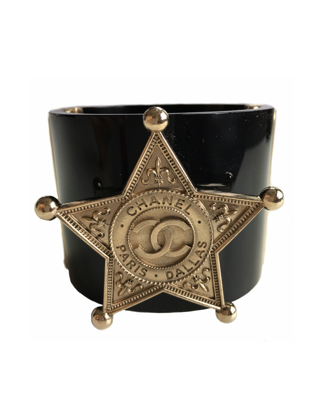 Superbe manchette CHANEL "Paris-Dallas" en résine noire et bijouterie en métal doré. Une étoile de Sheriff sur le devant avec les inscriptions CHANEL - PARIS - DALLAS.