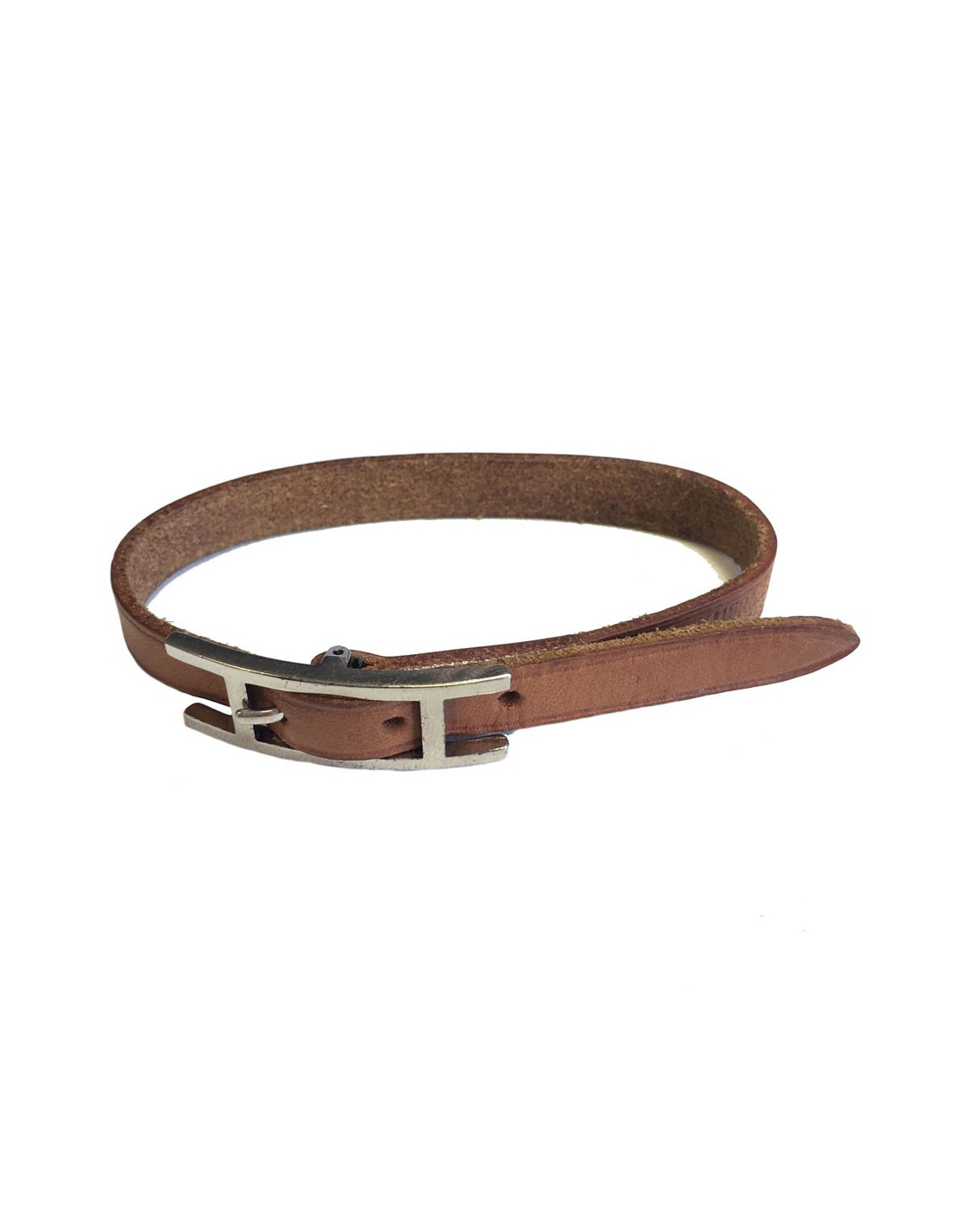 Bracelet HERMES HAPI en cuir naturel. Bijouterie argenté. En bon état. Traces d'usage au niveau des trous, tâches peu visibles sur le cuir (voir photos). Lettre G dans un carré.