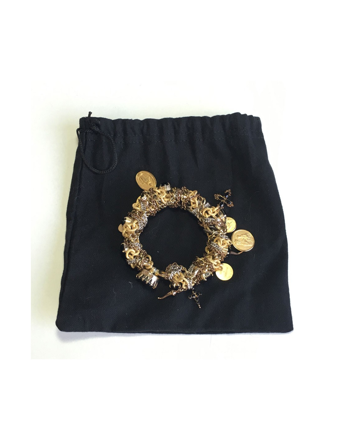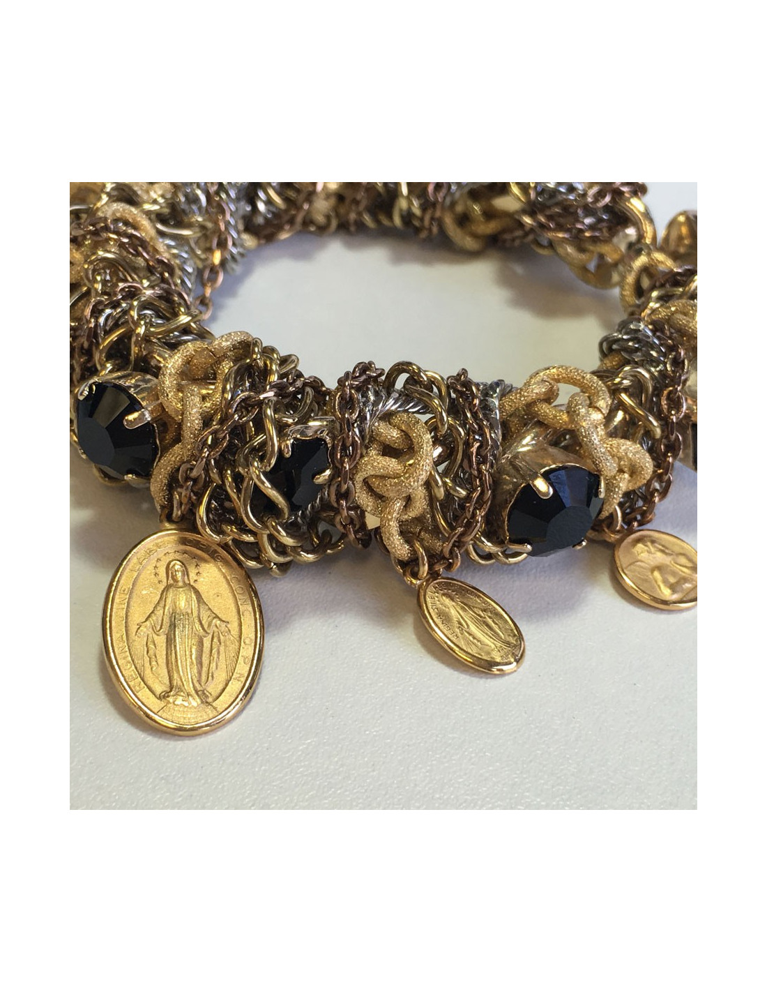 Superbe bracelet DOLCE & GABBANA en chaînes entrelacées, pierres noires facettées et breloques (croix, ange et la Sainte Marie en médaillons). Le tout en métal doré et argenté. Fermoir aimant.