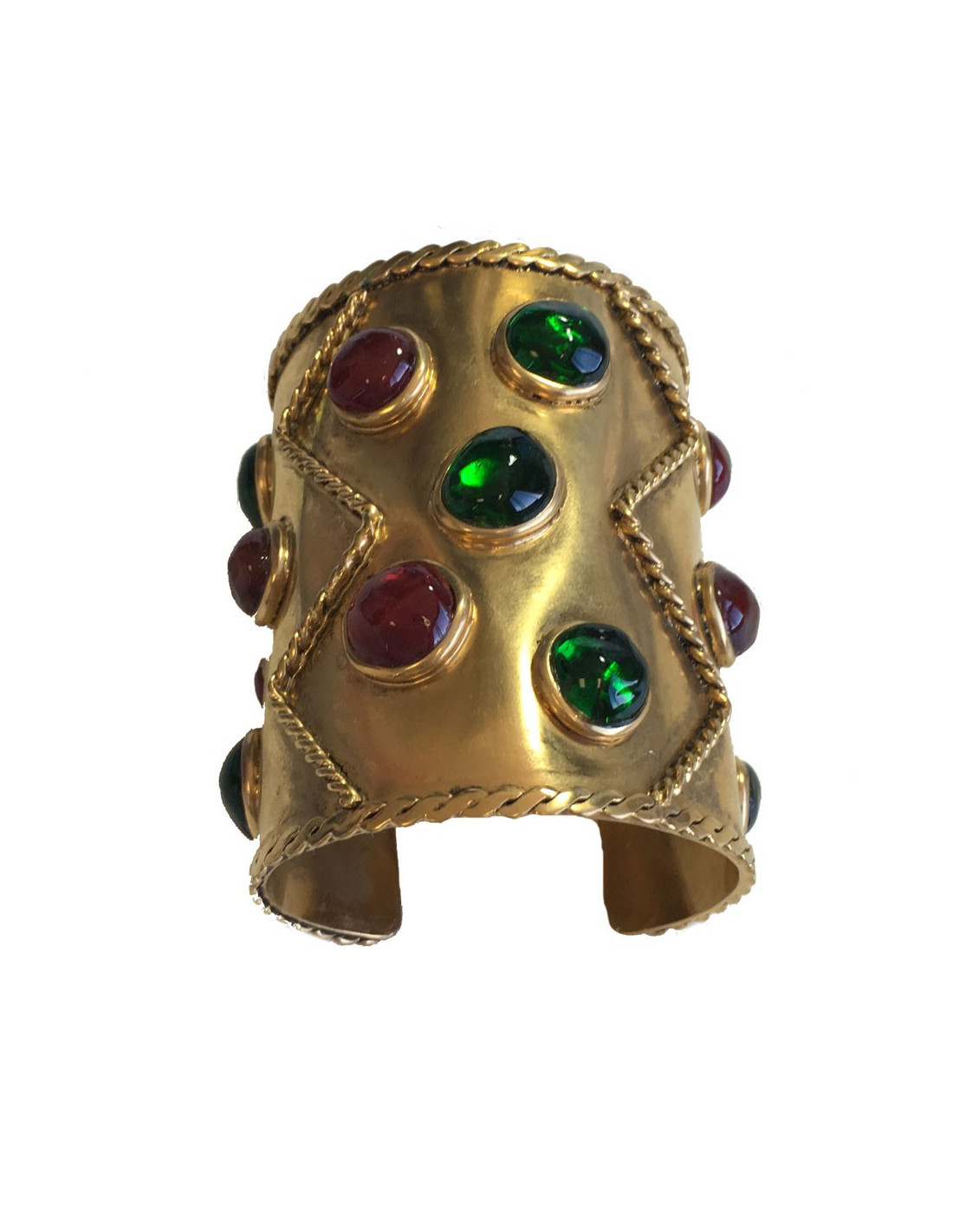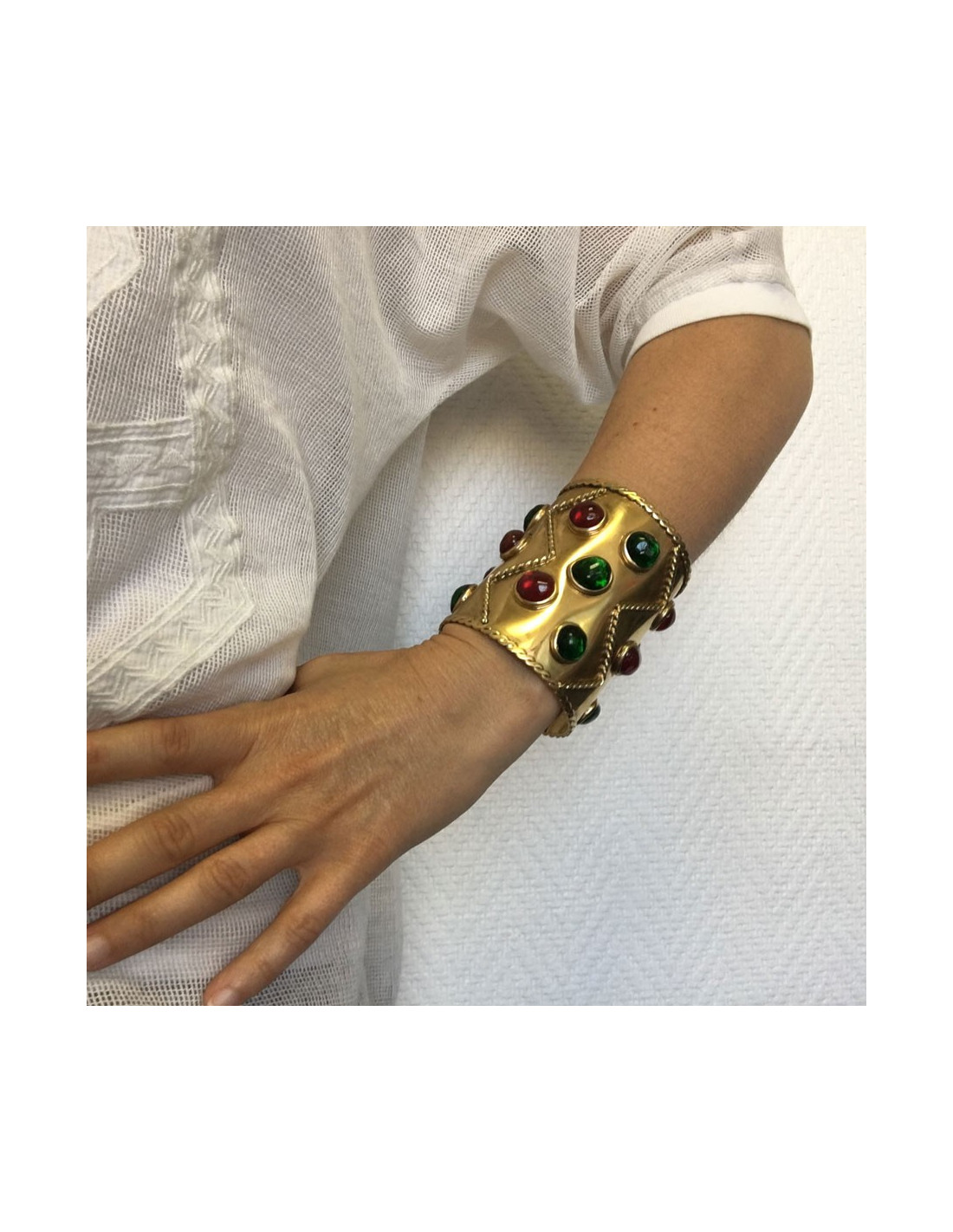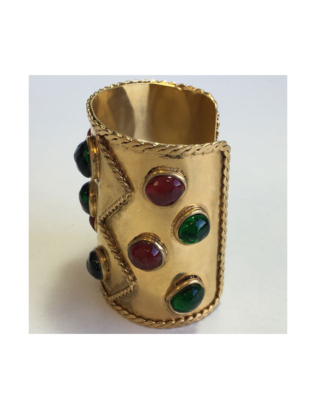 Manchette MARGUERITE de VALOIS en métal doré et pâte de verre couleur émeraude et grenat