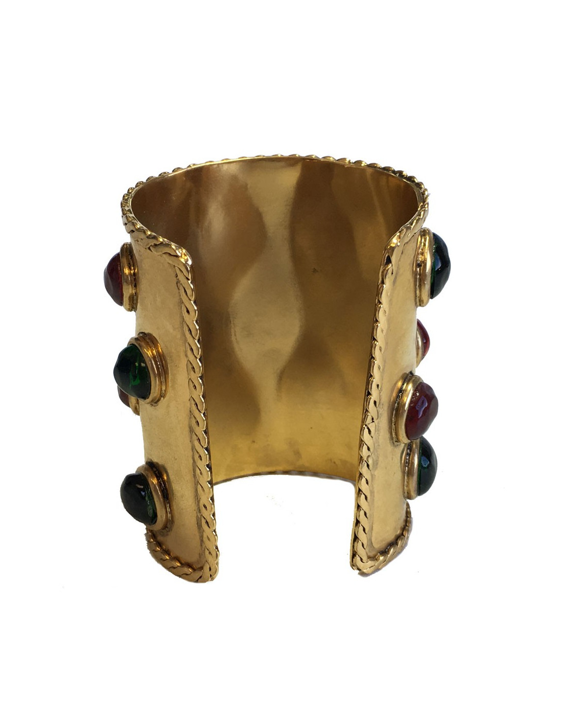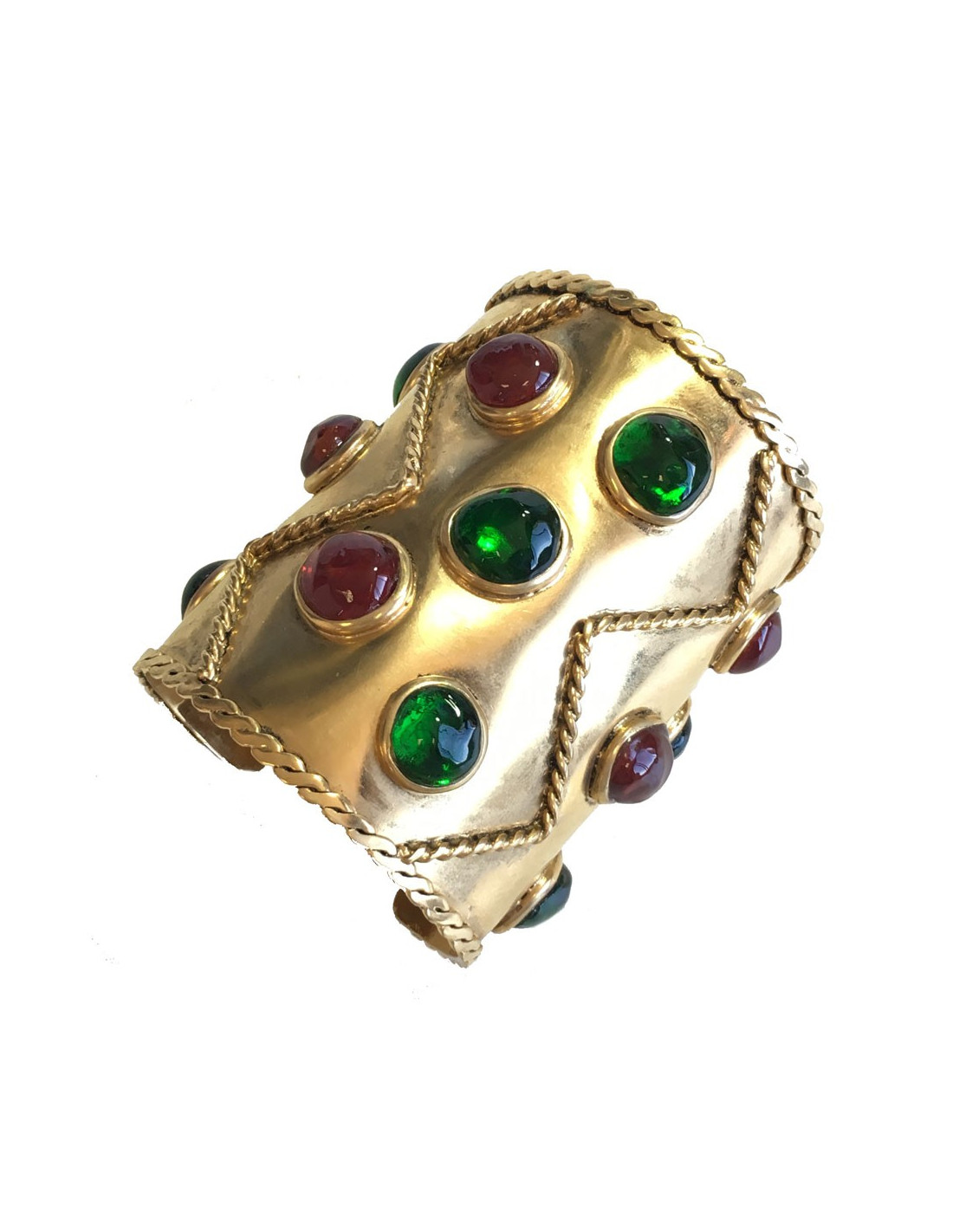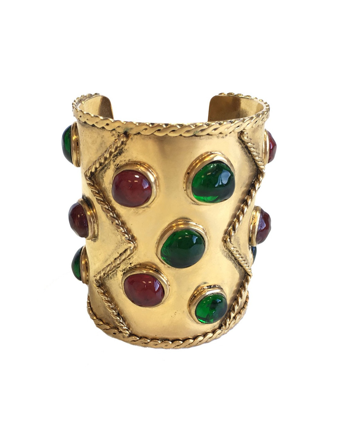 Manchette MARGUERITE de VALOIS en métal doré et pâte de verre couleur émeraude et grenat