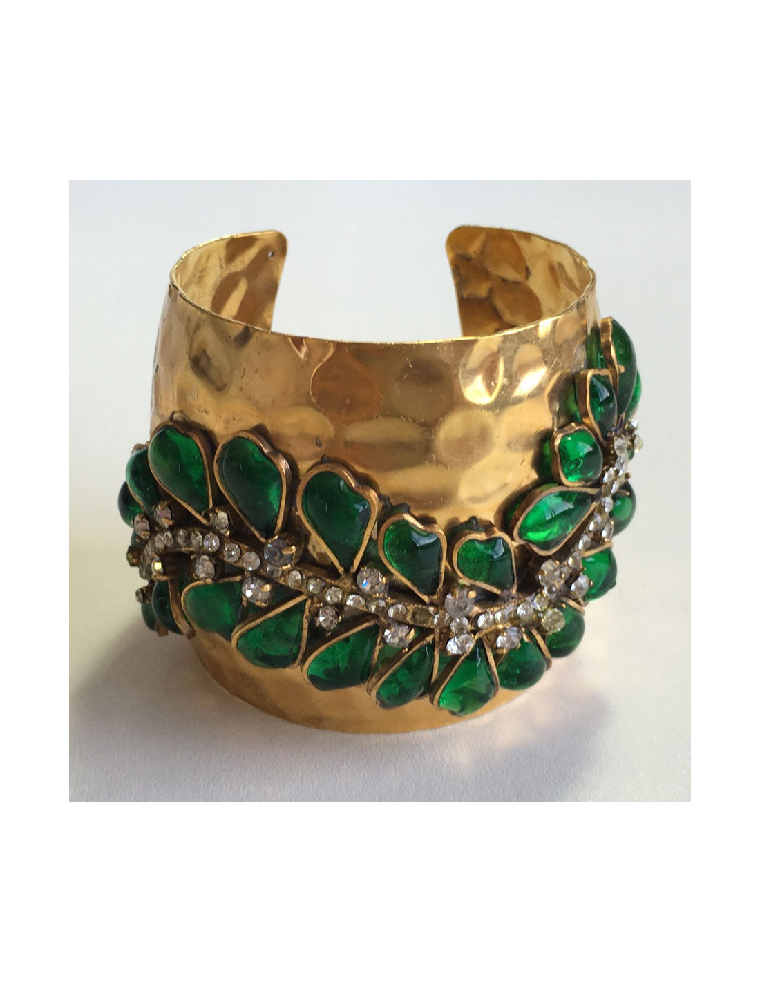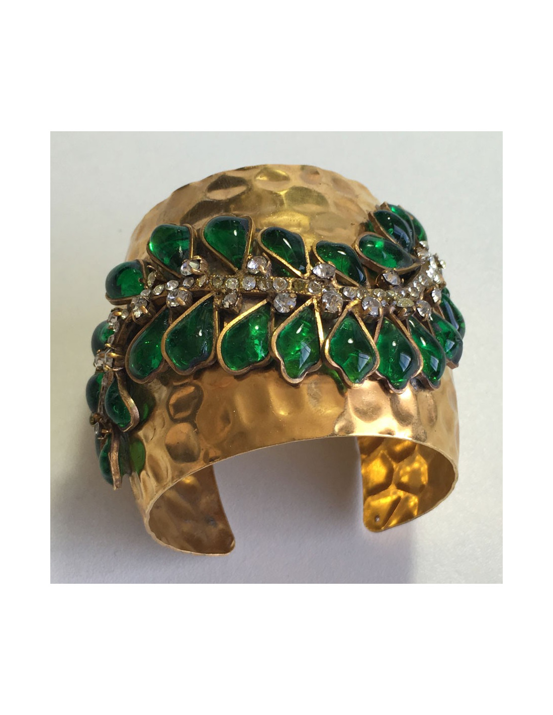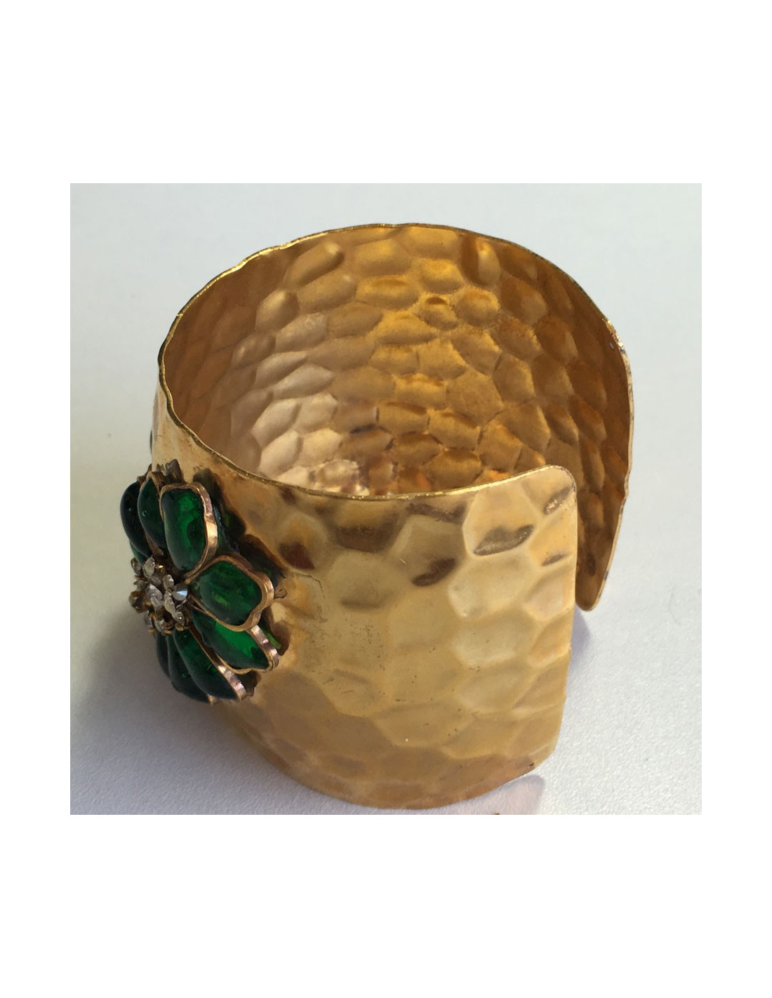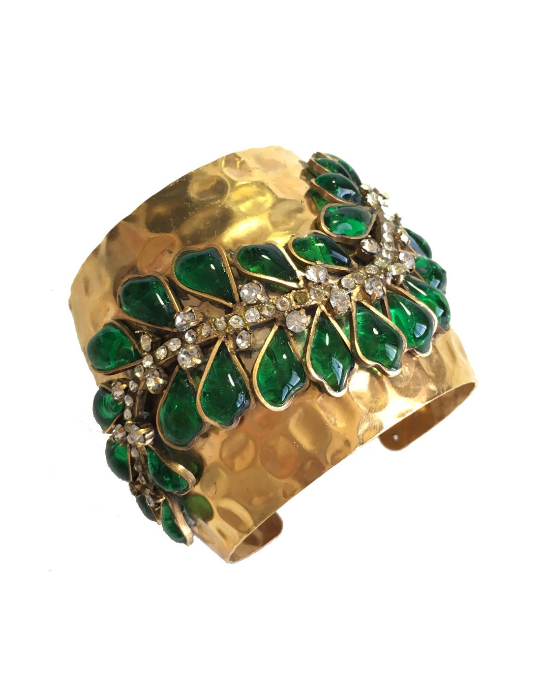 Manchette MARGUERITE de VALOIS en métal doré martelé, pâte de verre couleur émeraude et strass