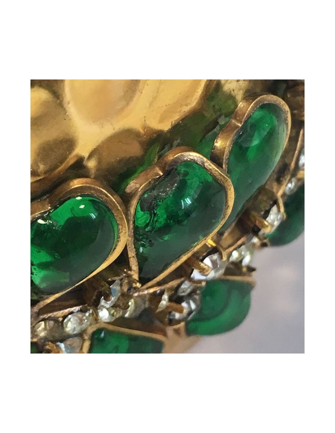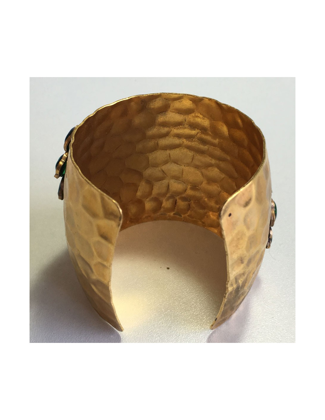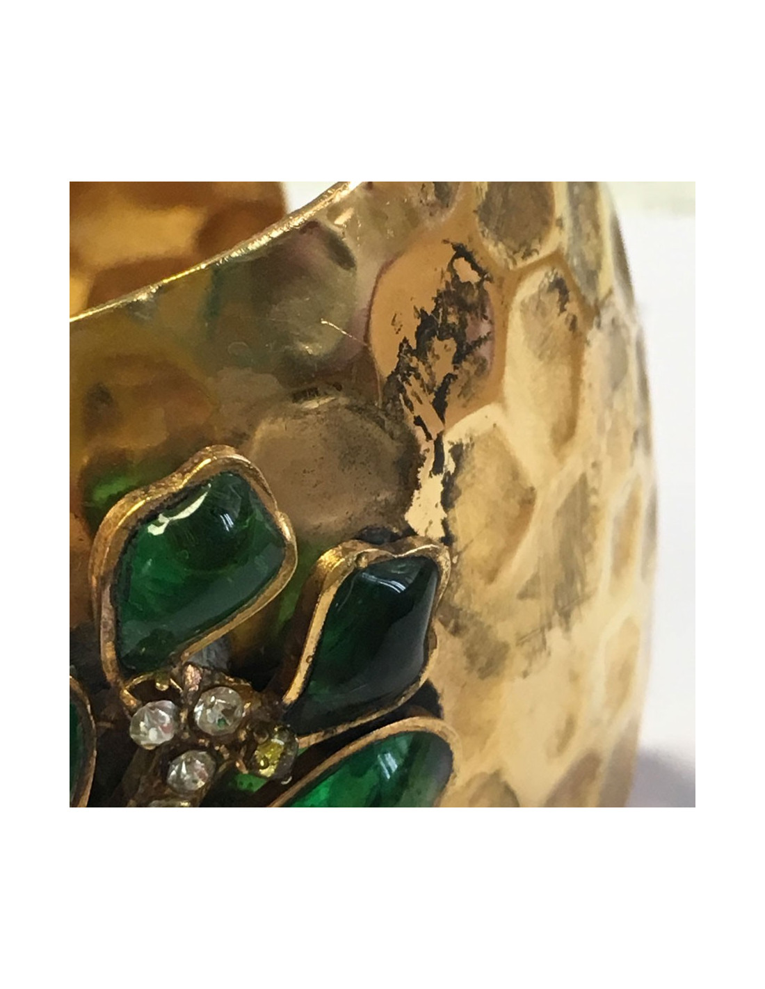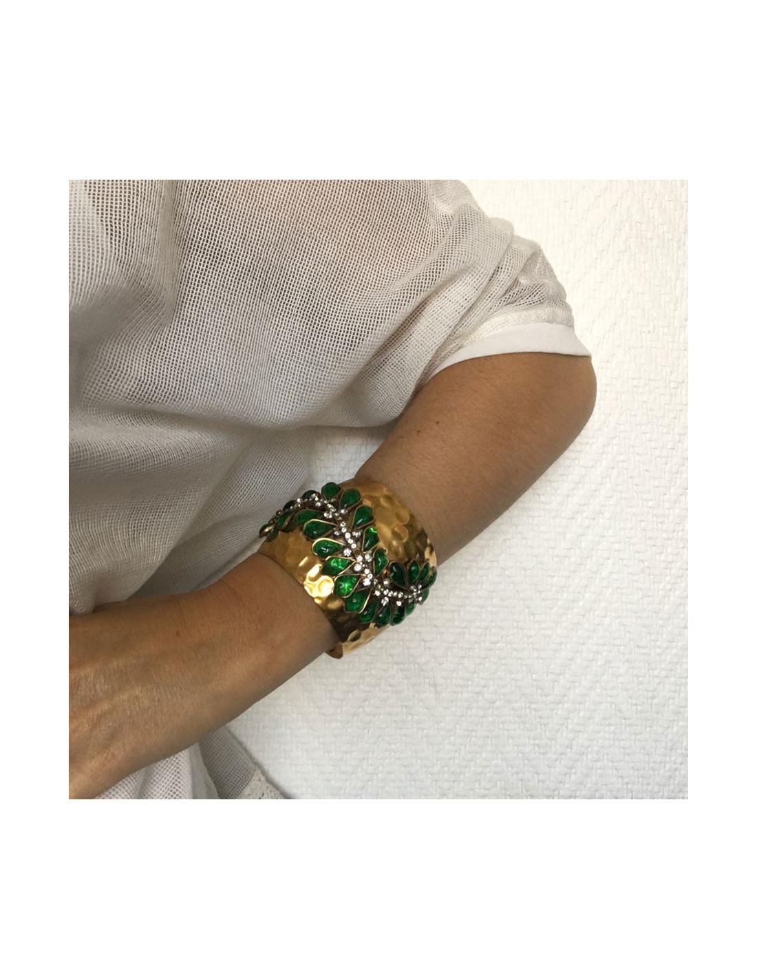 Manchette MARGUERITE de VALOIS en métal doré martelé, pâte de verre couleur émeraude et strass
