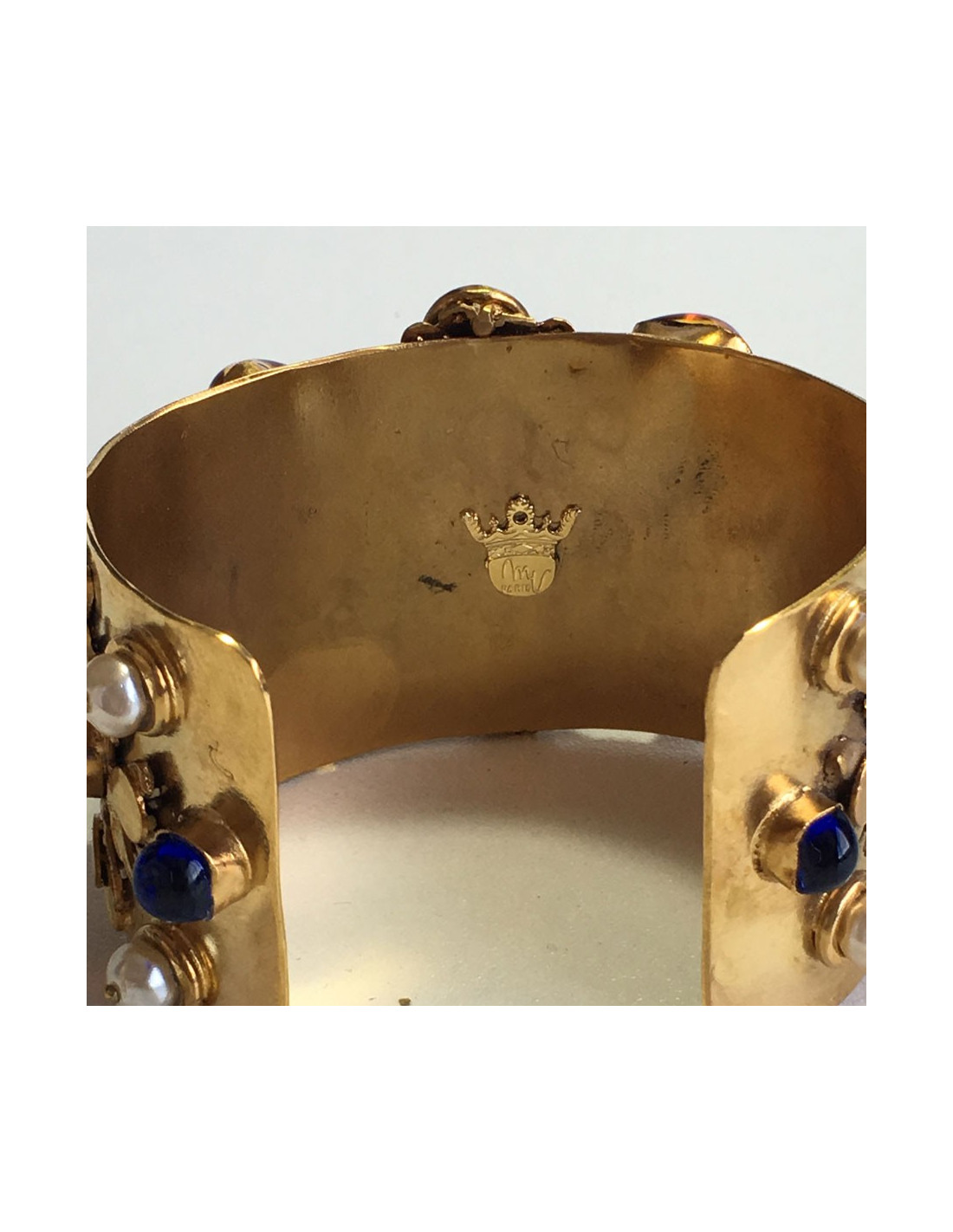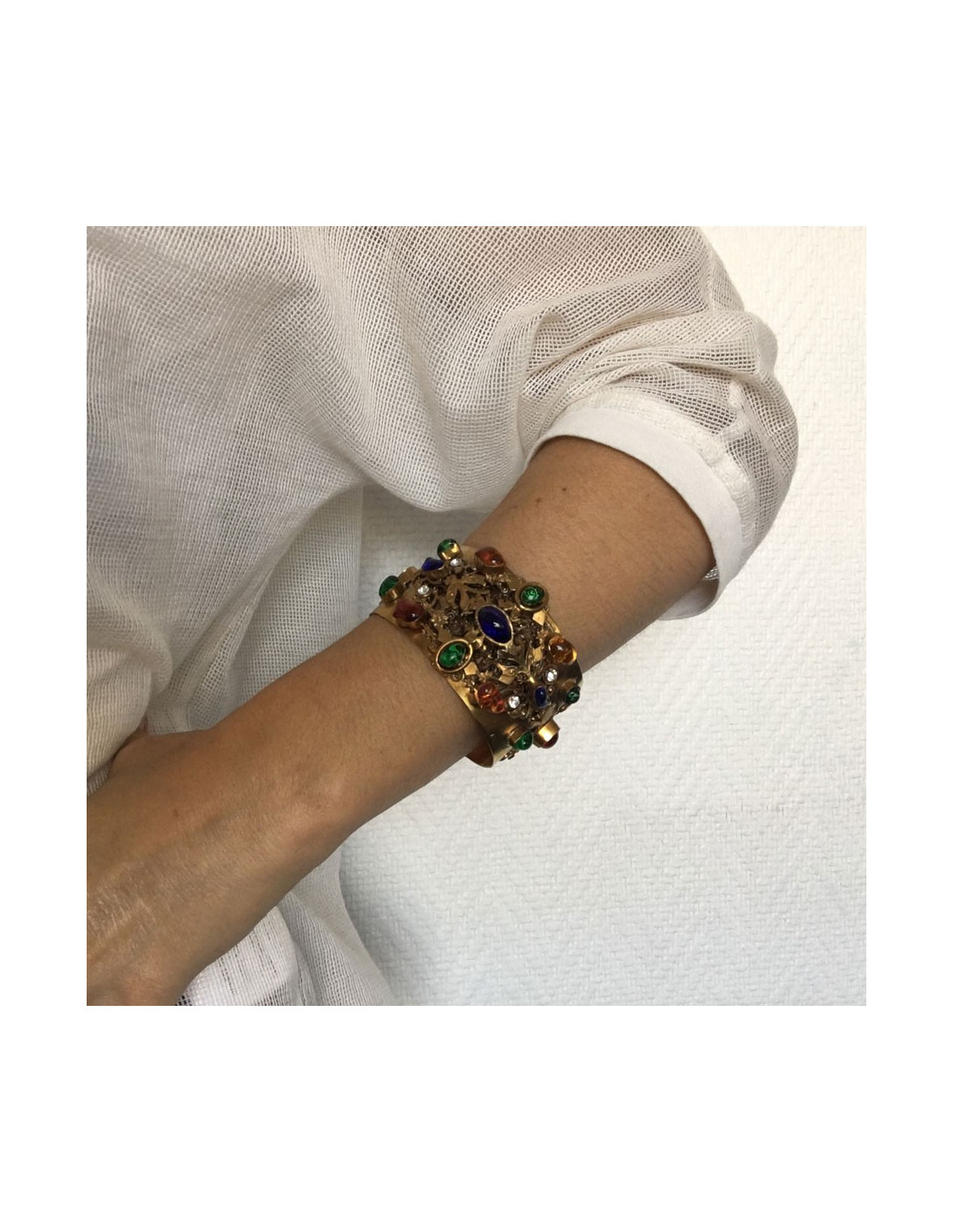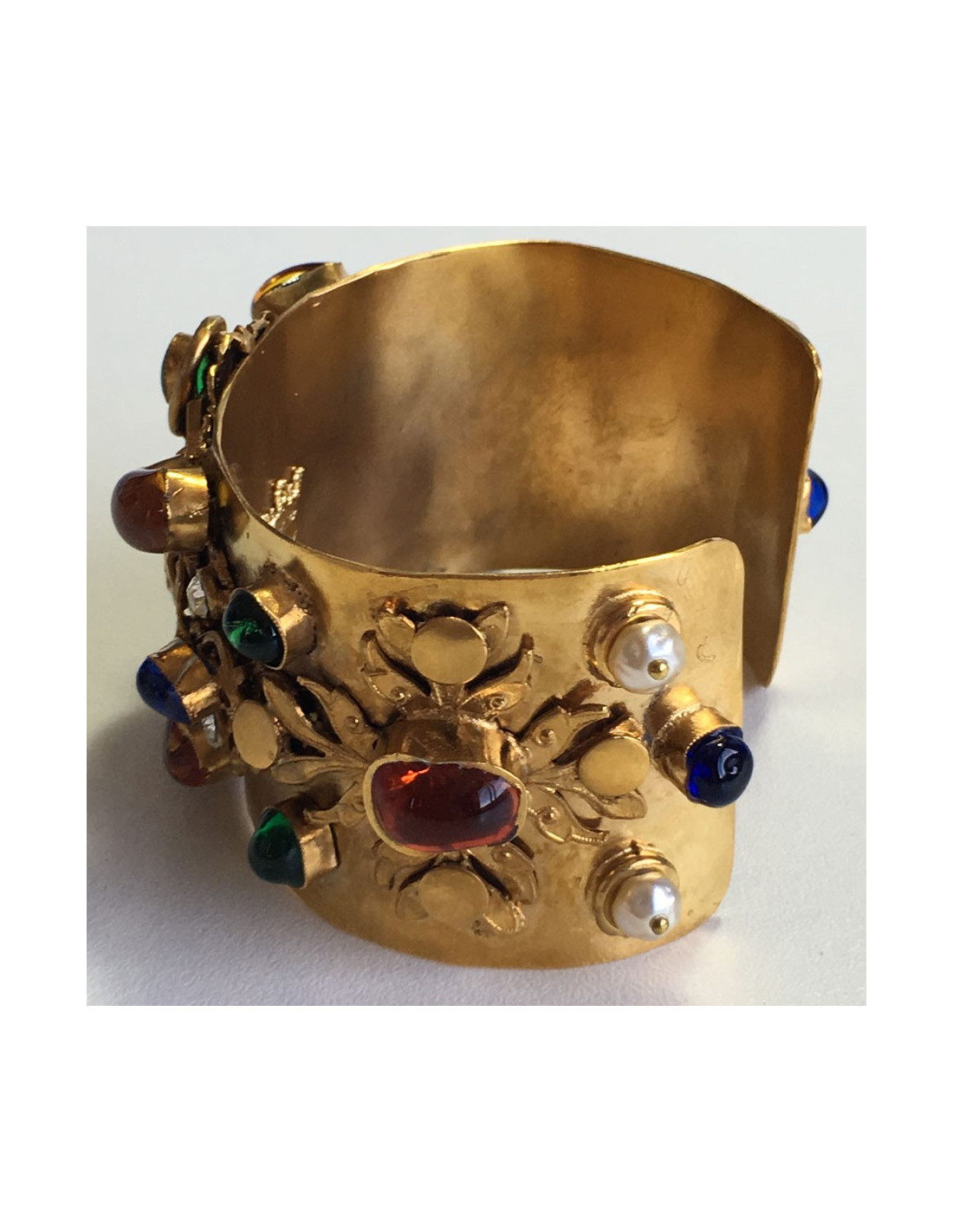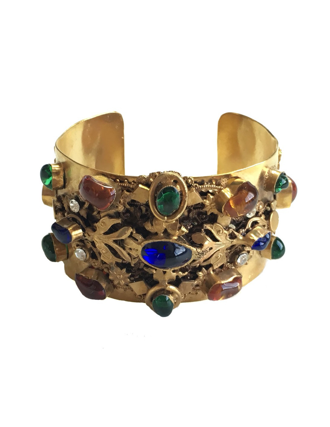 Belle manchette MARGUERITE DE VALOIS en métal doré travaillé, sertie de pâte de verre multicolore et de strass. En très bon état. Pastille de la marque à l'intérieur.