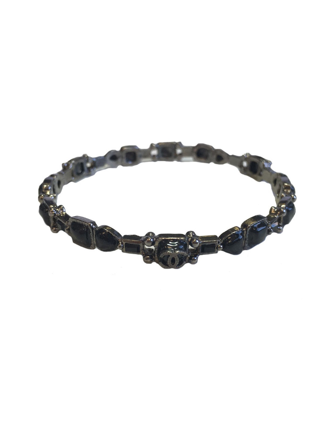 Bracelet Chanel en métal de couleur ruthénium (argent noir) et pâte de verre noir et gris mêlé, deux CC sur le bracelet. Probablement issu de la Collection Paris Bombay. État impeccable.