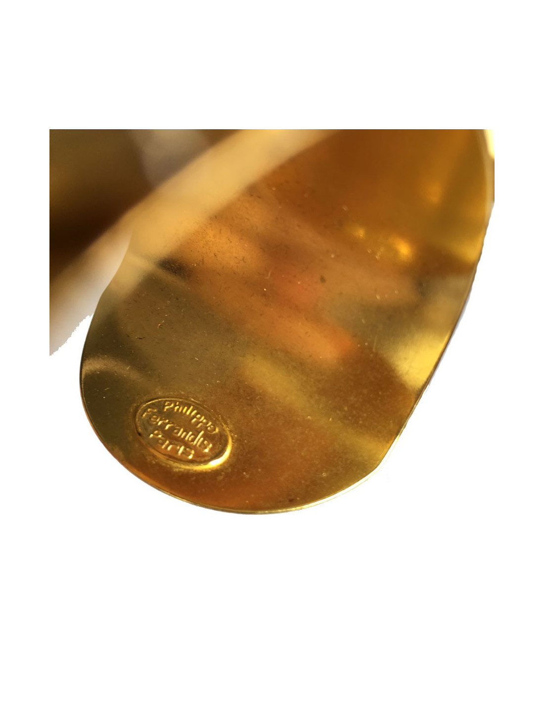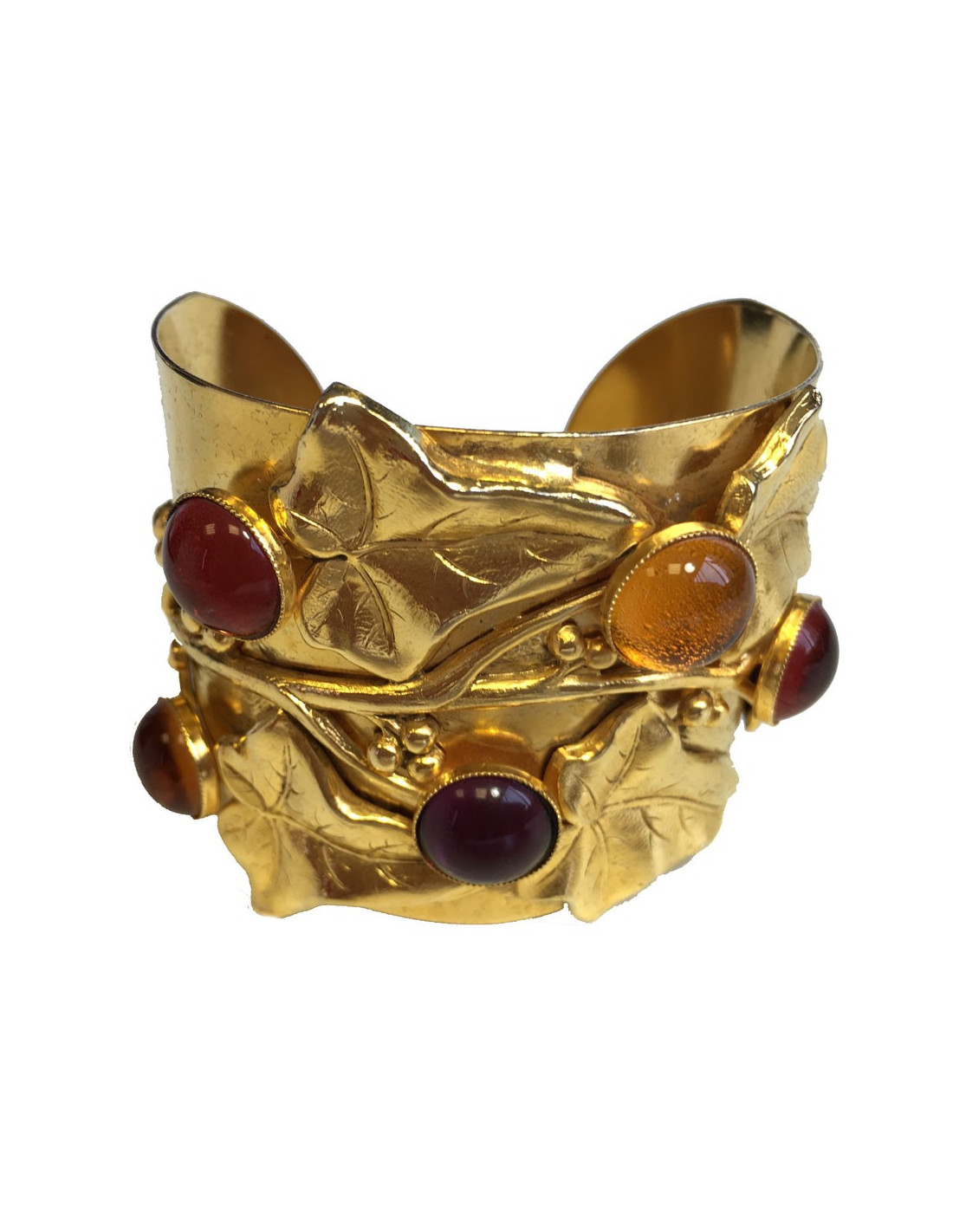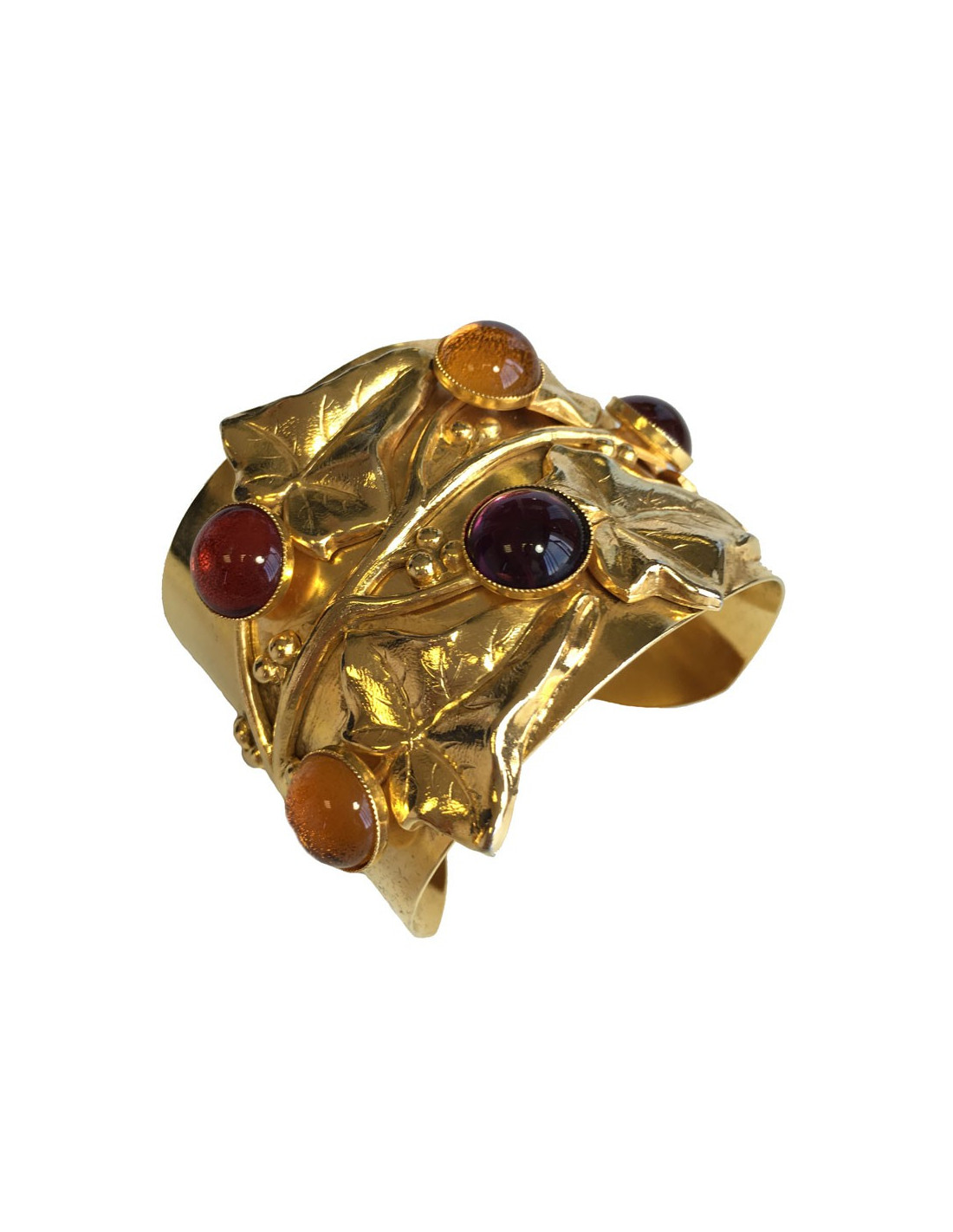 Belle manchette Philippe FERRANDIS en métal doré et résine multicolore. Une branche de feuilles doré en relief sur le bracelet. En parfait état. Pastille de la marque présente.