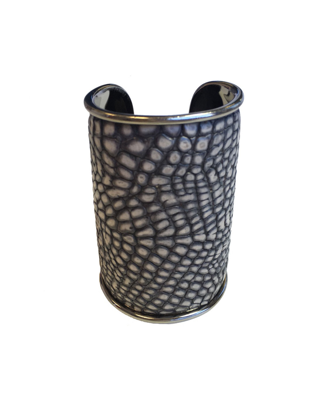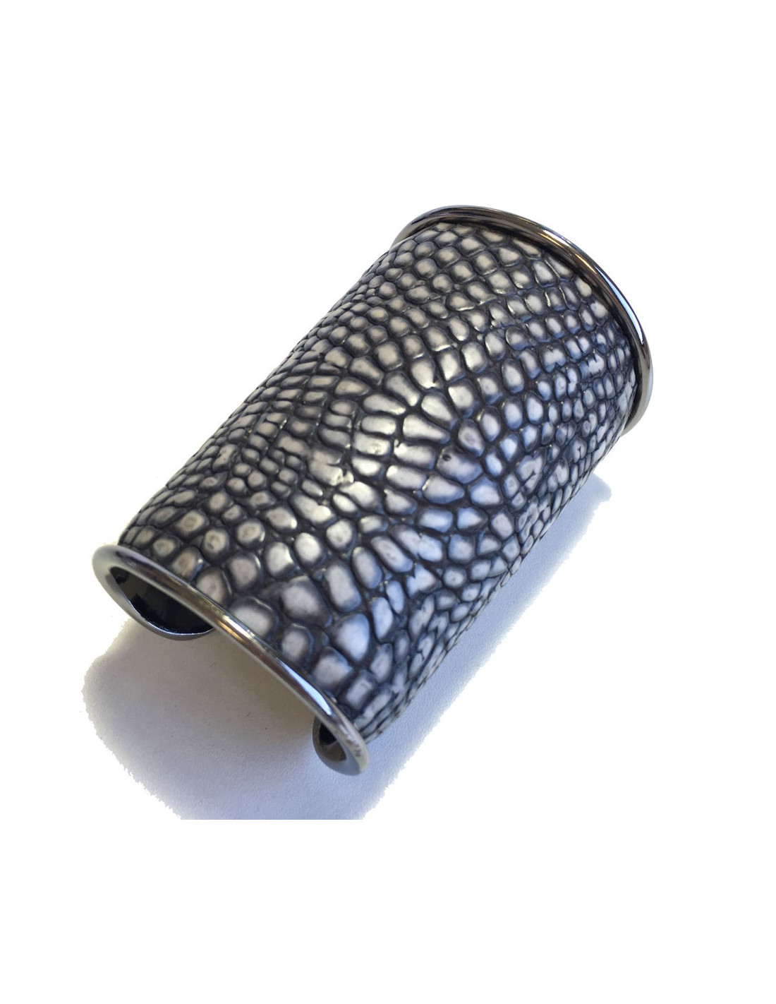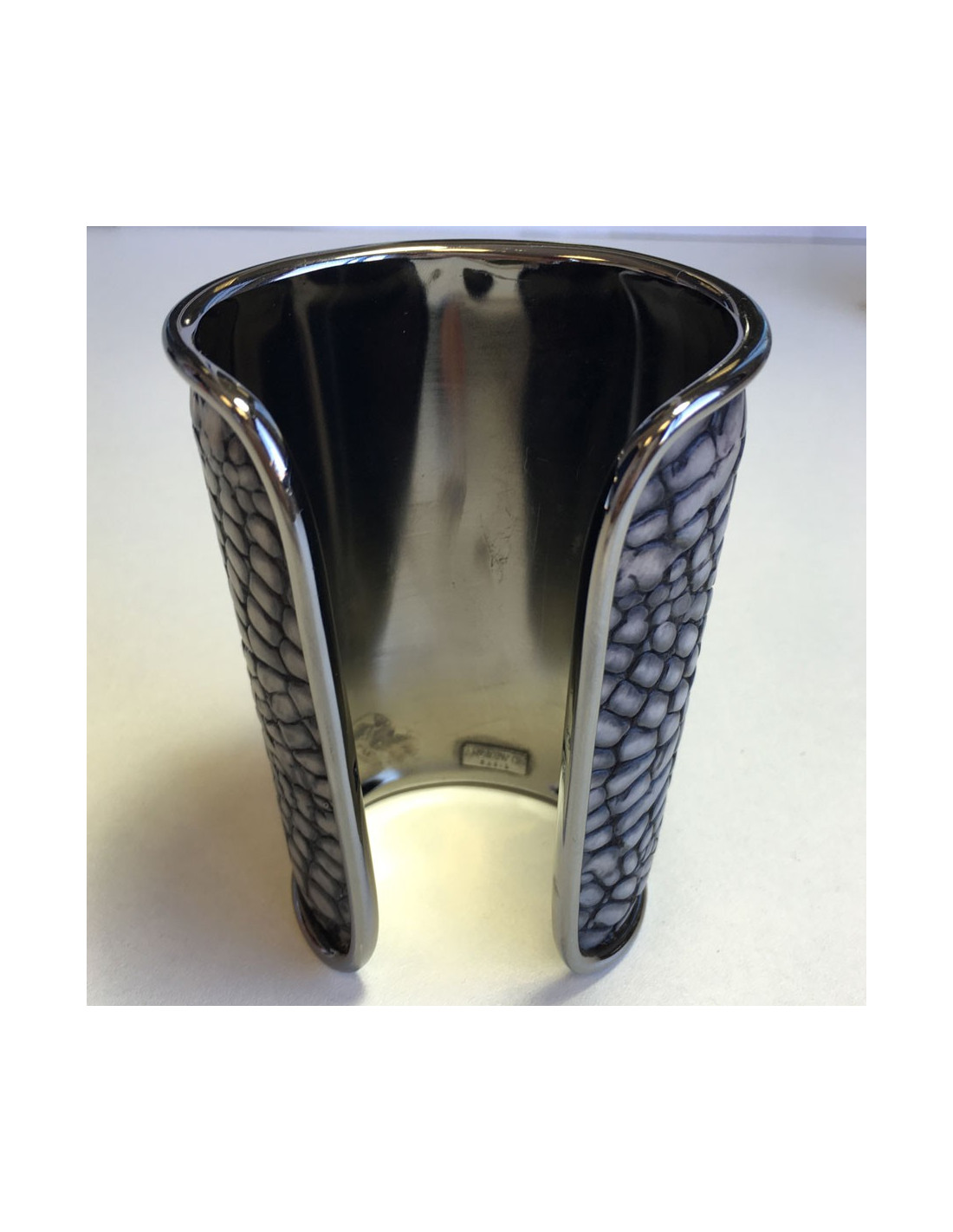 Manchette ANDREW GN en métal argenté, dessus imitation peau dans les tons gris.