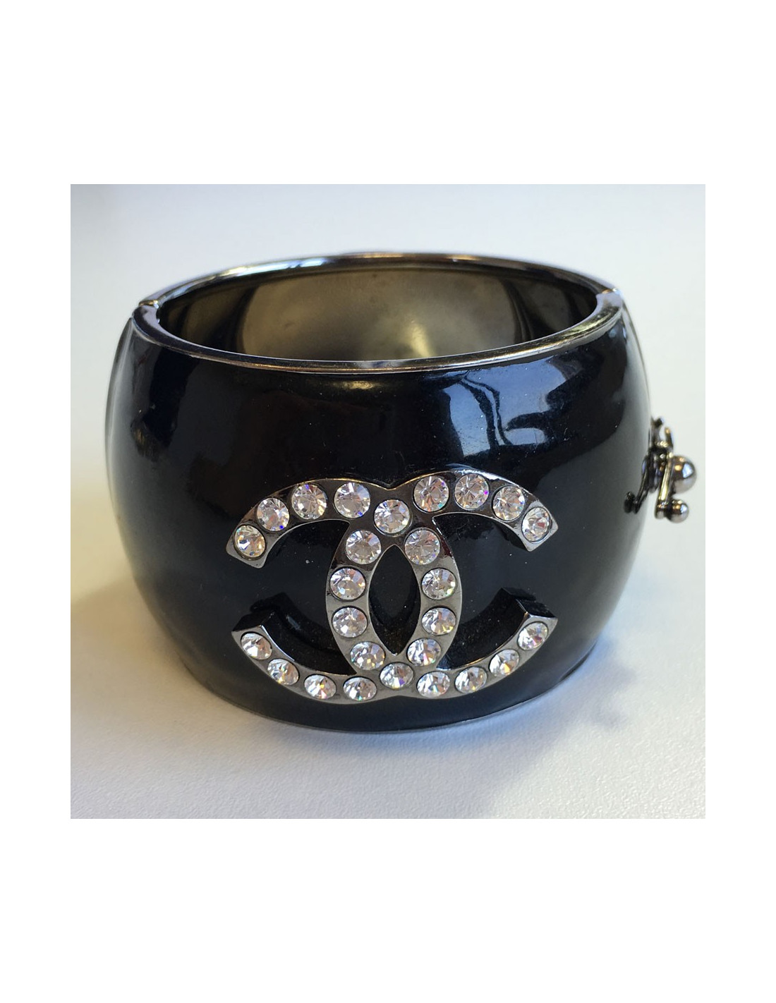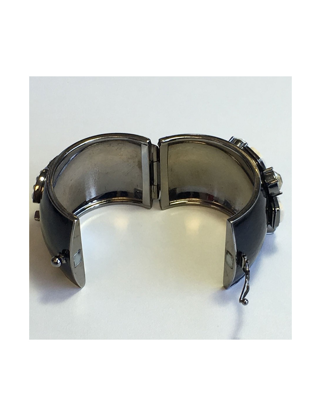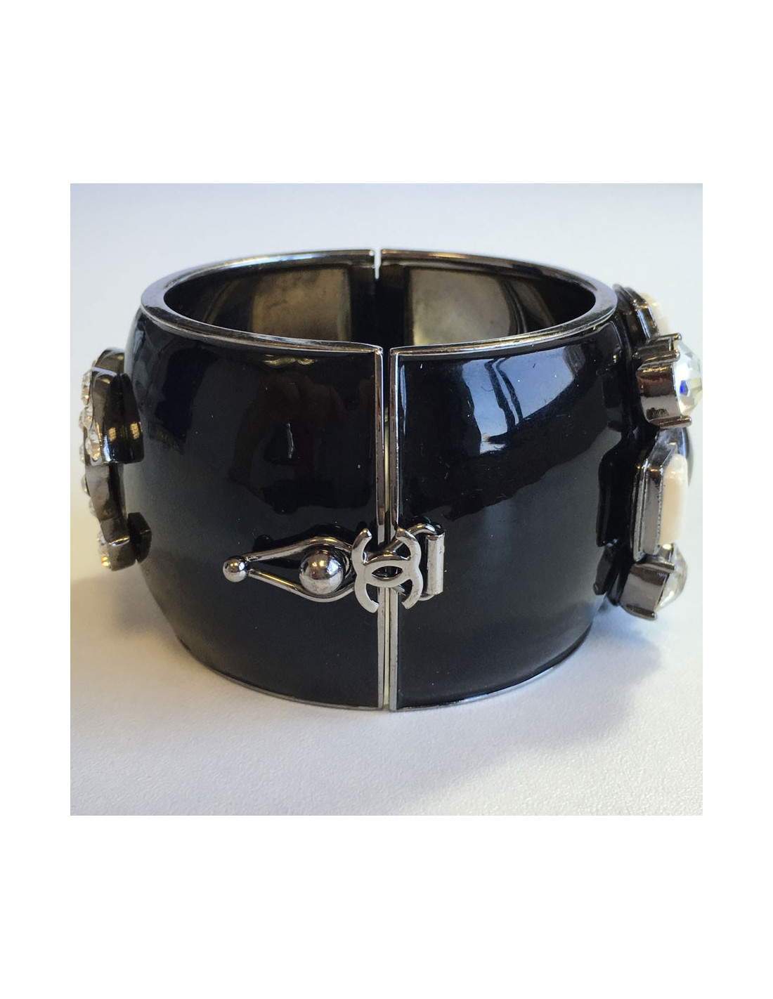 Manchette CHANEL en métal noir surmontée d'un bijou noir, beige et strass. Petit éclat sur une partie beige, et d'un CC serti de strass. Fermoir aimanté agrémenté d'un fermoir de sécurité.