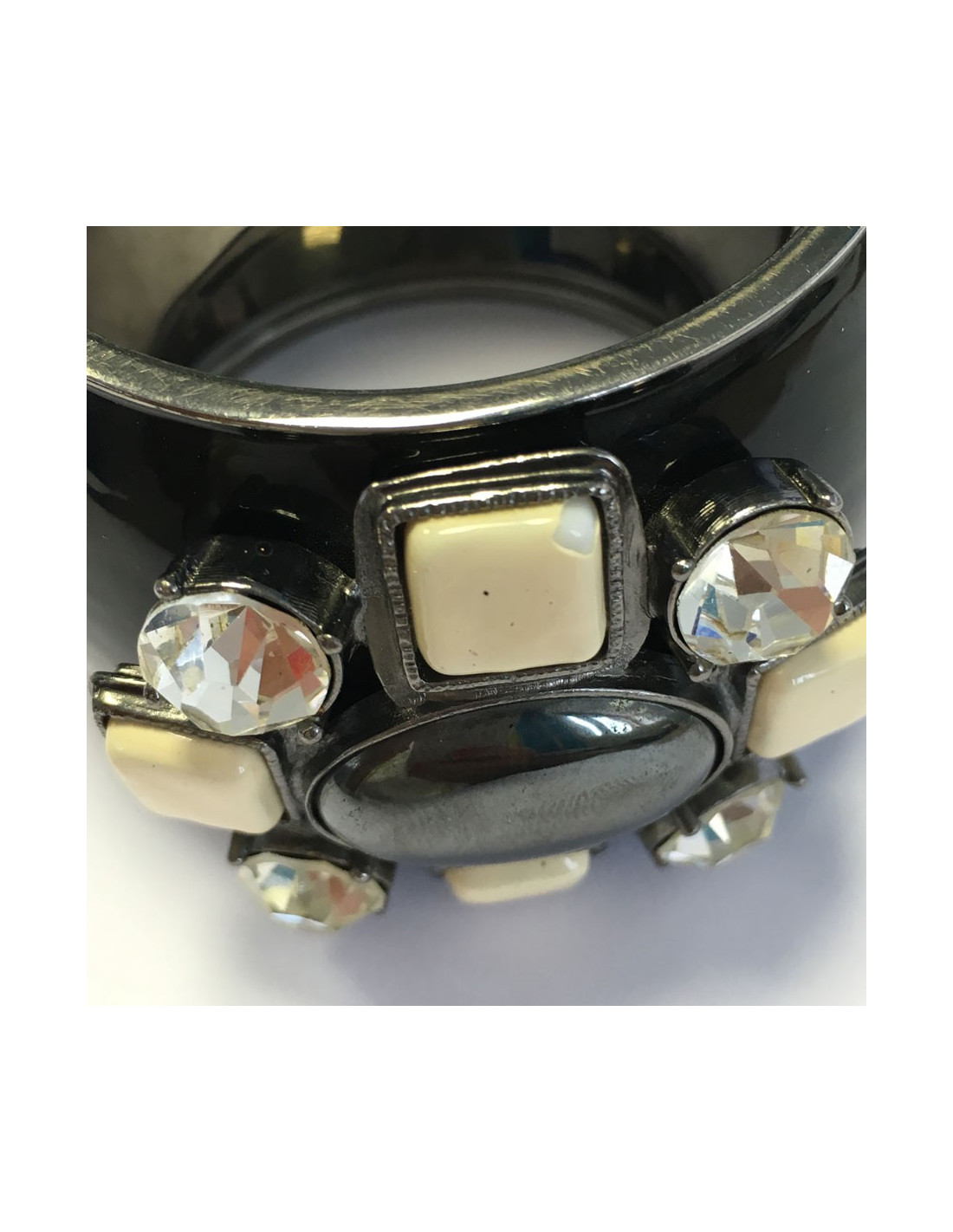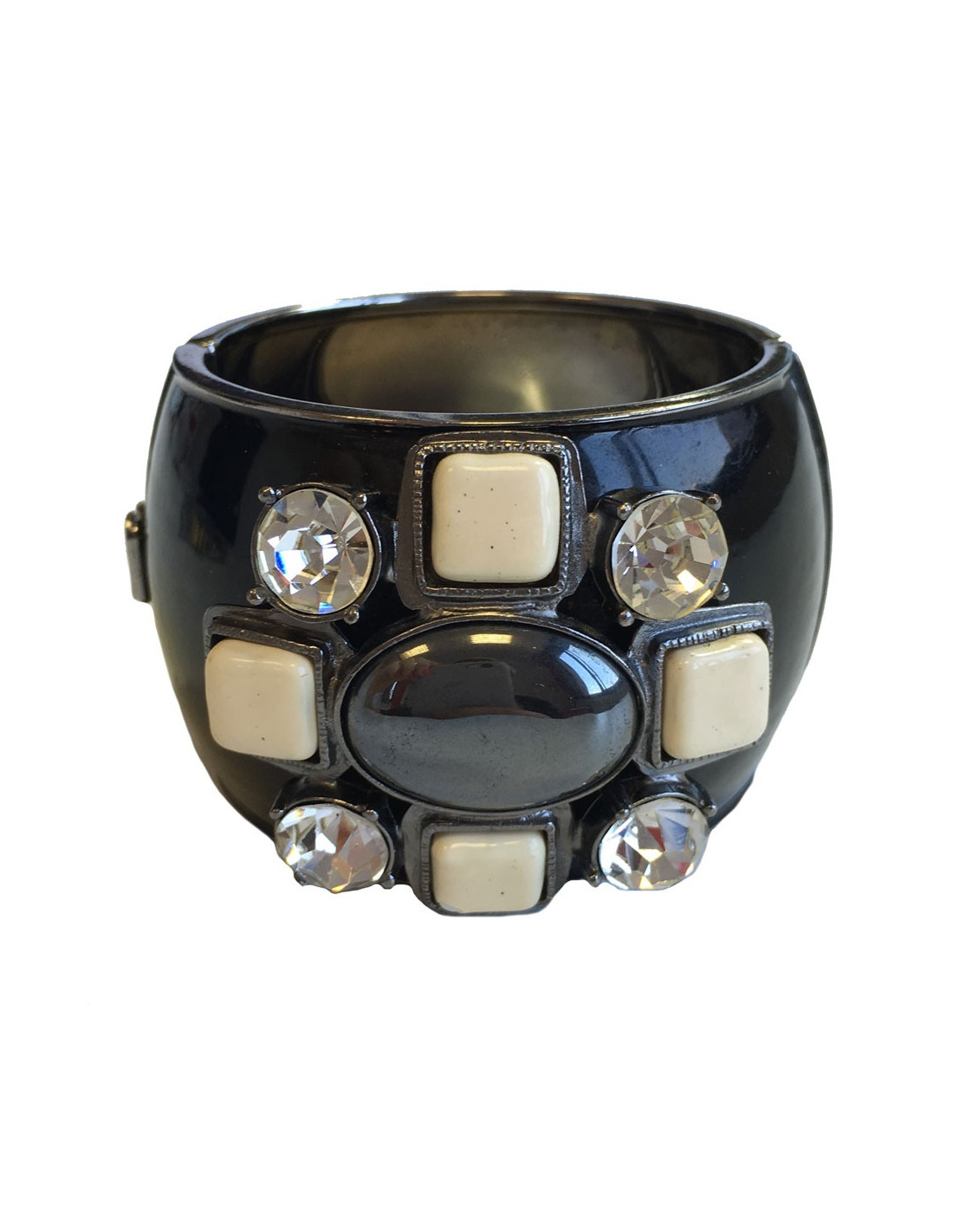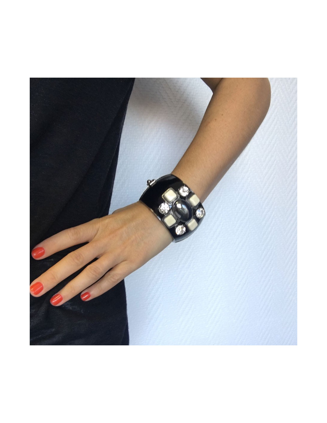 Manchette CHANEL en métal noir surmontée d'un bijou noir, beige et strass. Petit éclat sur une partie beige, et d'un CC serti de strass. Fermoir aimanté agrémenté d'un fermoir de sécurité.