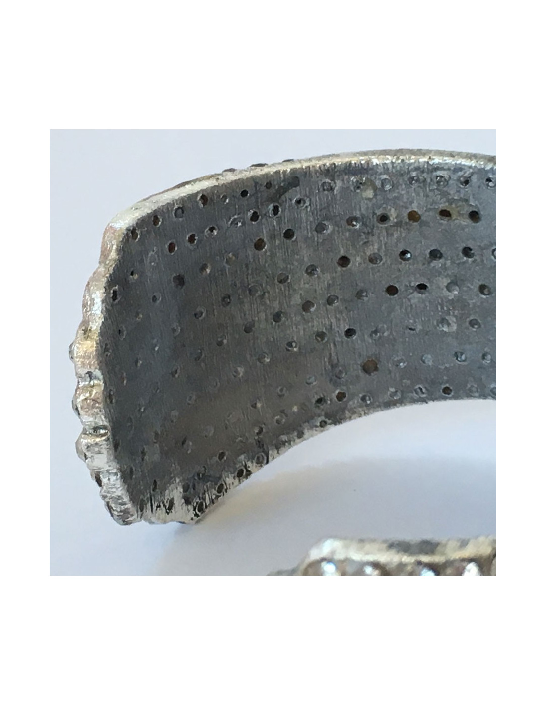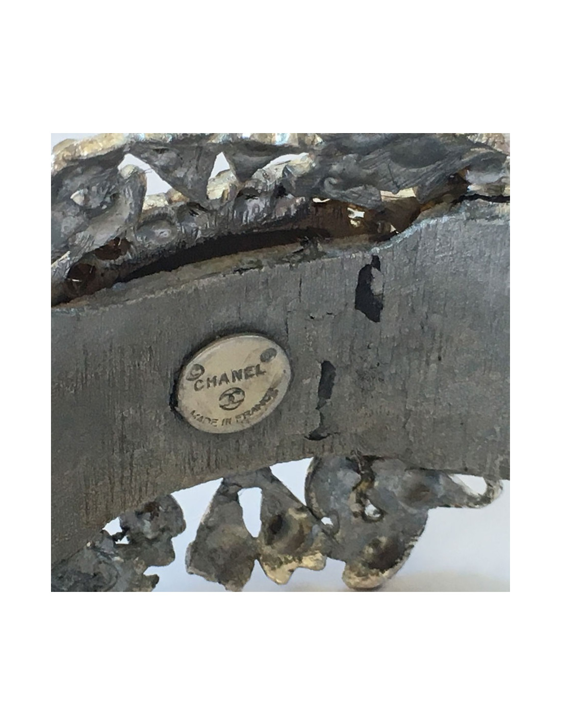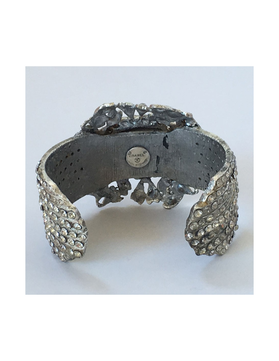 Manchette Couture CHANEL en métal argenté et strass. L'intérieur est en gris métallisé, perforé. Pastille de la marque présente. Bracelet vintage.