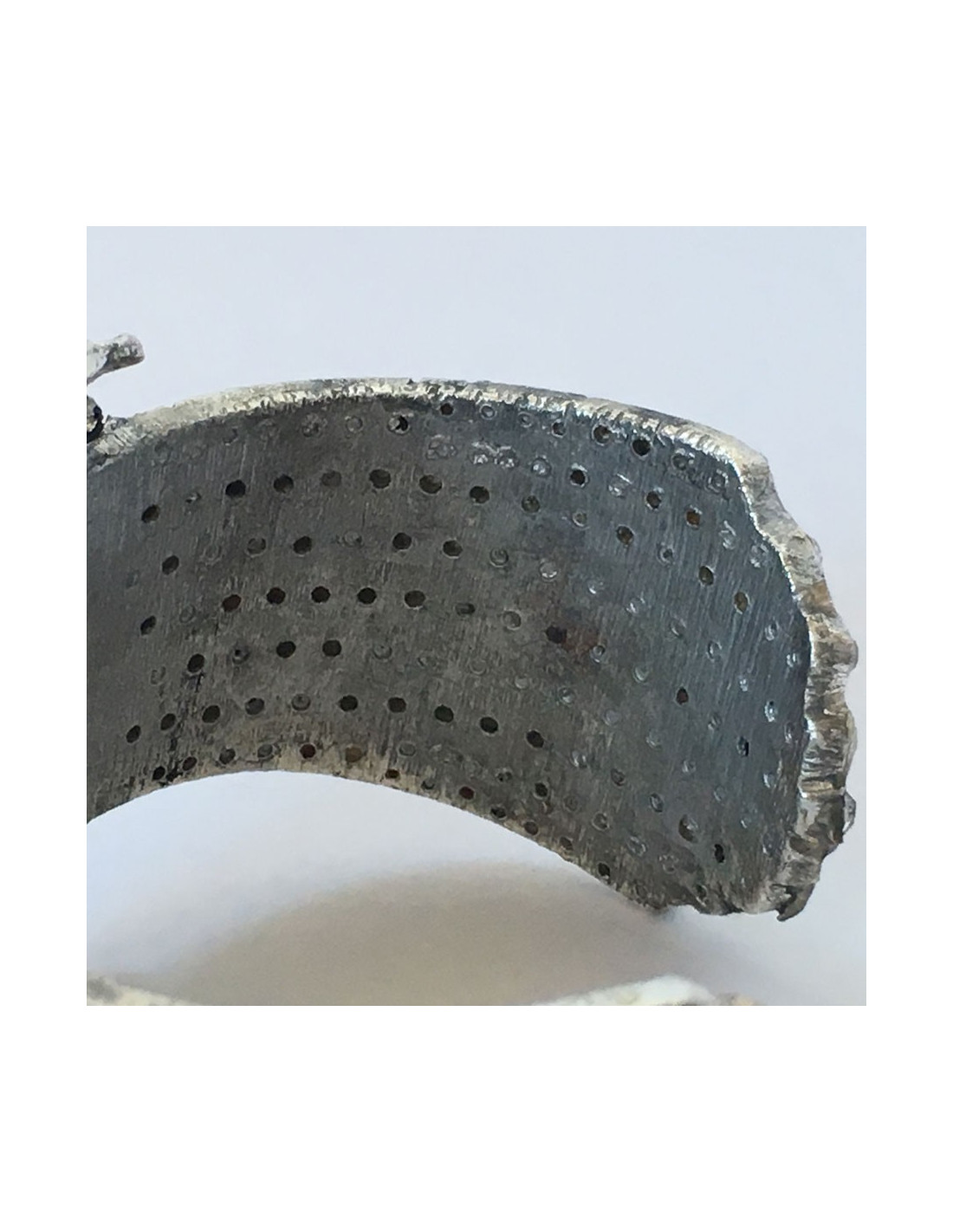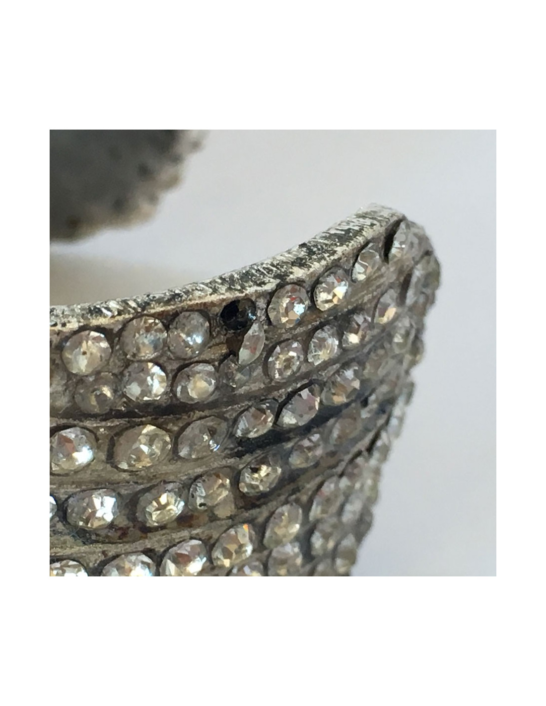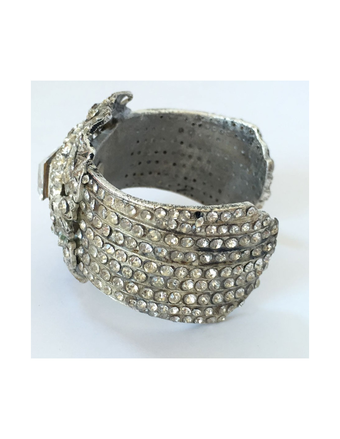 Manchette Couture CHANEL en métal argenté et strass. L'intérieur est en gris métallisé, perforé. Pastille de la marque présente. Bracelet vintage.