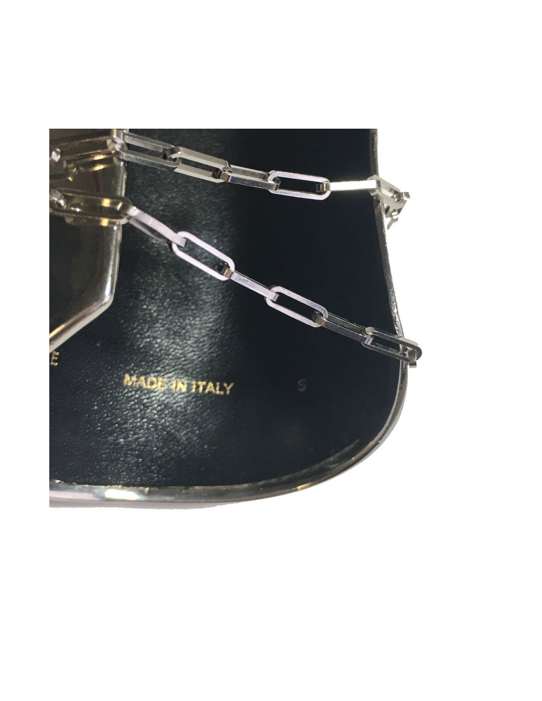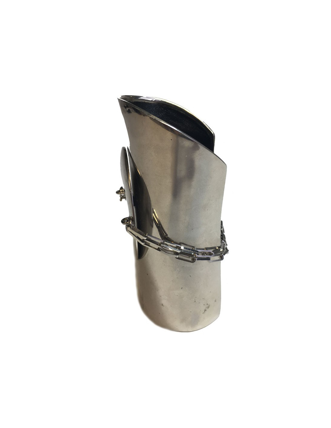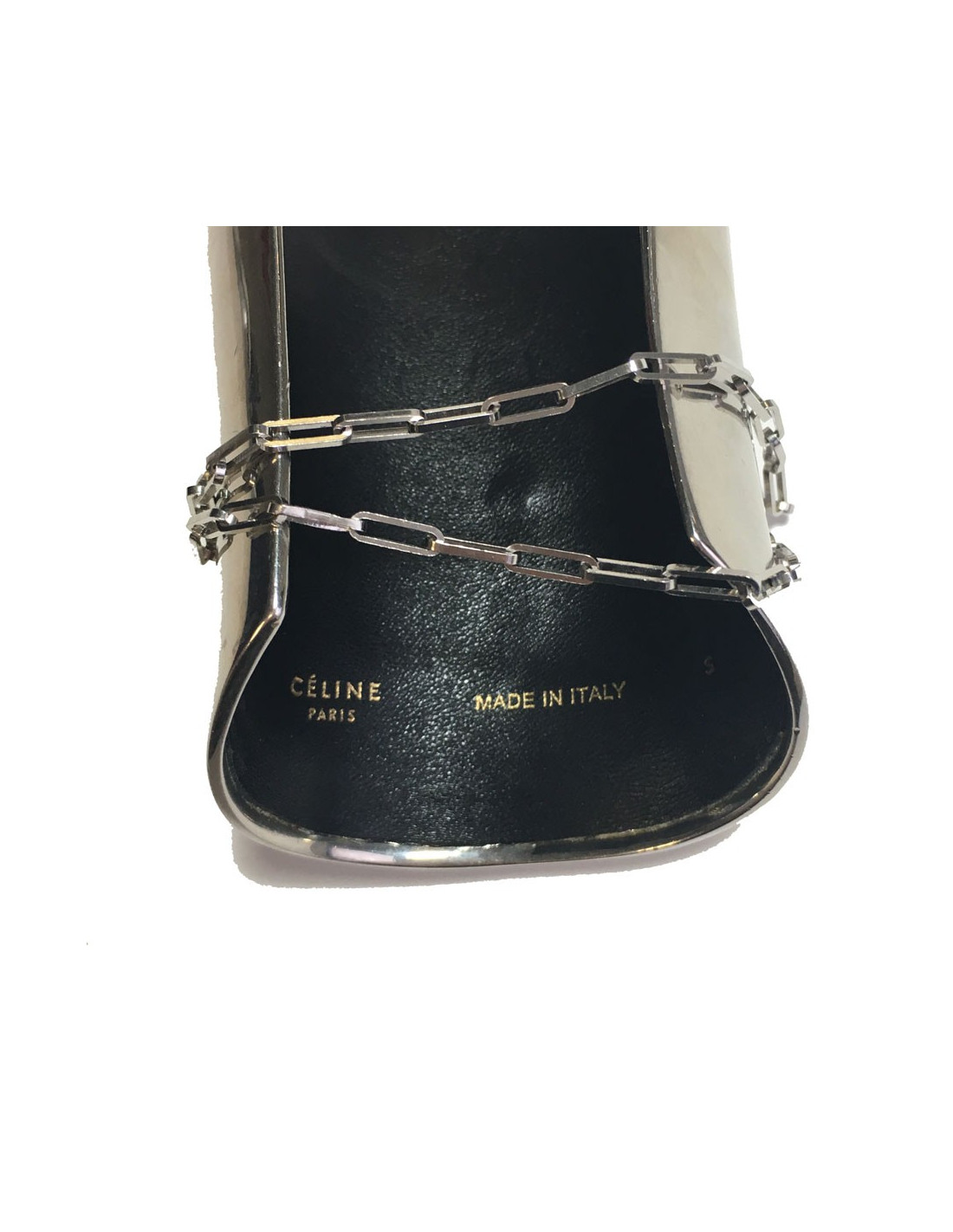 Manchette CELINE en métal argenté agrémentée d'une chaîne et d'une pièce en métal argenté ronde. Intérieur en simili cuir. Taille S. Made in Italy. Il est assez lourd.