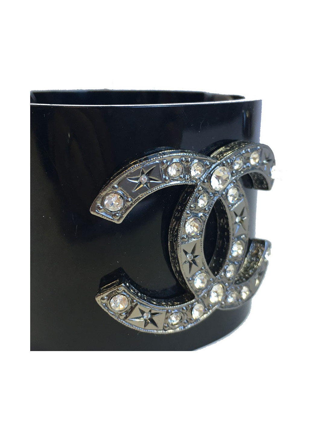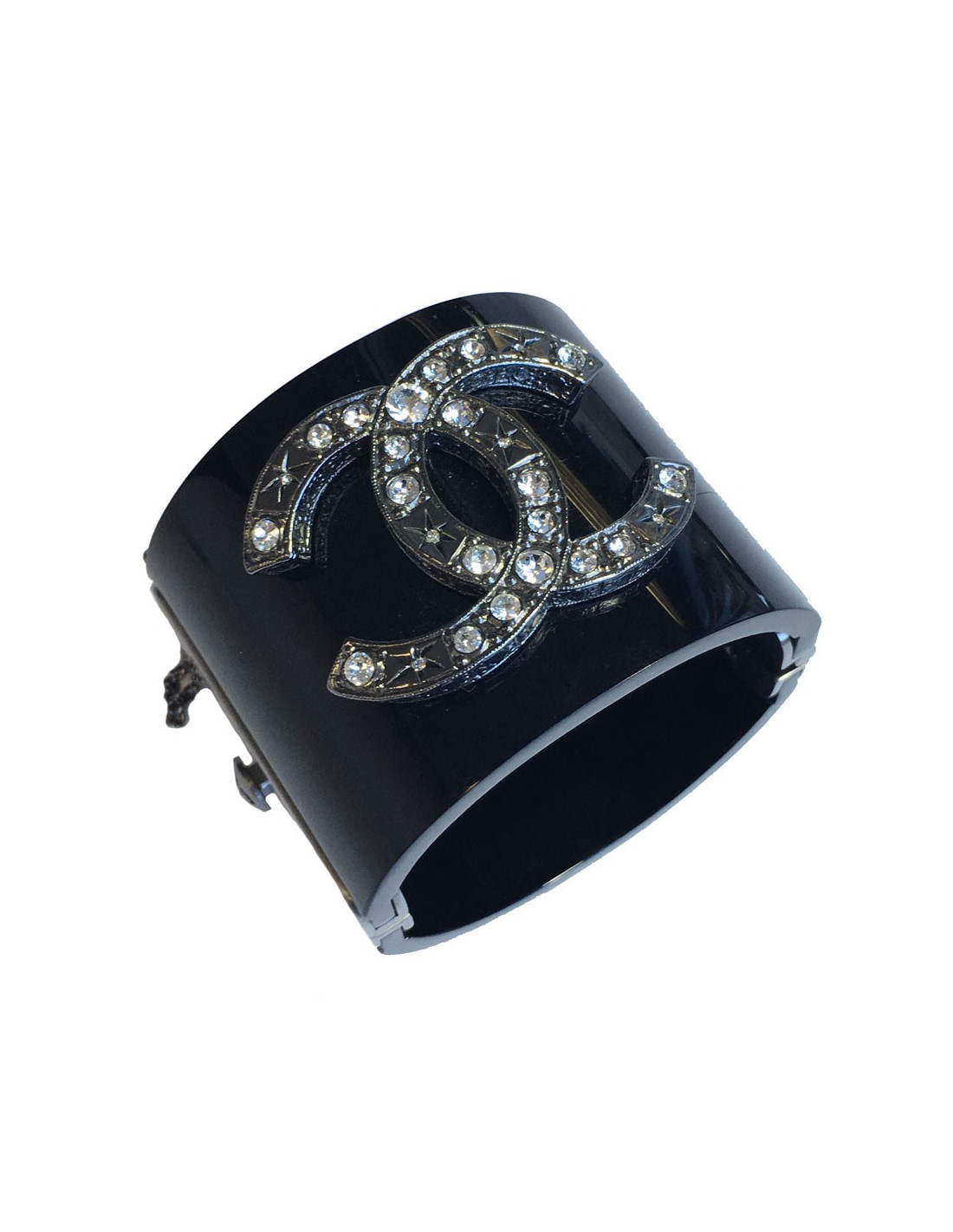 Magnifique manchette CHANEL rigide en plexi noir, bijouterie argentée et grand CC central en métal argenté et strass. Fermoir par pression bouton CC. Petite chaîne de sûreté.