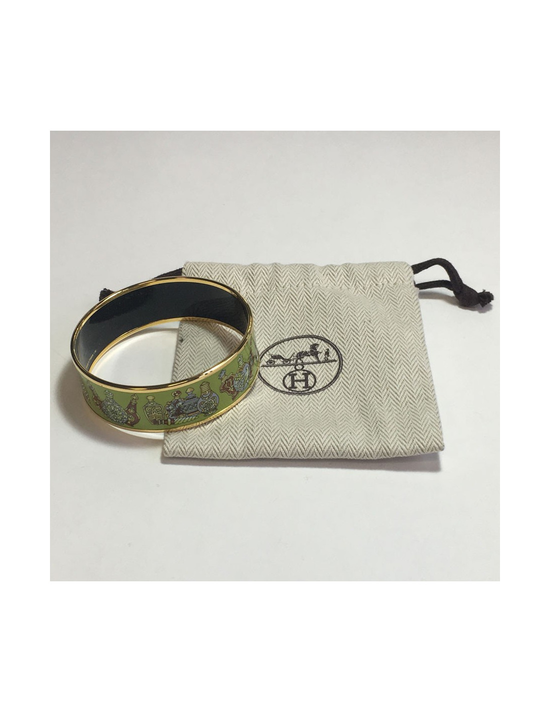 Bracelet HERMES en émail vert, motif: carafes multicolores. finition plaqué or.
