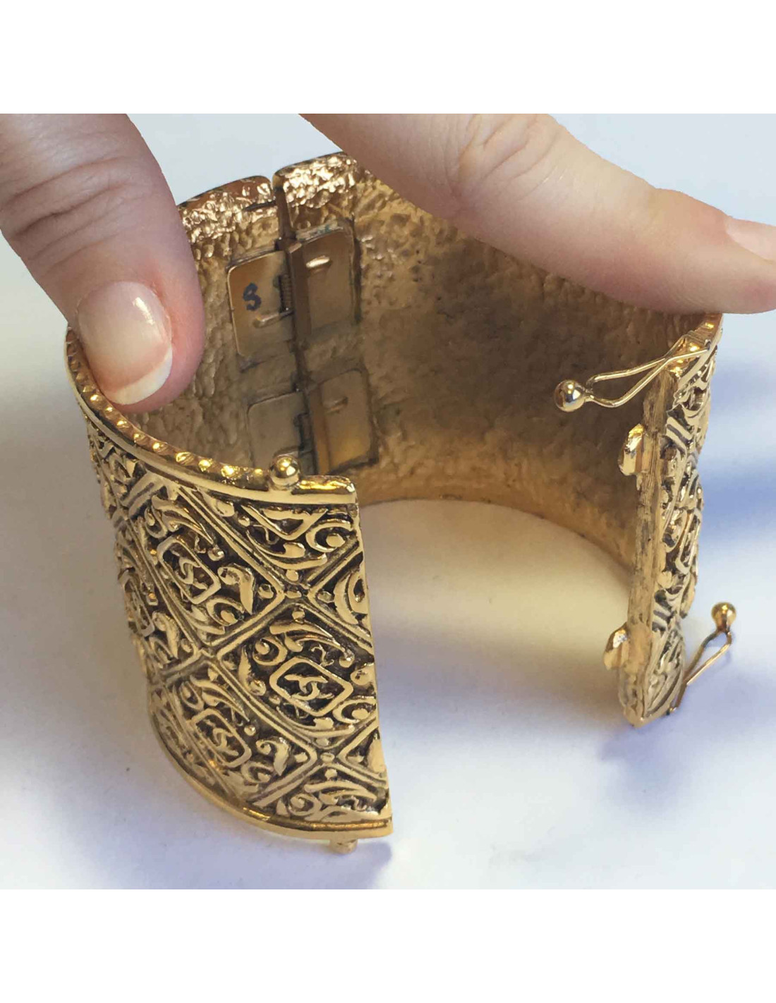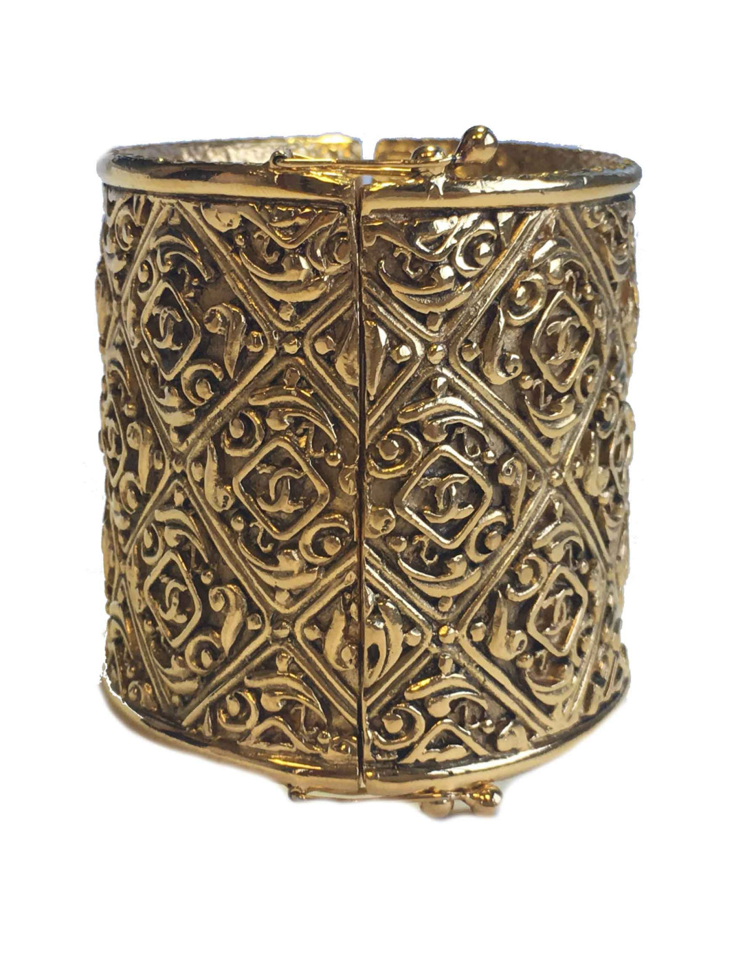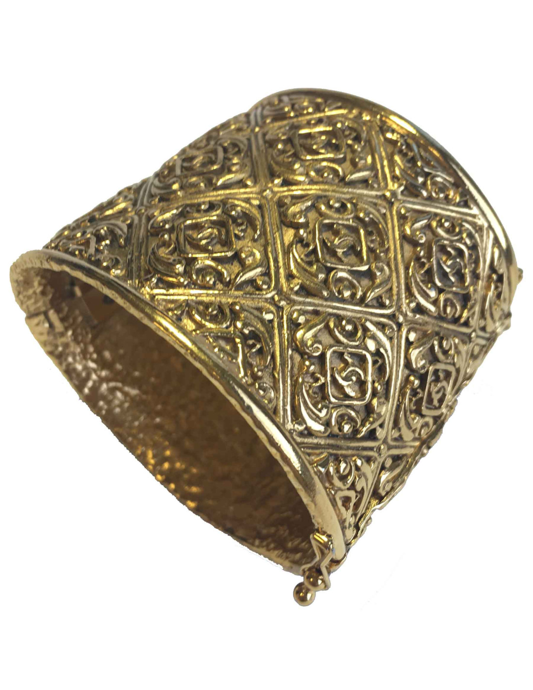Exceptionnelle manchette CHANEL vintage en métal doré. Elle est articulée par 2 ressorts et se ferme avec 2 petits fermoirs. L'intérieur de la manchette est martelé, l'extérieur est orné de CC en relief.