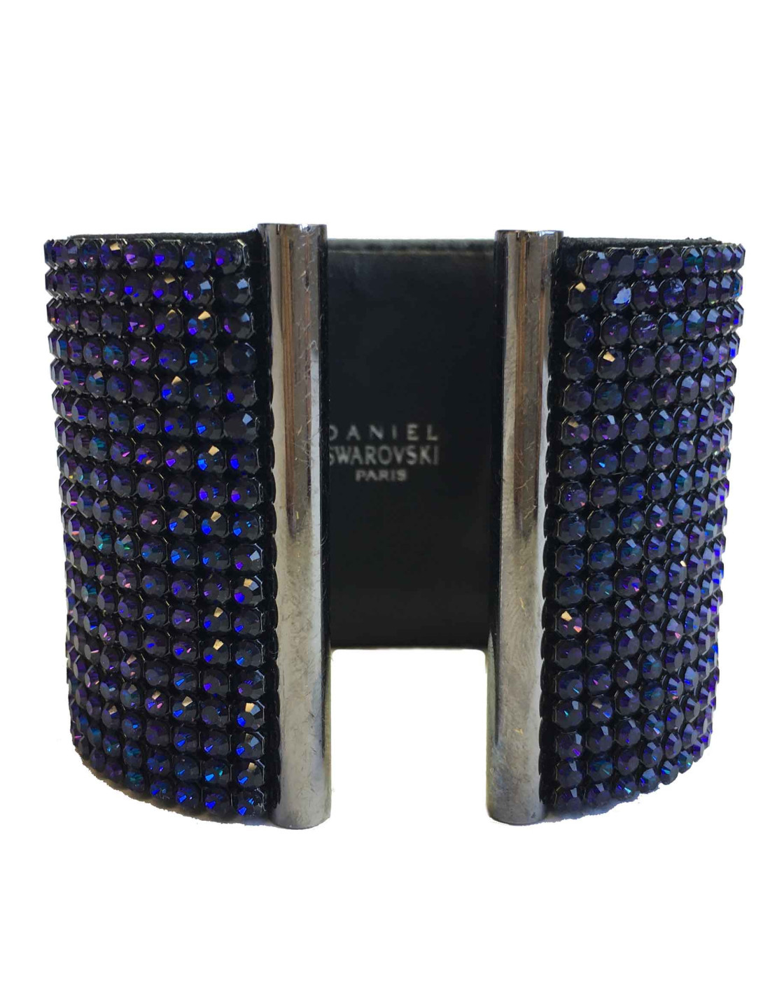 Superbe manchette Daniel Swarovski rigide en métal argenté sertie de crystal mesh violet foncé.