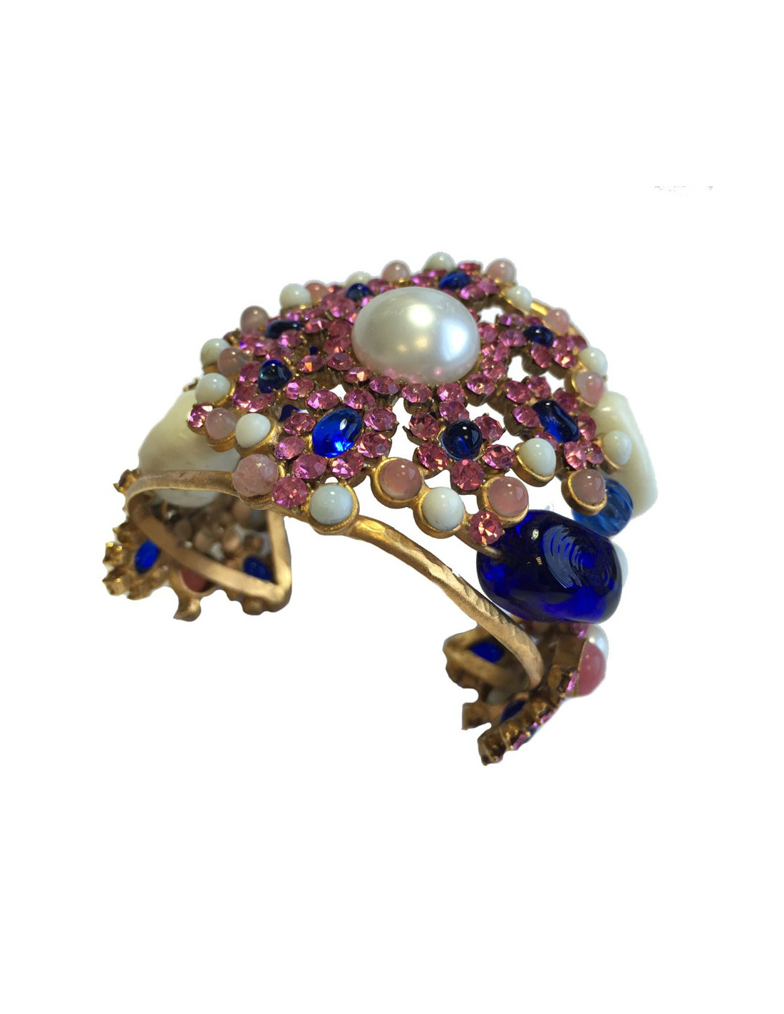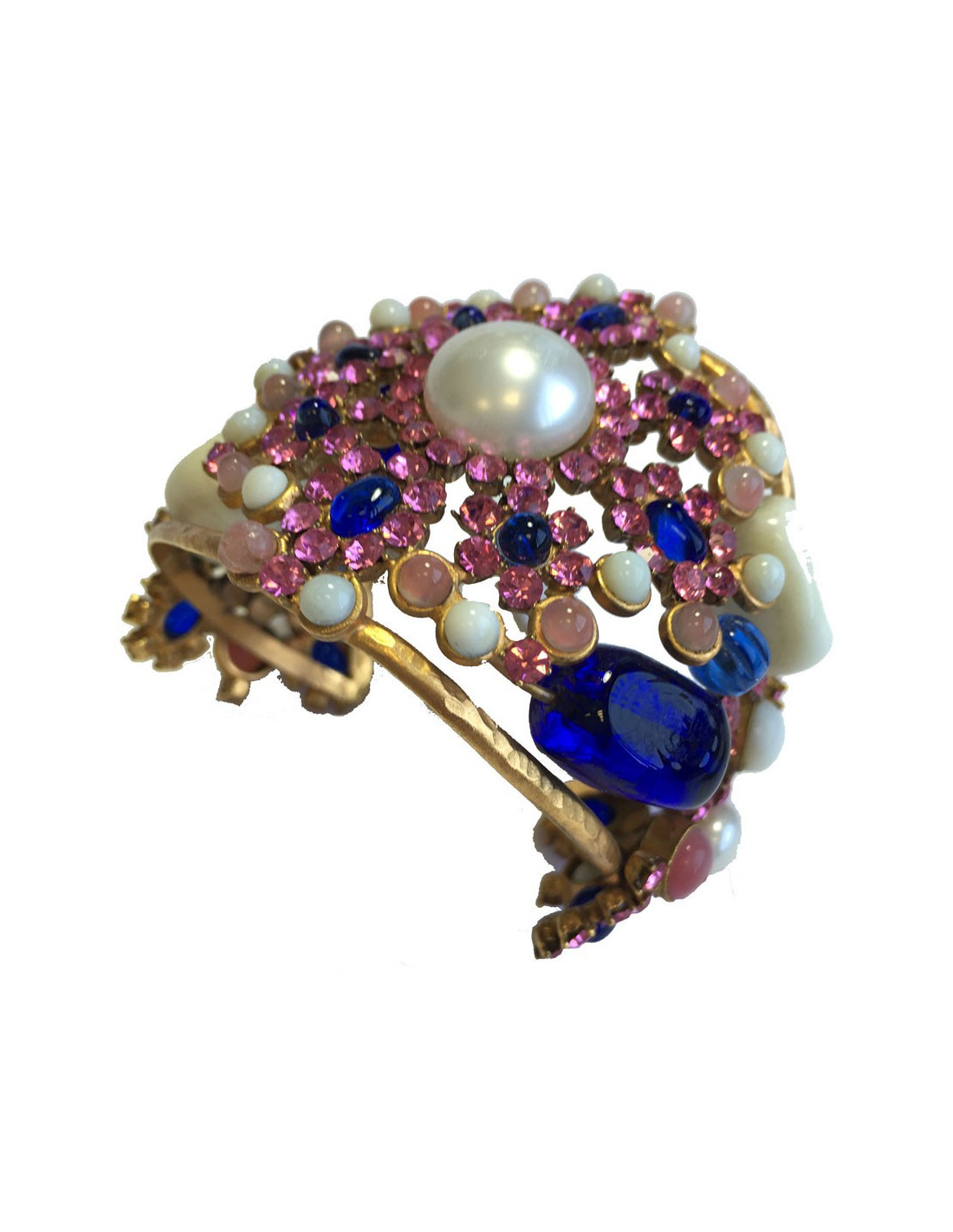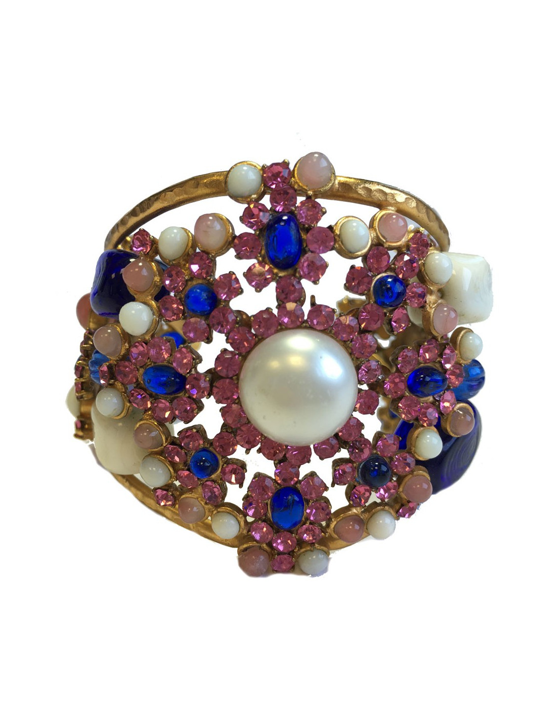Couture! Manchette Marguerite de Valois byzantine en métal martelé doré à l'or fin, strass rose, pâte de verre blanc, bleu et rose et une perle nacrée au centre. Jamais portée.