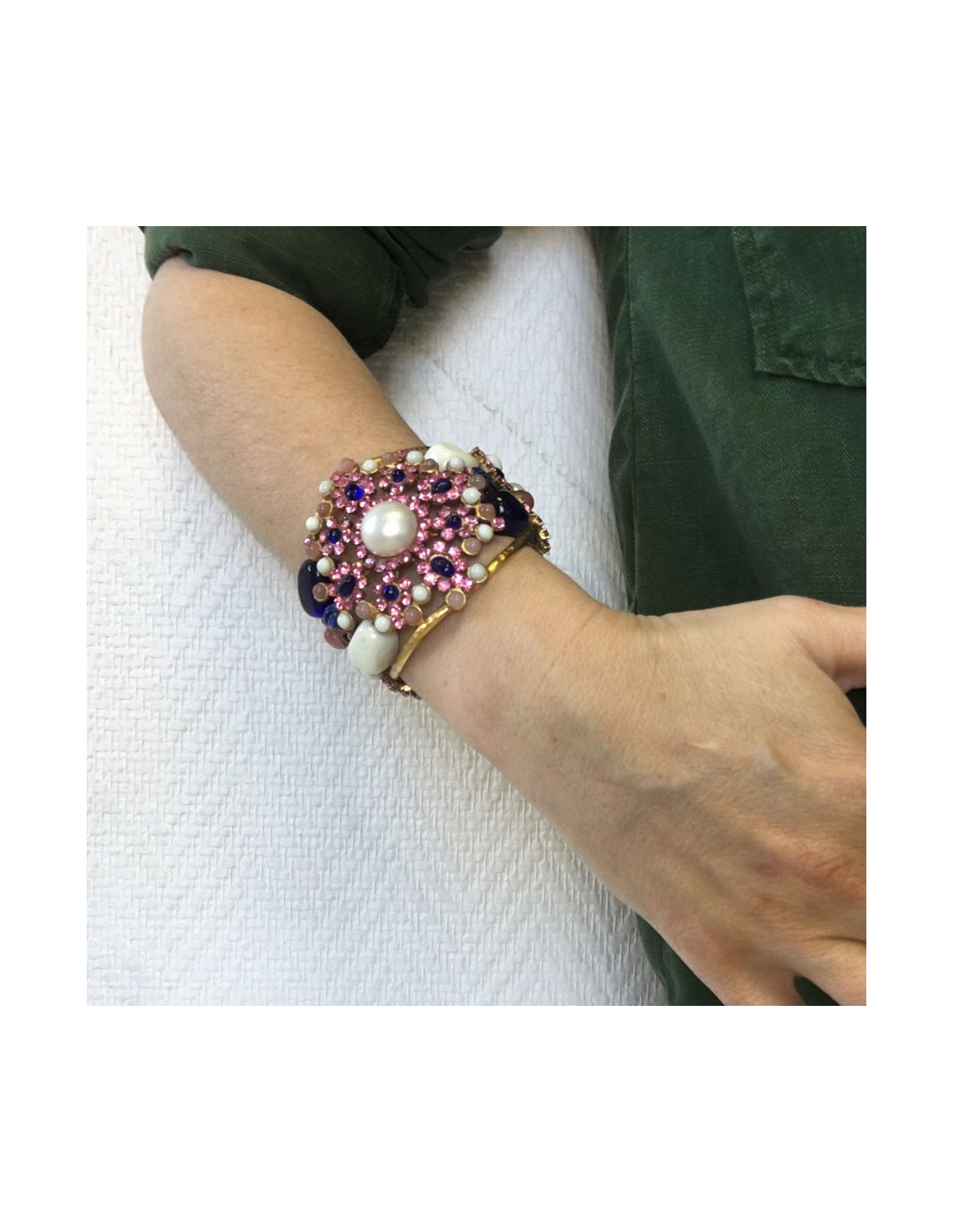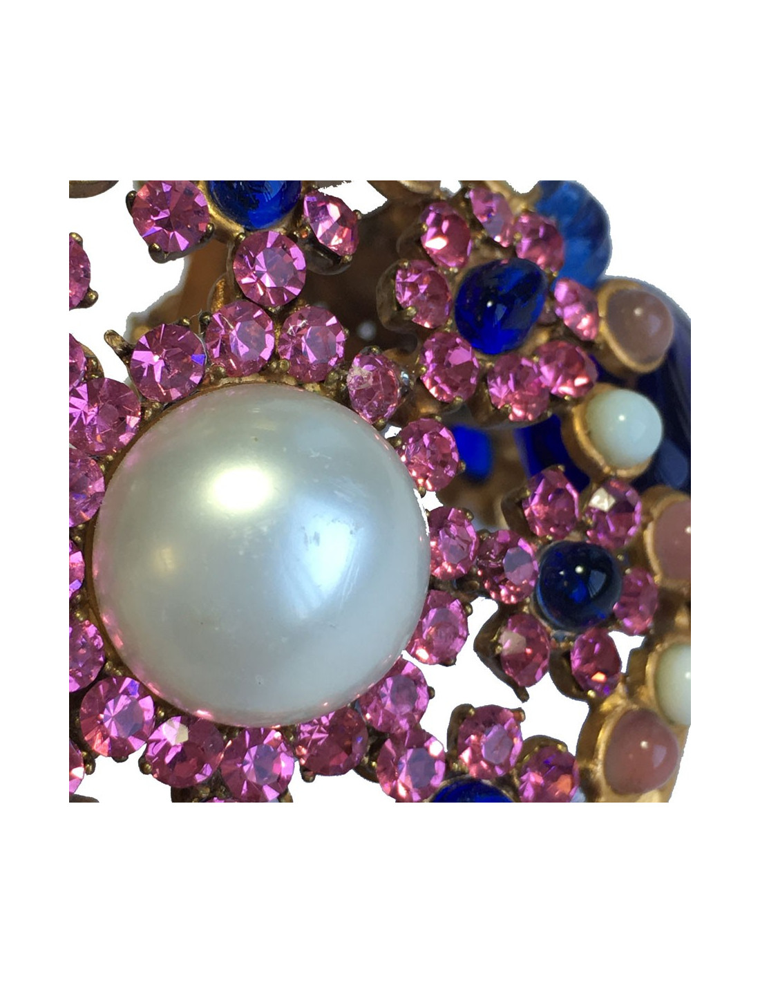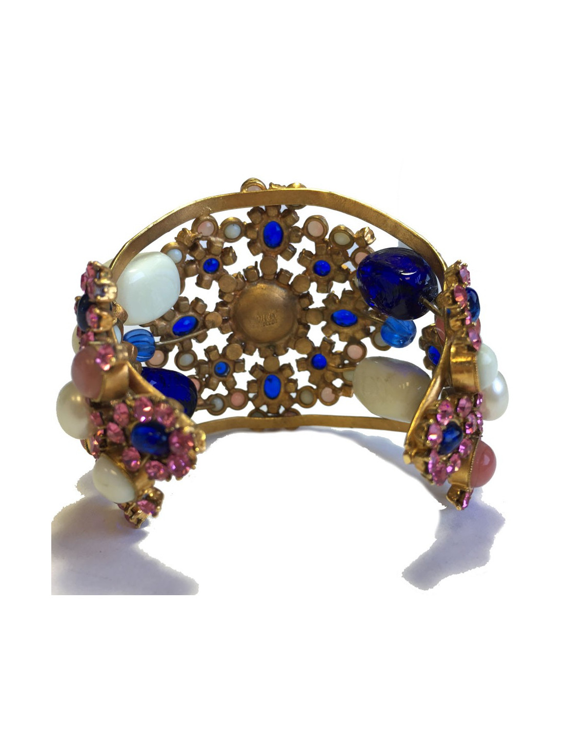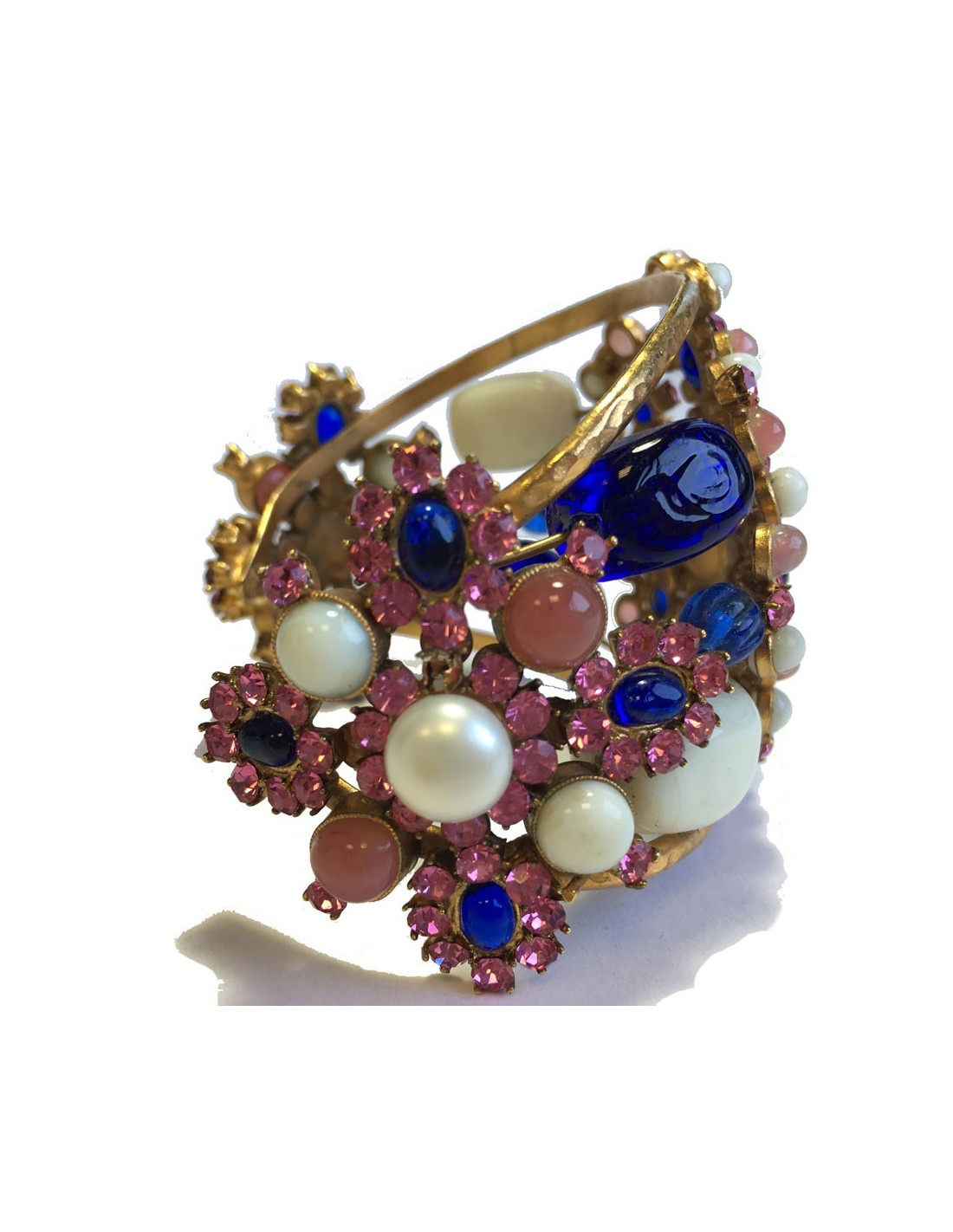 Couture! Manchette Marguerite de Valois byzantine en métal martelé doré à l'or fin, strass rose, pâte de verre blanc, bleu et rose et une perle nacrée au centre. Jamais portée.