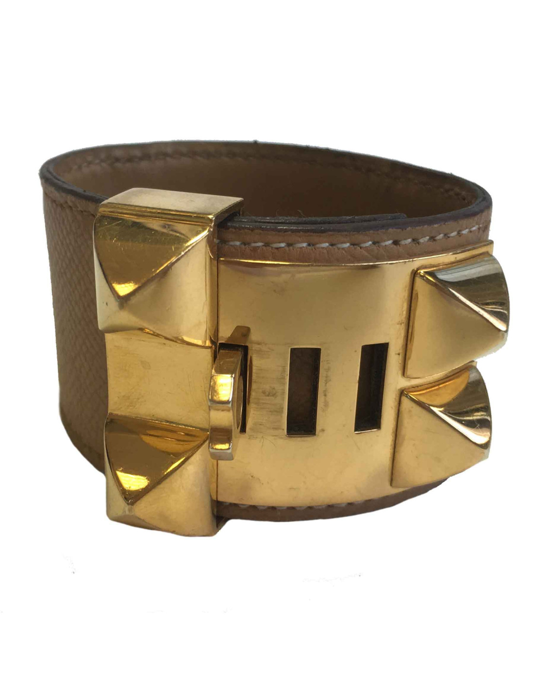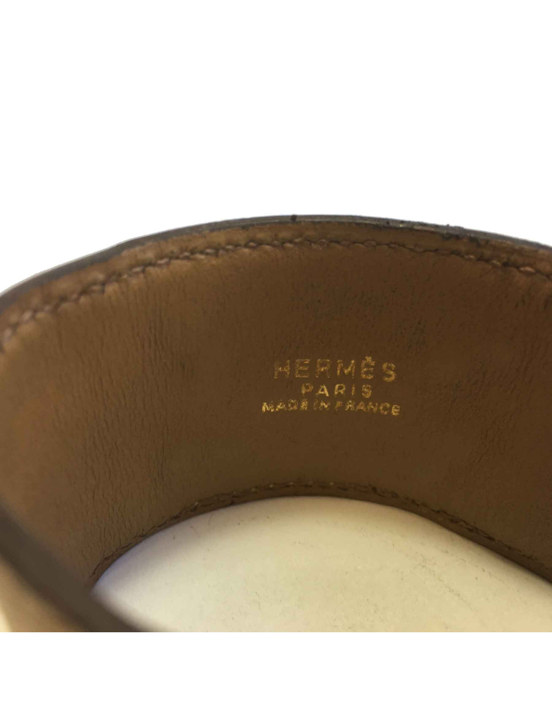 Vintage. Manchette Médor Hermès ou encore collier de chien en cuir epsom gold. Bijouterie plaqué or. En bon état.