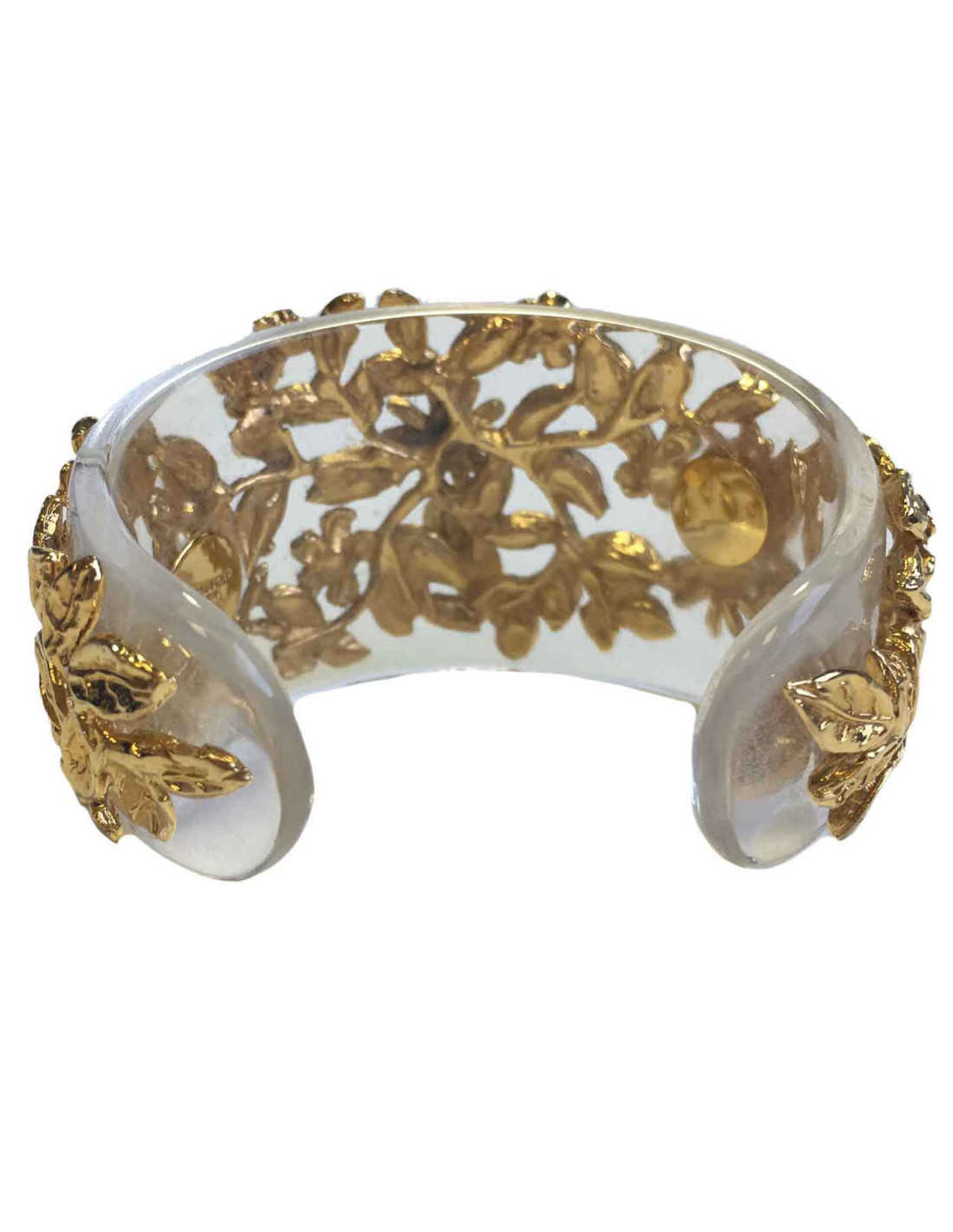 Couture!! Manchette Robert Goossens en plexiglass transparent, feuilles et fleurs en métal doré.