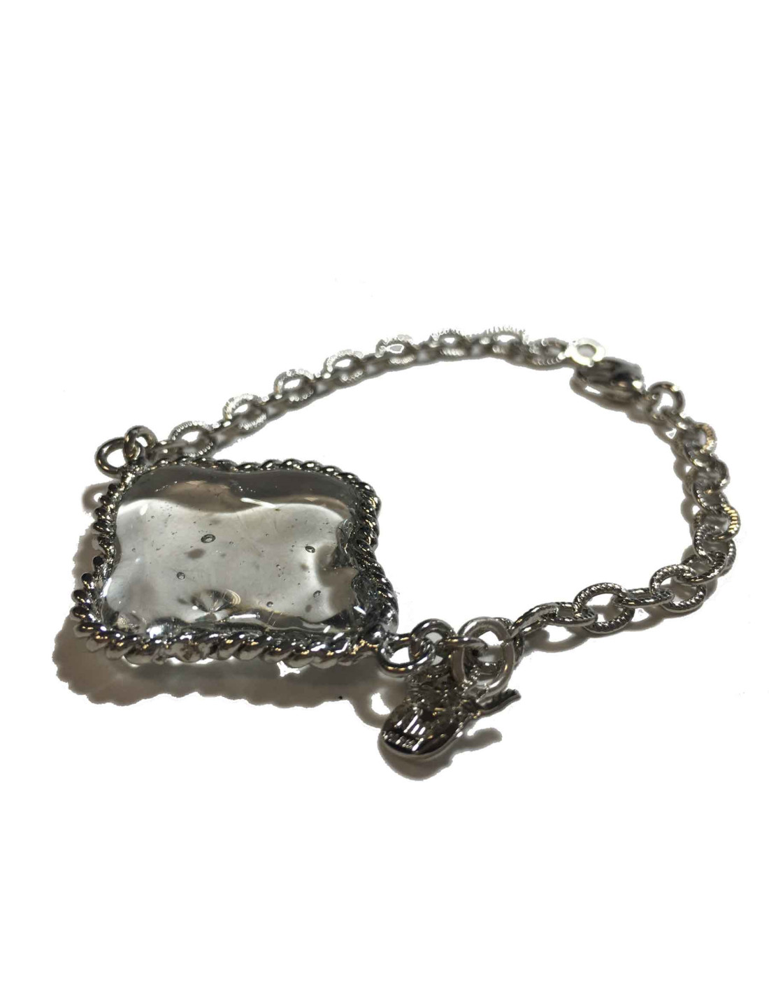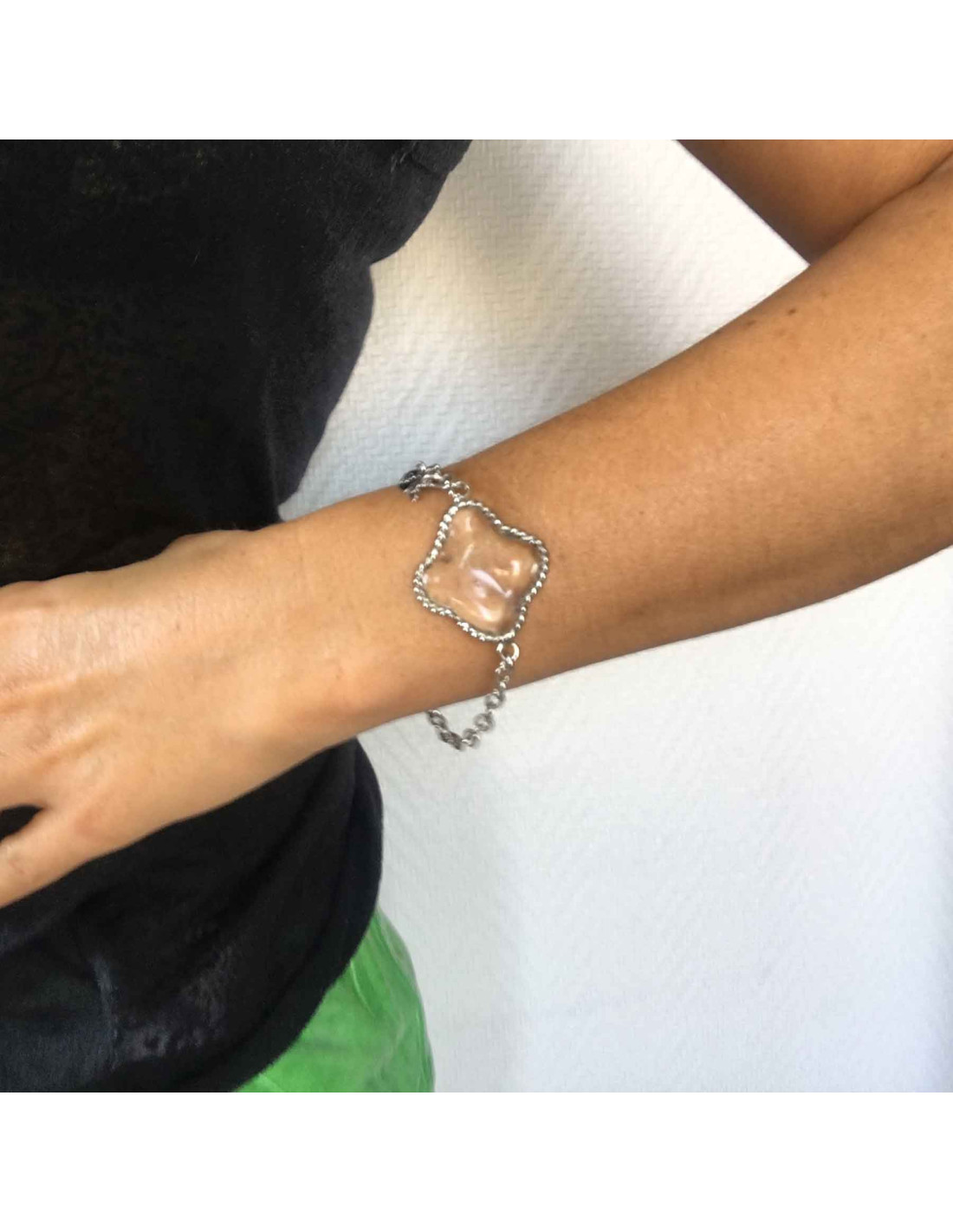 Bracelet Marguerite de Valois en métal argenté et trèfle en pâte de verre transparente.