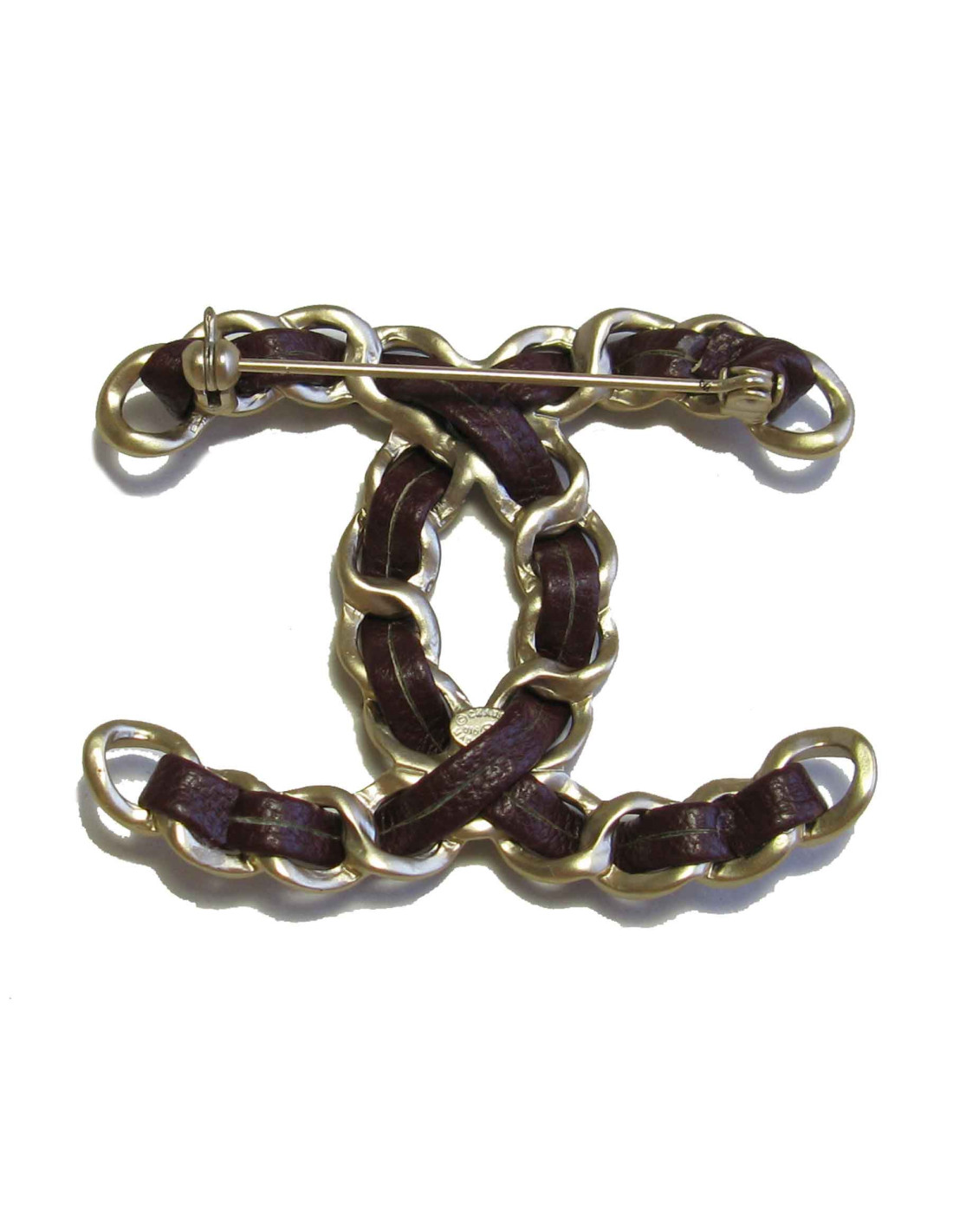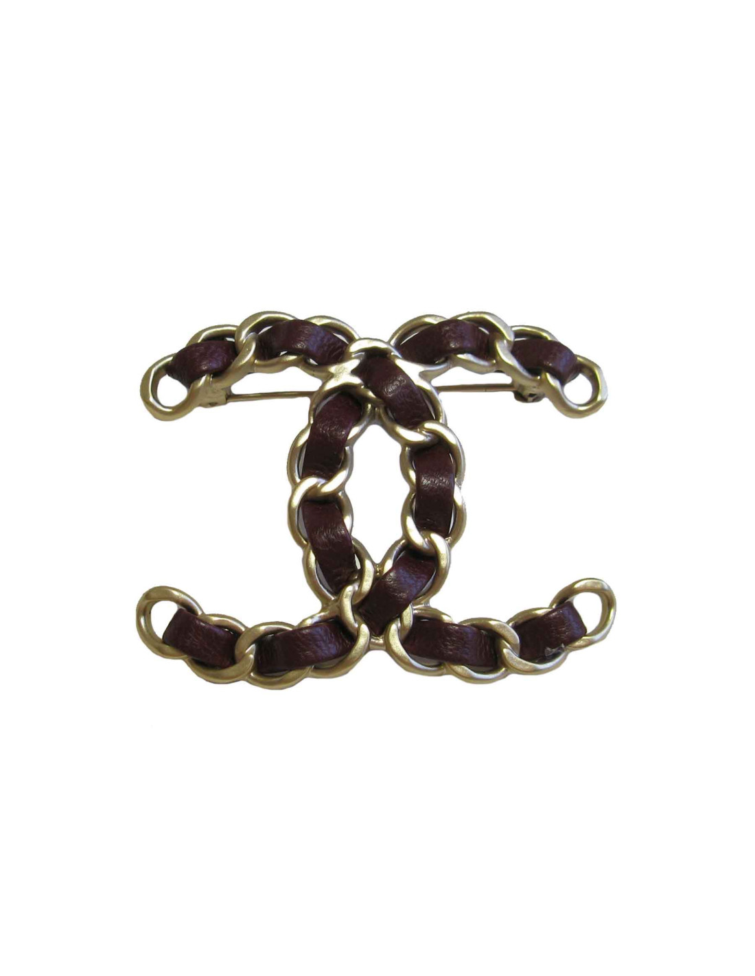 Broche CHANEL CC chaine dorée et cuir bordeaux