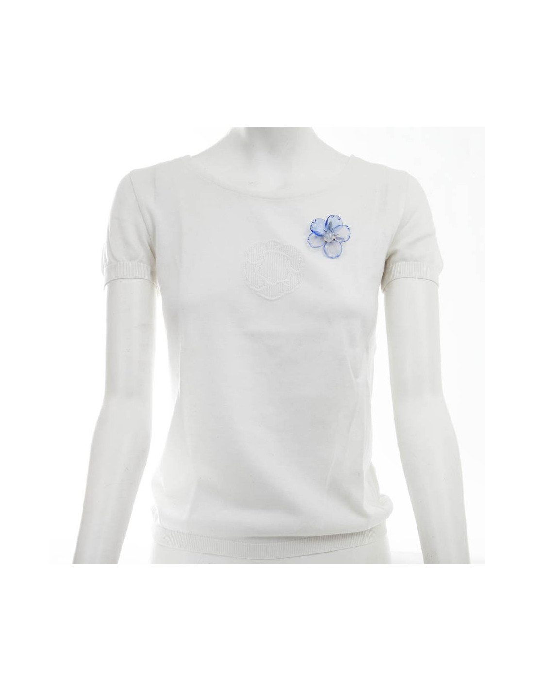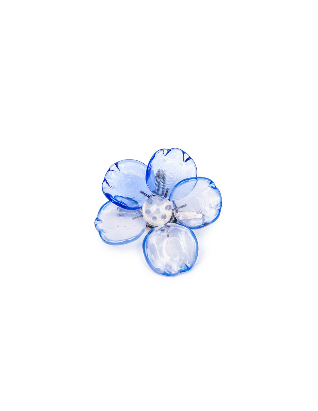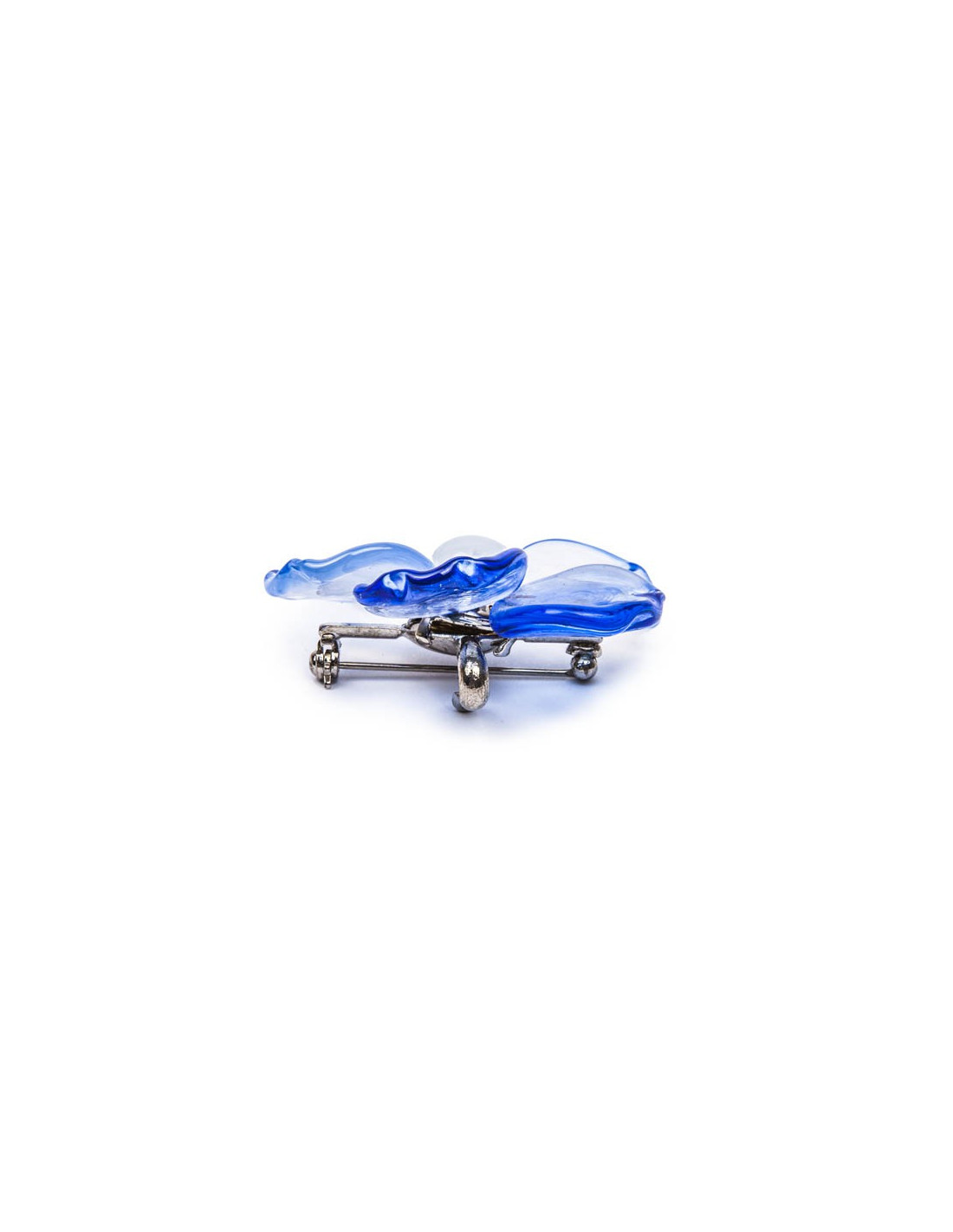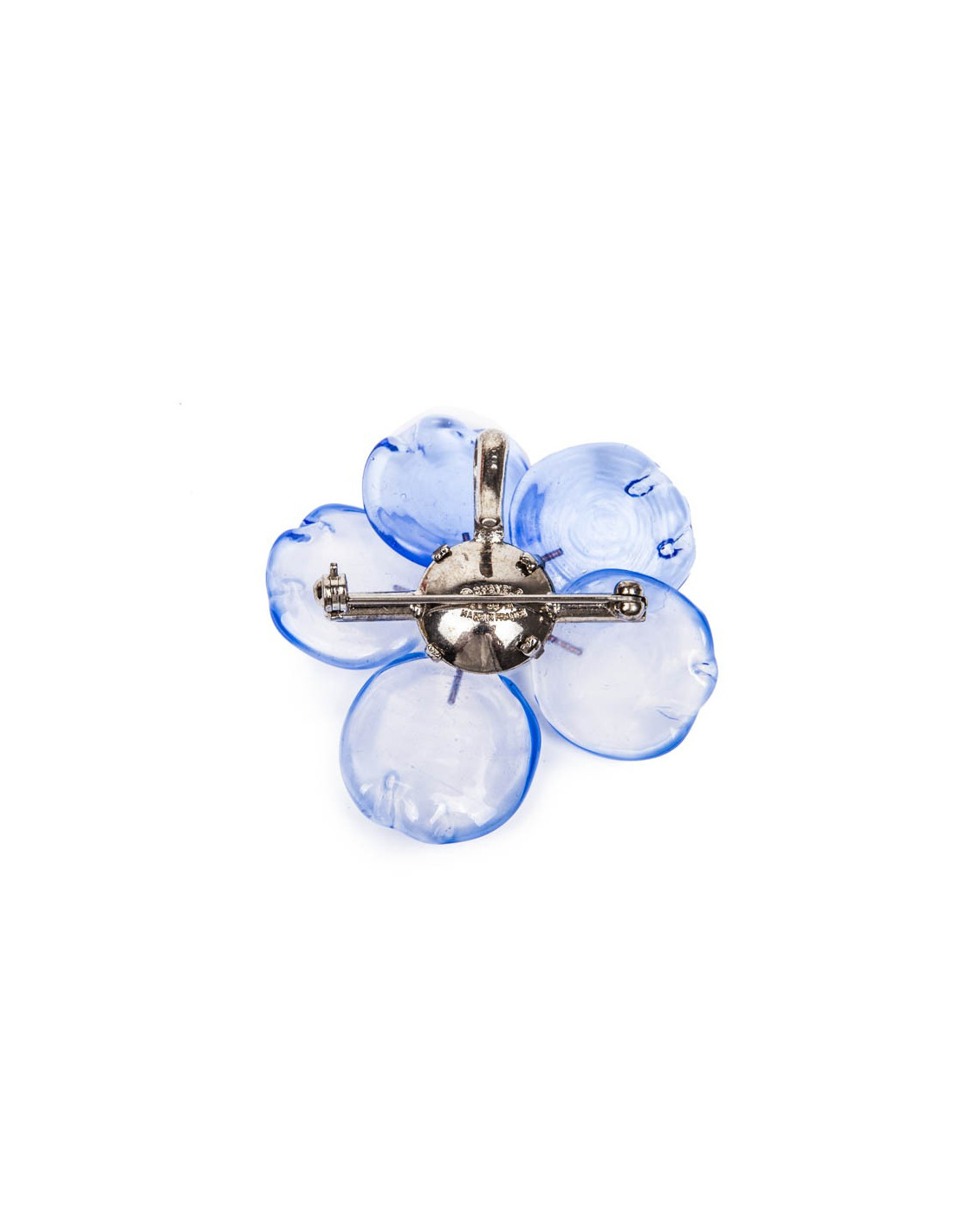 Broche pendentif fleur Chanel en pâte de verre dégradé de bleu avec au centre un bouton blanc mêlé.