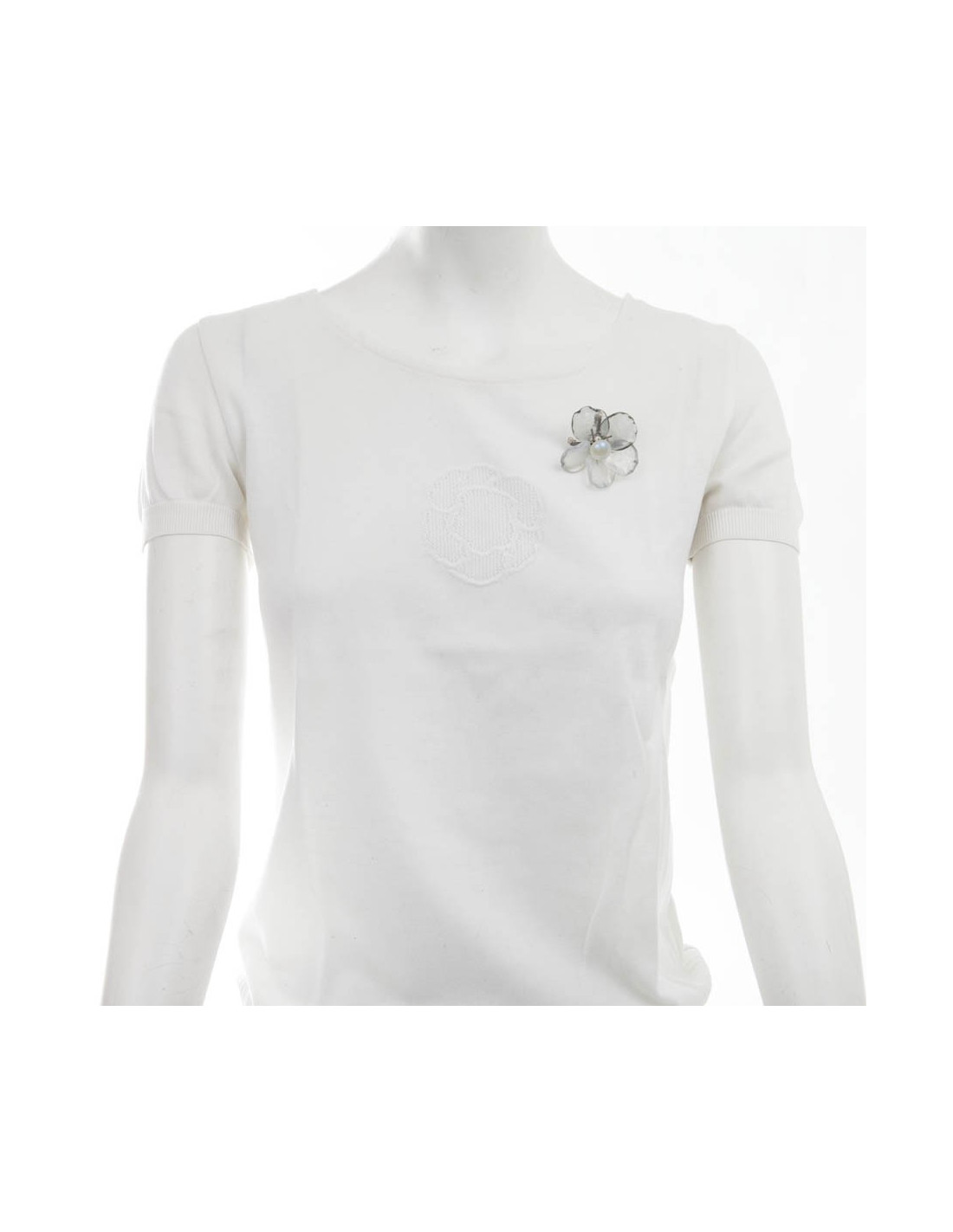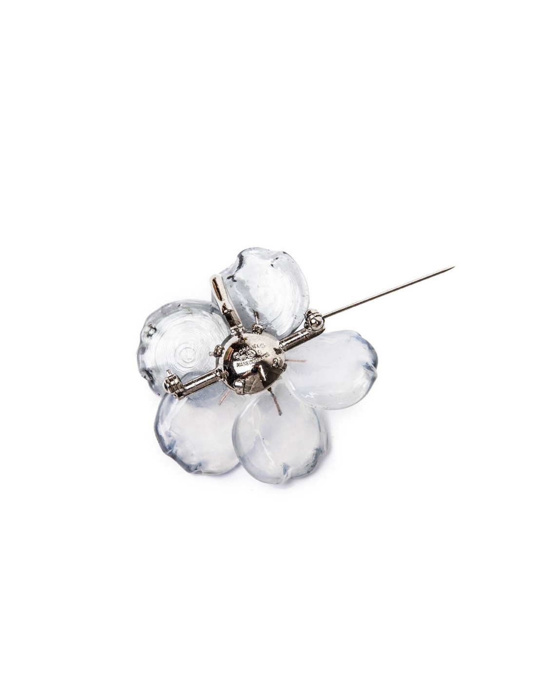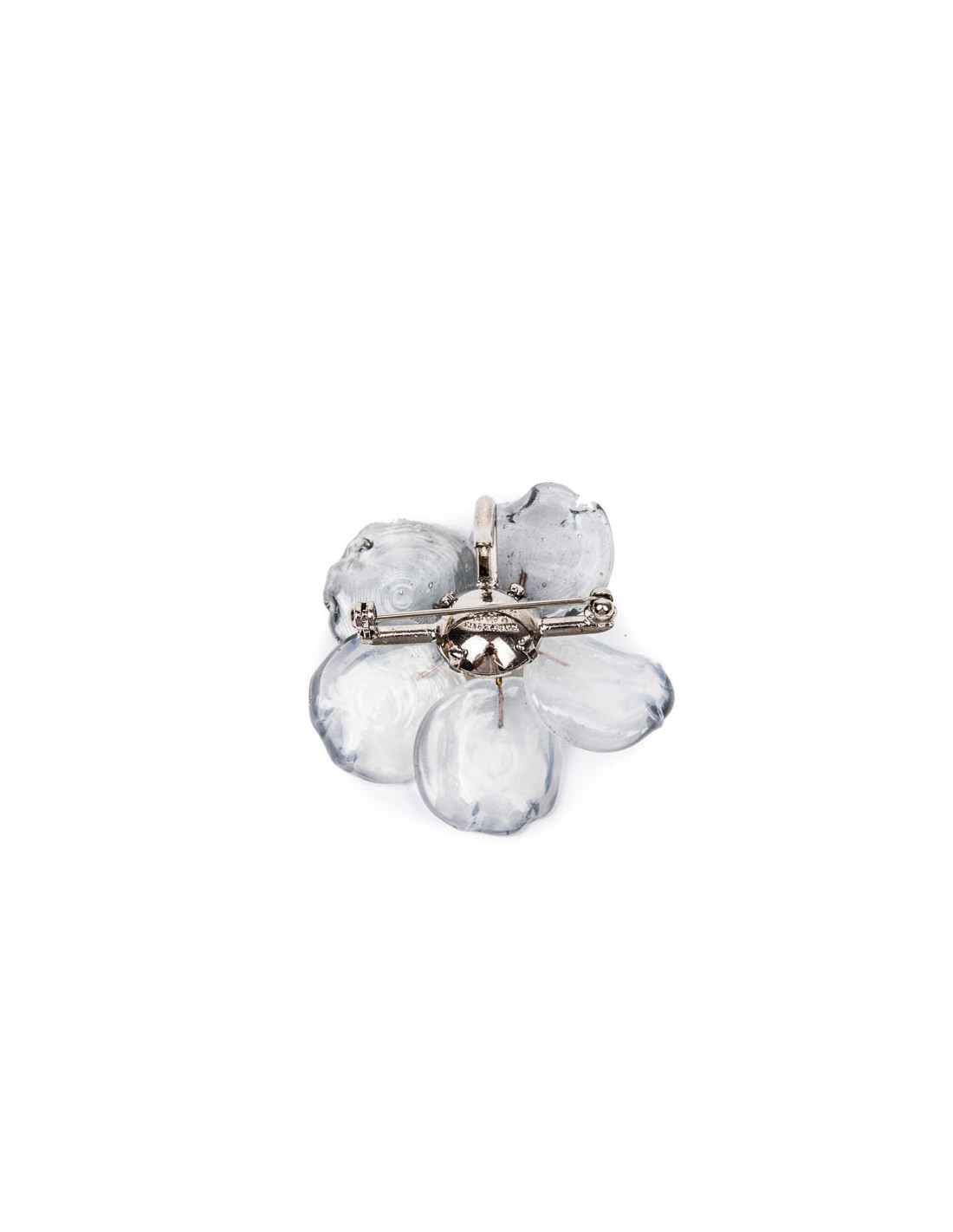 Broche Camélia Chanel en métal argenté et pâte de verre transparente bleu pâle et vert d'eau.