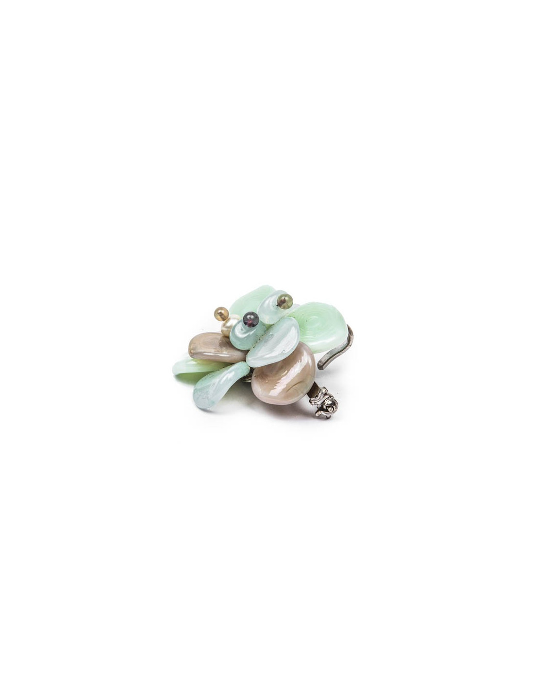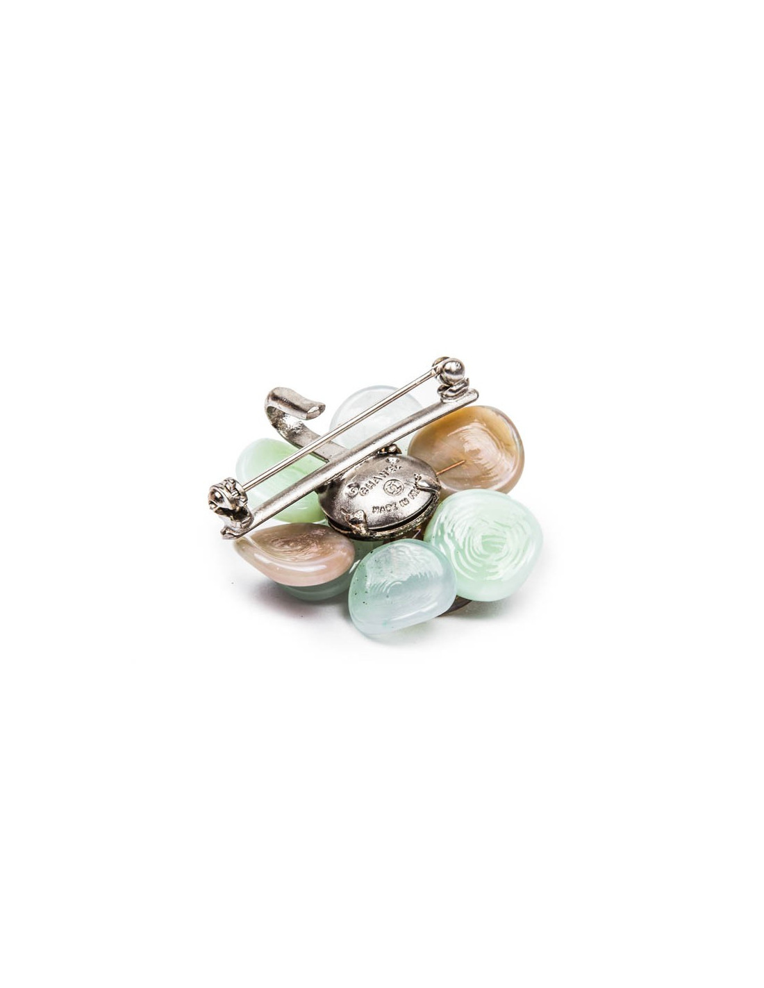 Broche Camélia Couture Chanel des années 80, en pâte de verre tricolore, bleu, vert et beige monté sur métal argent. Vintage.
