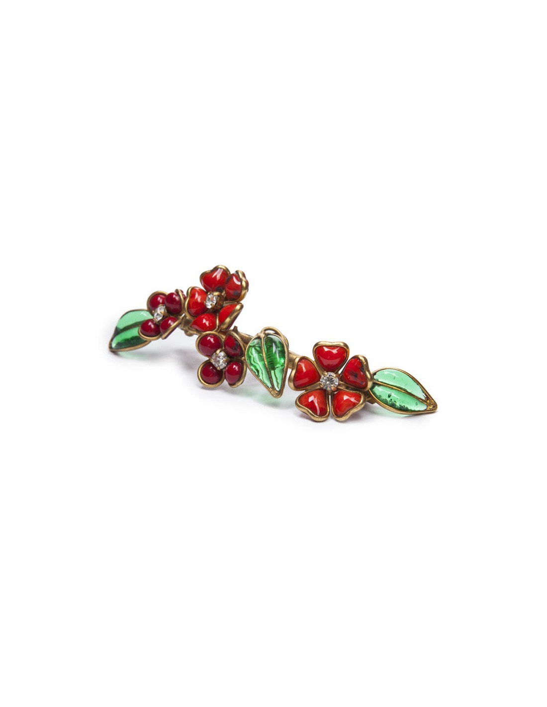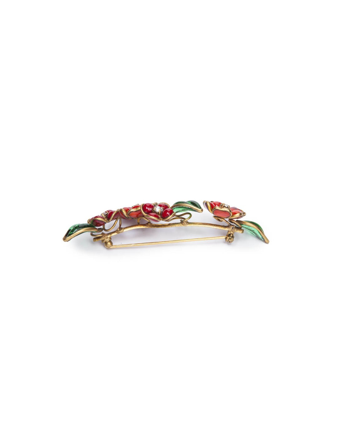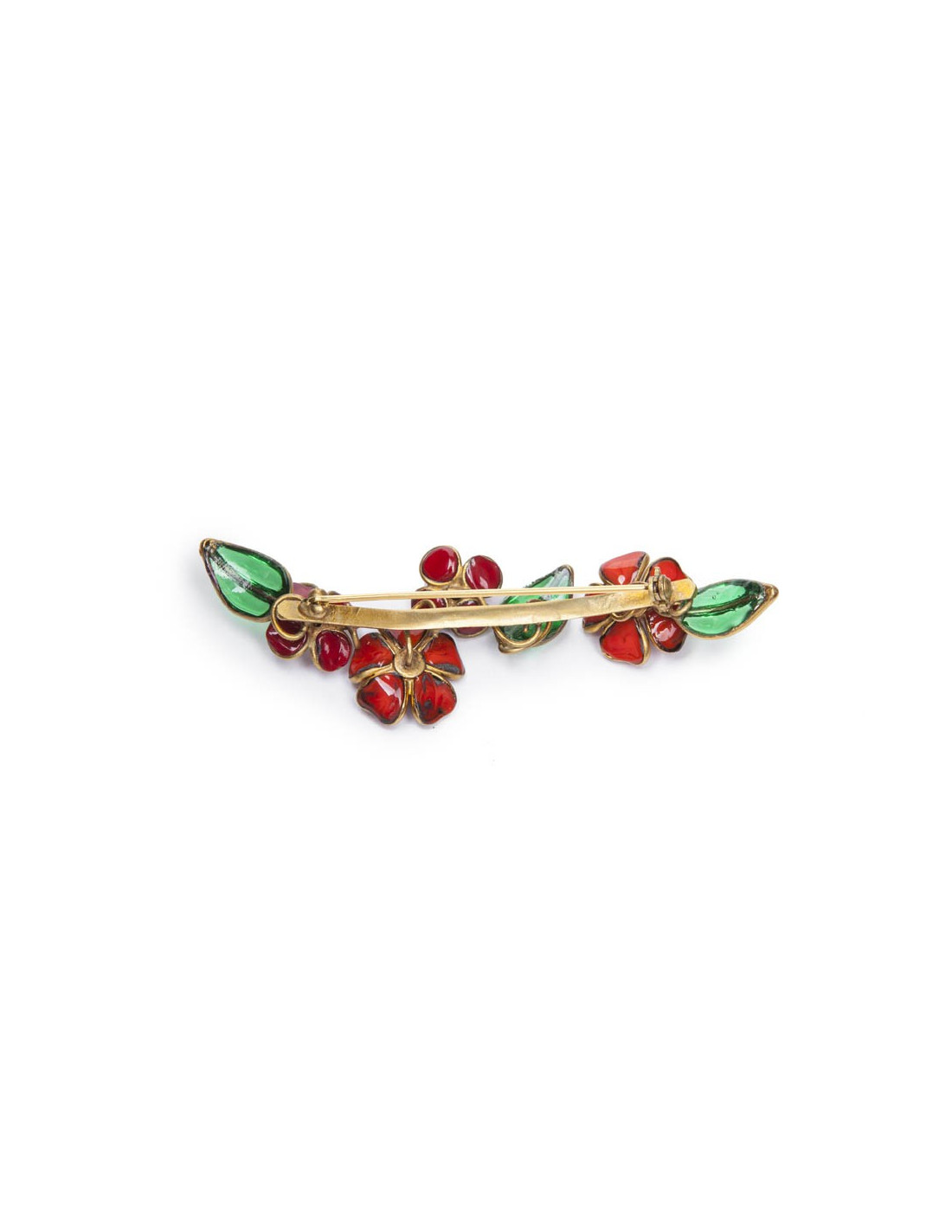 Broche fleurettes Marguerite de Valois, en métal doré et pâte de verre orange, rubis et vert émeraude. Chaque fleur a au centre un brillant Swarovski.