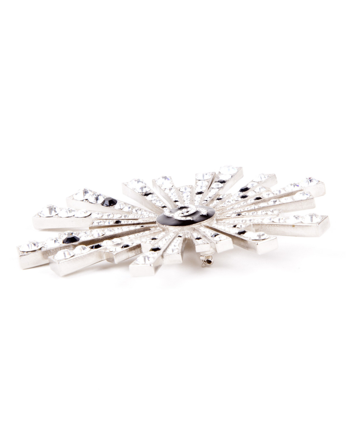 Imposante broche comète pendentif Chanel, pavée de cristaux argent et noir. Bijouterie argent mat. Au centre double C sur un fond émaillé noir.