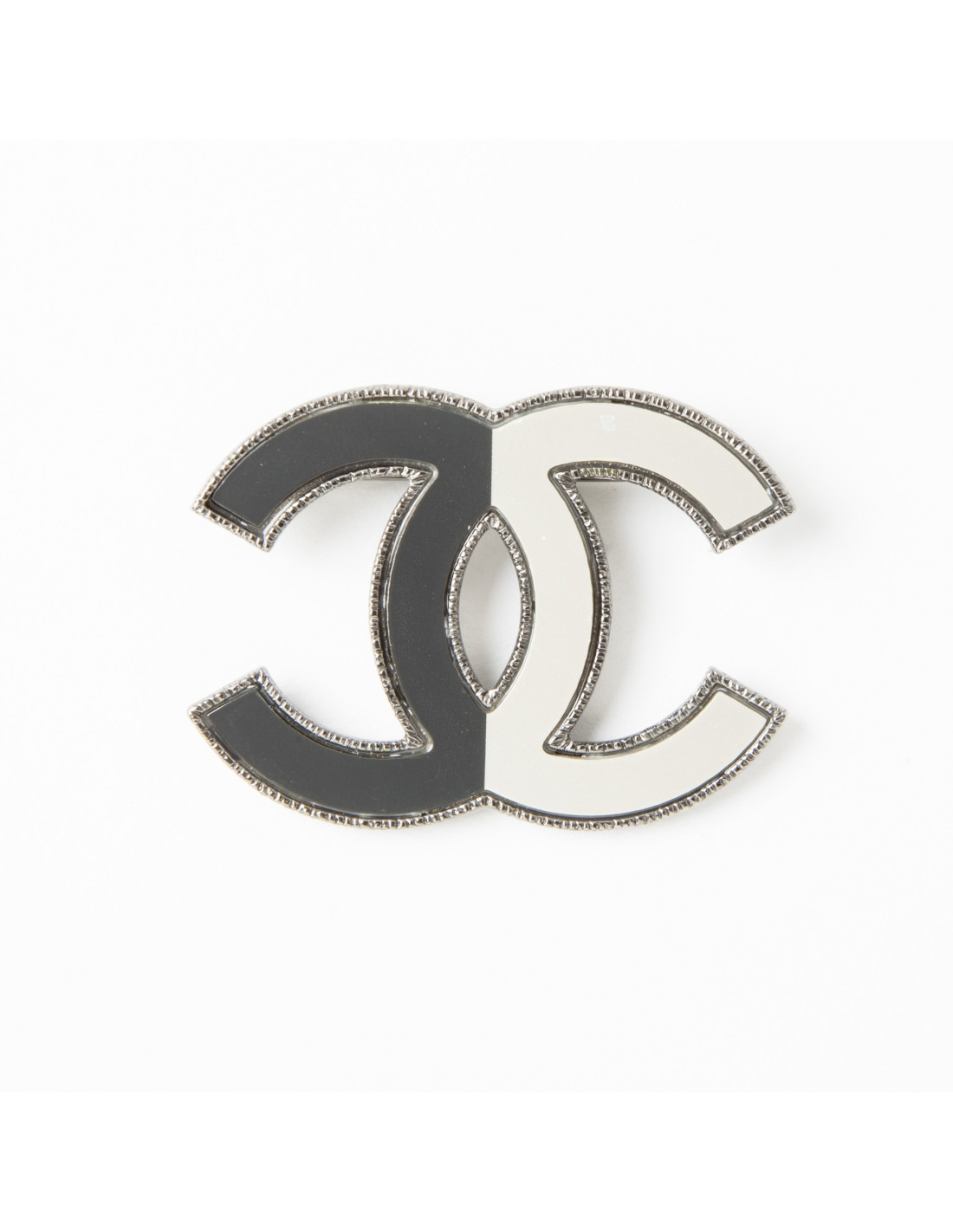 Broche Chanel CC en métal ruthénium bicolore gris et beige. En très bon état. Infime trace sur le beige.