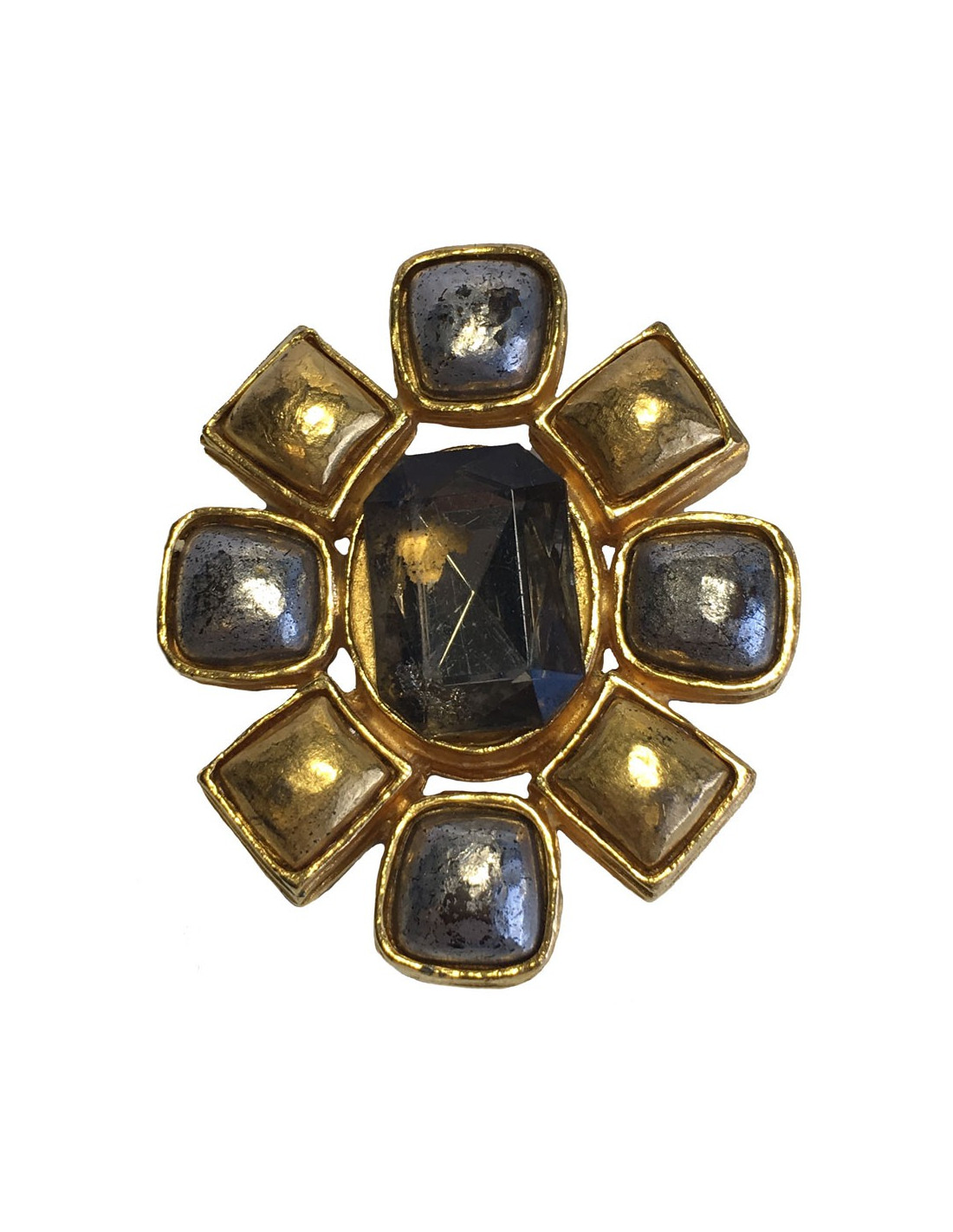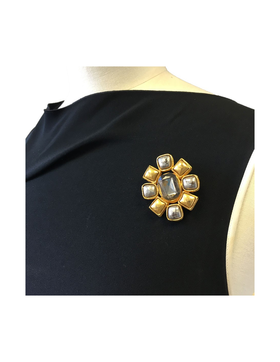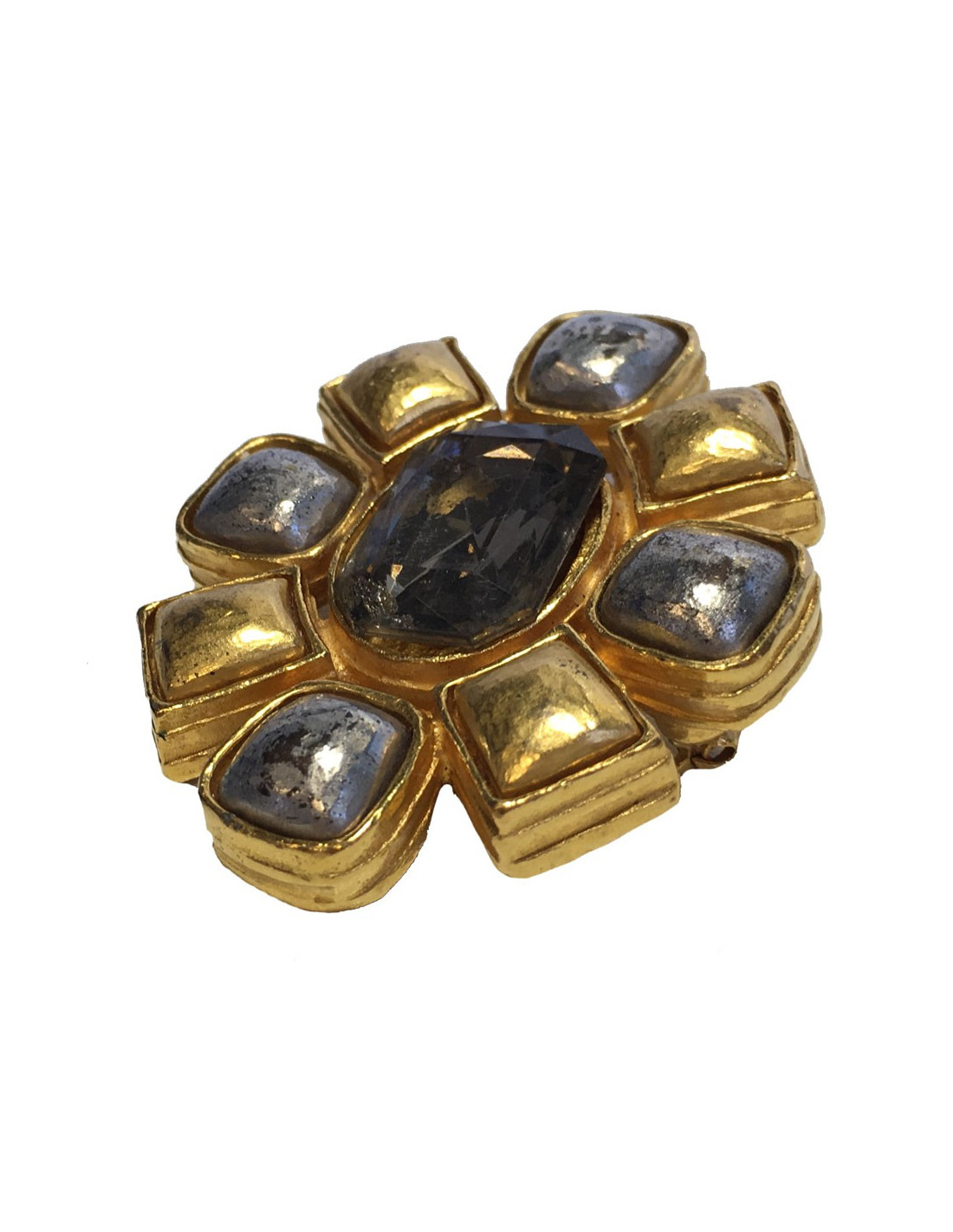 Vintage, broche Chanel en métal doré et argenté. un strass transparent se trouve au centre du bijou.