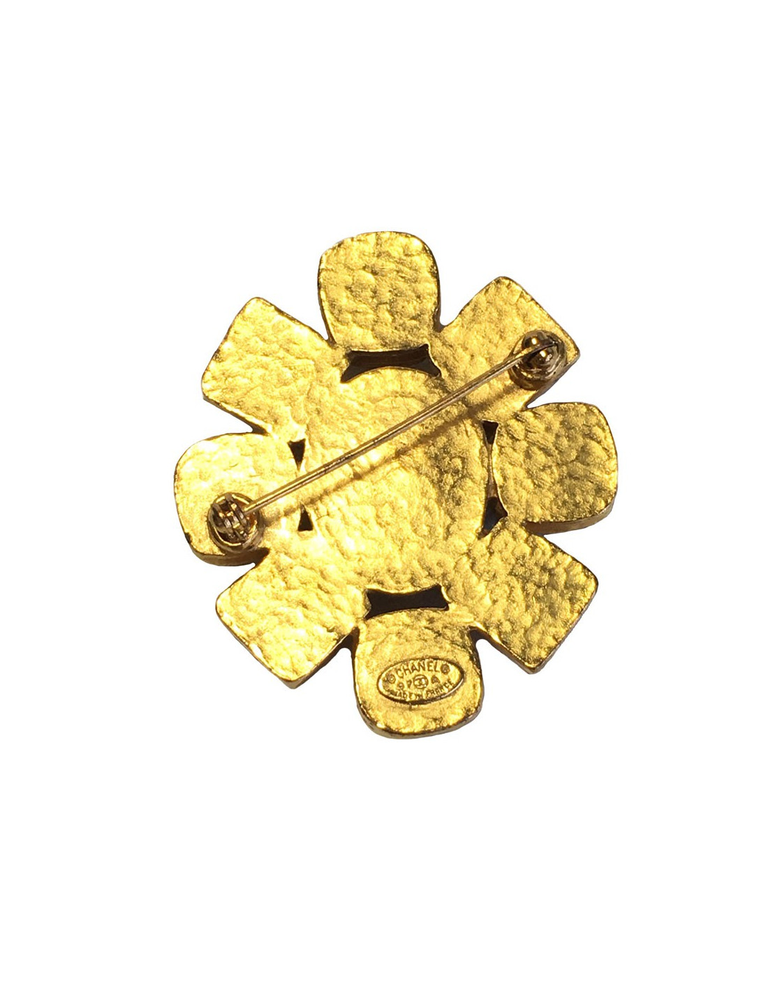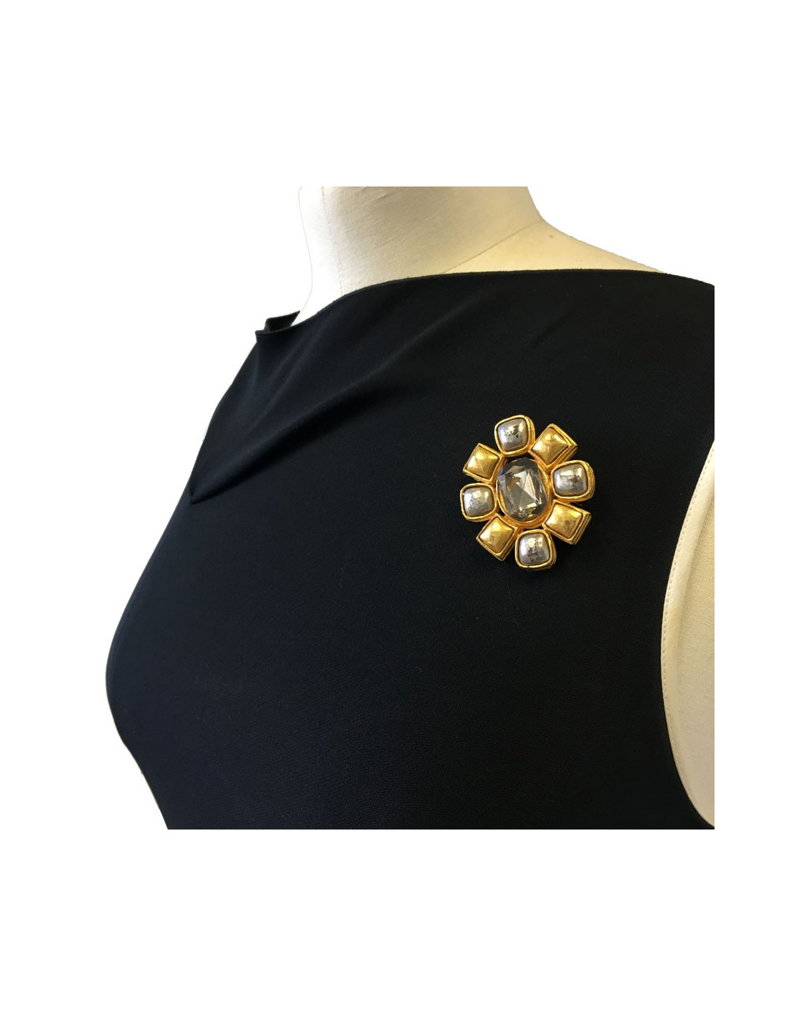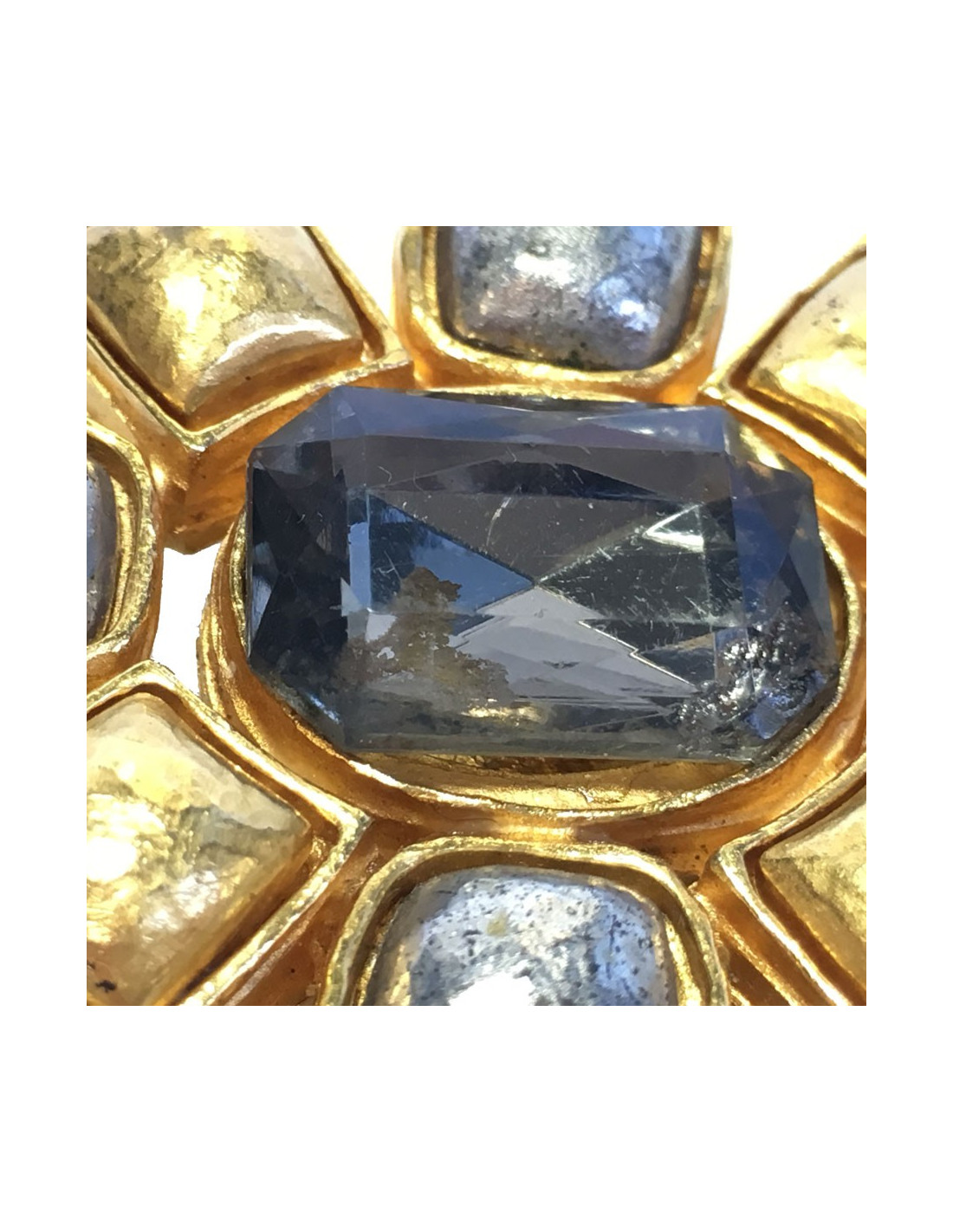 Vintage, broche Chanel en métal doré et argenté. un strass transparent se trouve au centre du bijou.