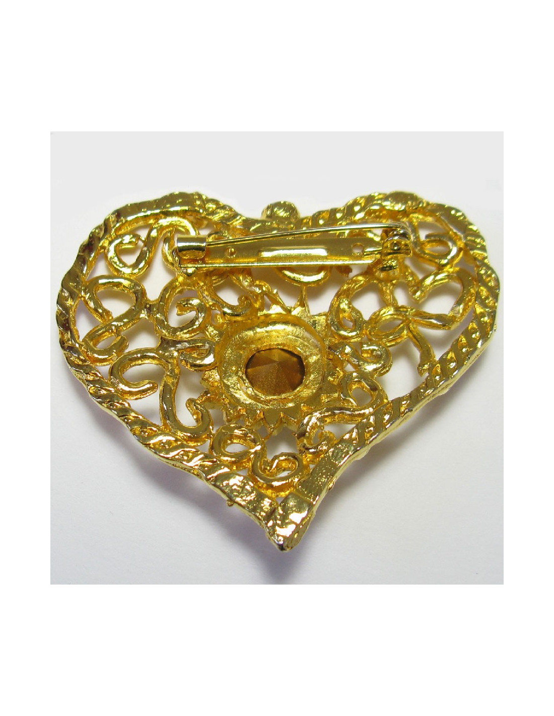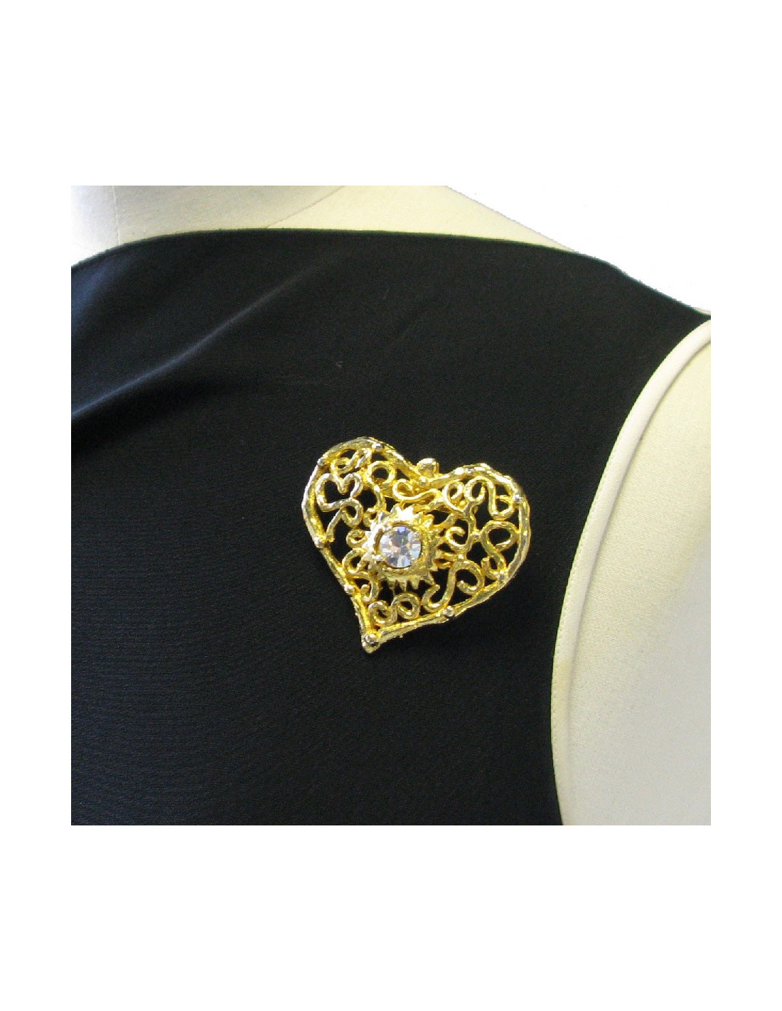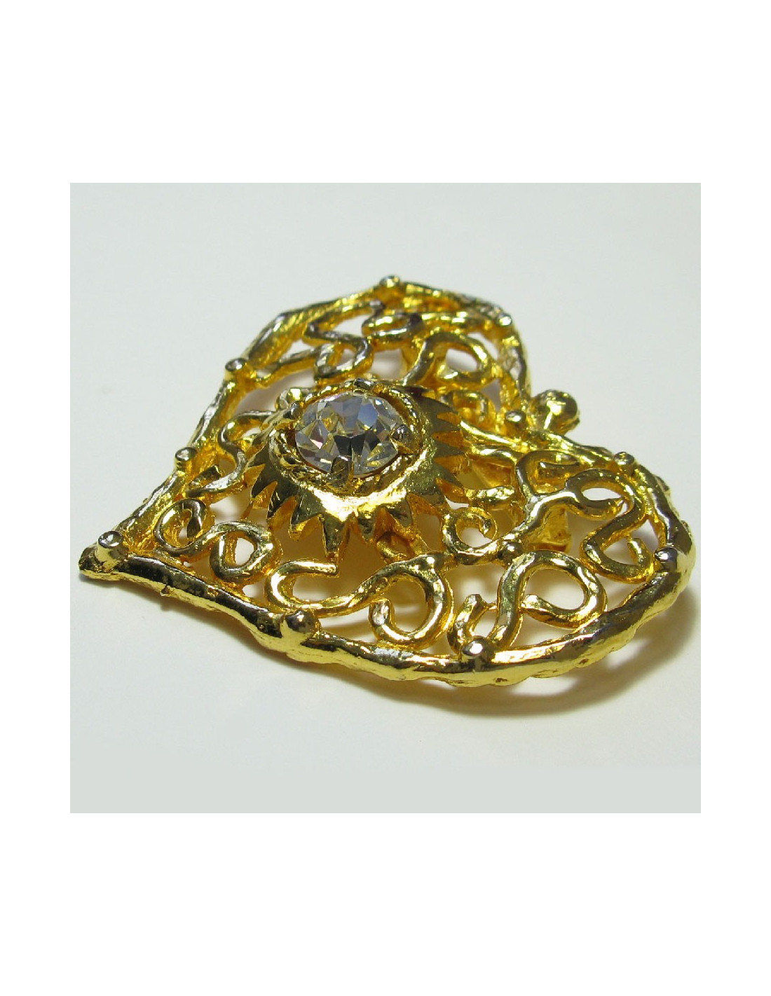 Broche CHRISTIAN LACROIX vintage coeur en métal doré serti d'un grand strass blanc au centre