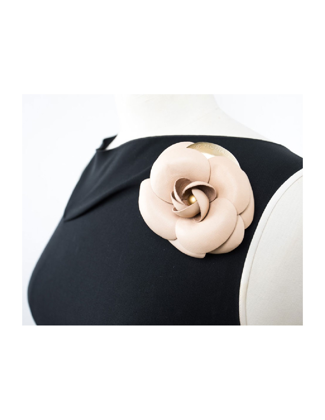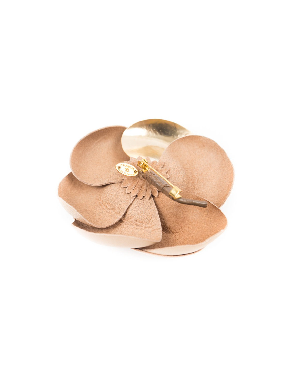 Broche CHANEL camélia cuir beige et métal doré