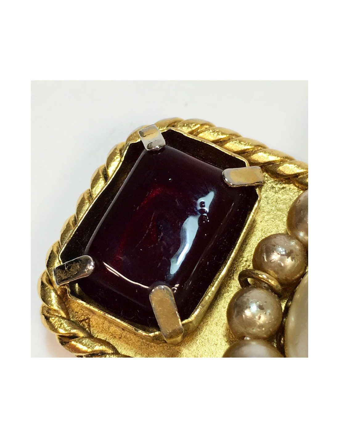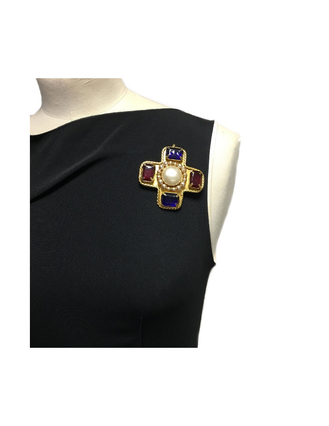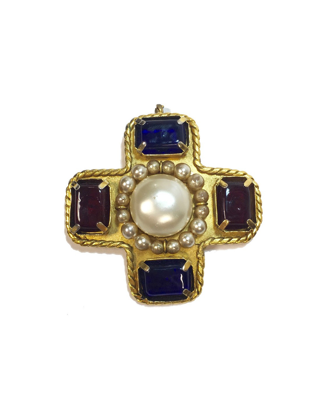 Broche Chanel couture en métal doré en pâte de verre bleu saphir et rubis et perles nacrées (quelques traces sur les perles, la nacre est enlevée par endroit : voir photo).