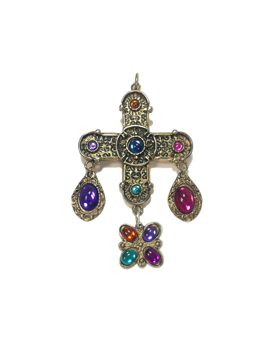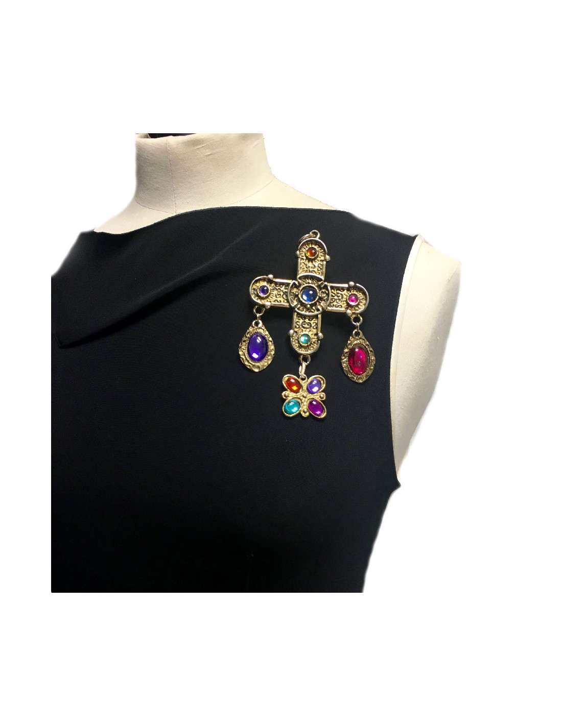 Broche Chanel pendentif croix non signée en métal doré et pierres fantaisies multicolores.
