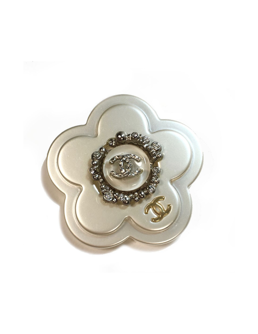 Broche CHANEL camélia blanc nacré, strass et CC